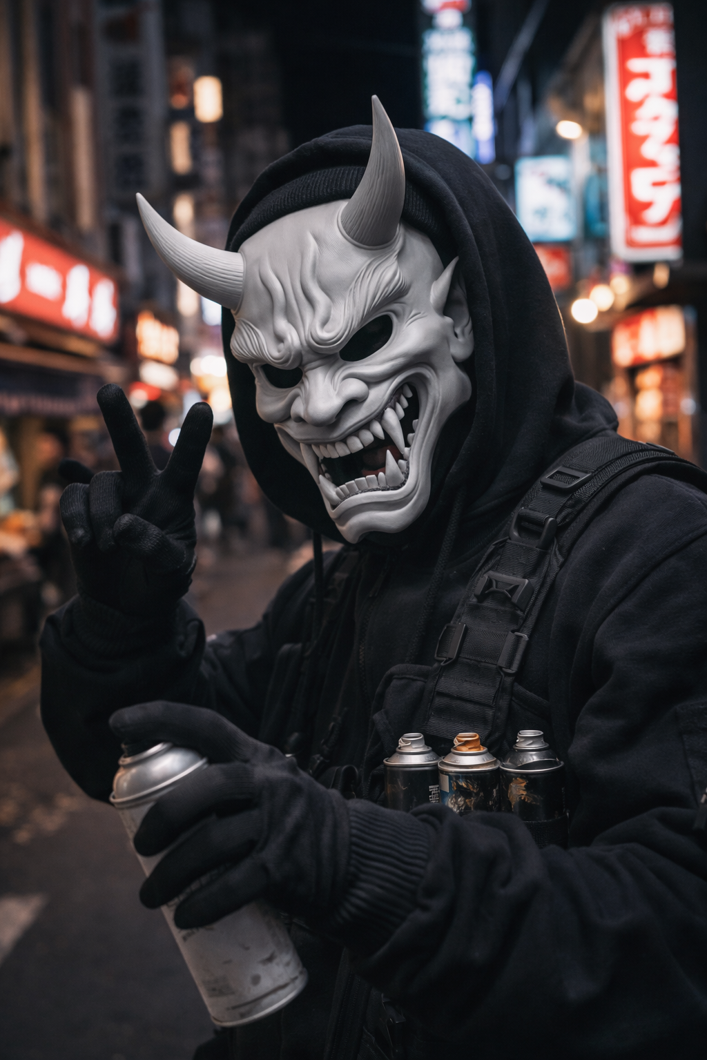 mặt nạ oni,mặt nạ hannya,mặt nạ quỷ Nhật Bản,quỷ oni,truyền thuyết dân gian Nhật Bản,mặt nạ street art,mặt nạ urban art,mặt nạ nghệ sĩ graffiti,mặt nạ cyberpunk,streetwear châu Á,mặt nạ lễ hội,mặt nạ cosplay,mặt nạ wearable,mặt nạ in 3D,mặt nạ resin,mặt nạ sưu tầm,mặt nạ nghệ thuật,nhiếp ảnh urban,aesthetic thành phố neon,oni hiện đại,mặt nạ Nhật Bản truyền thống,mặt nạ khuôn mặt quỷ,nghệ sĩ đeo mặt nạ,nhiếp ảnh đường phố ban đêm,văn hoá đường phố,mặt nạ handmade,mặt nạ tạo điểm nhấn,phong cách art toy,cosplay urban