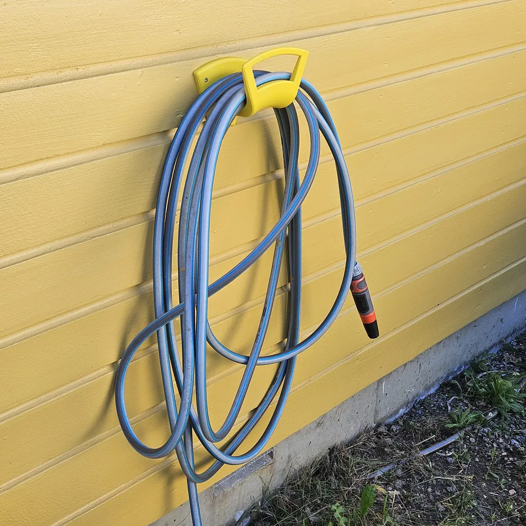 Giá treo ống nước làm vườn gắn tường, thiết kế để in nằm nghiêng nên thường không cần supports. Có 4 phiên bản lỗ bắt vít (nghiêng/thẳng/dọc) và bản STEP không lỗ để tùy chỉnh.