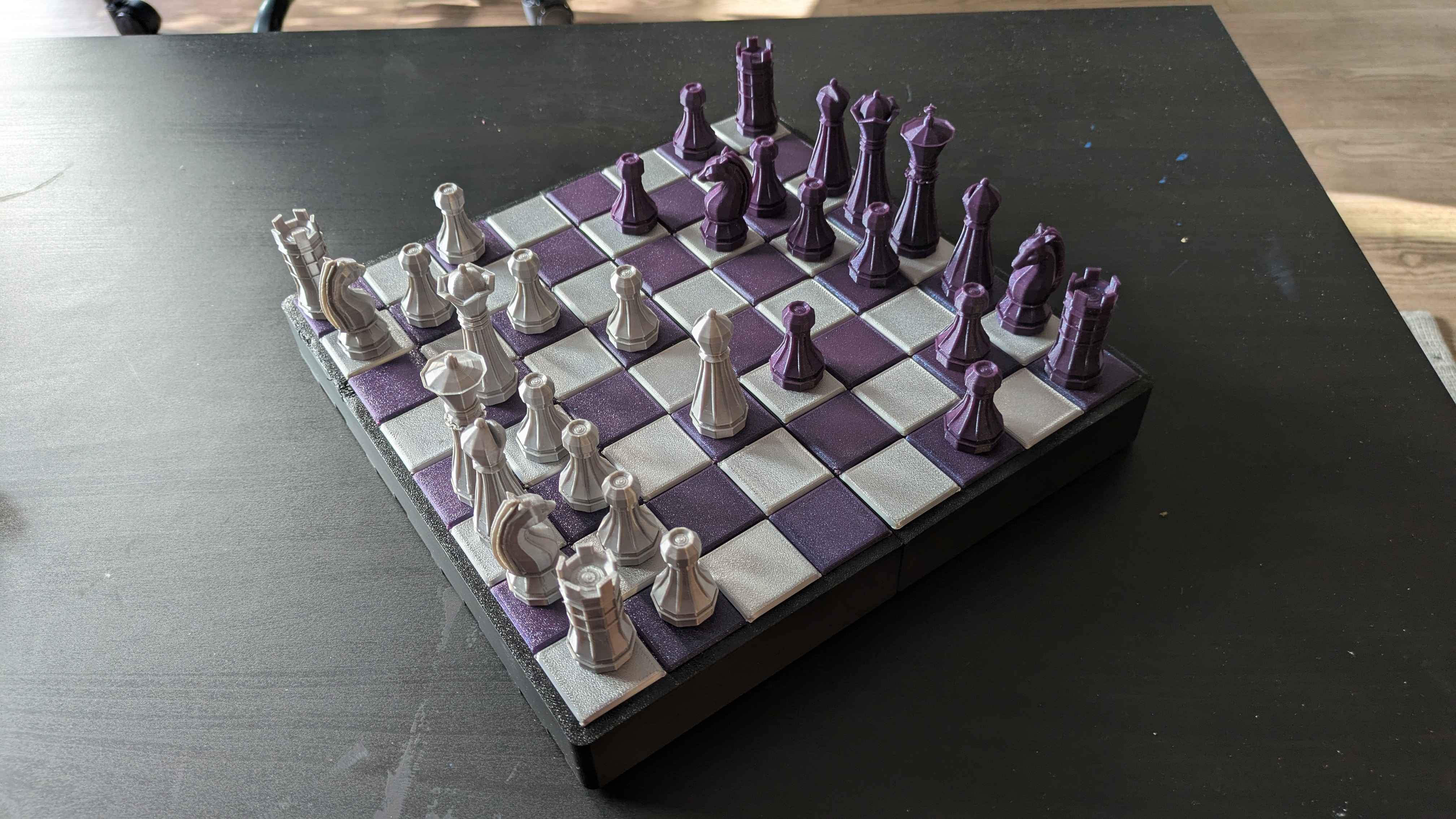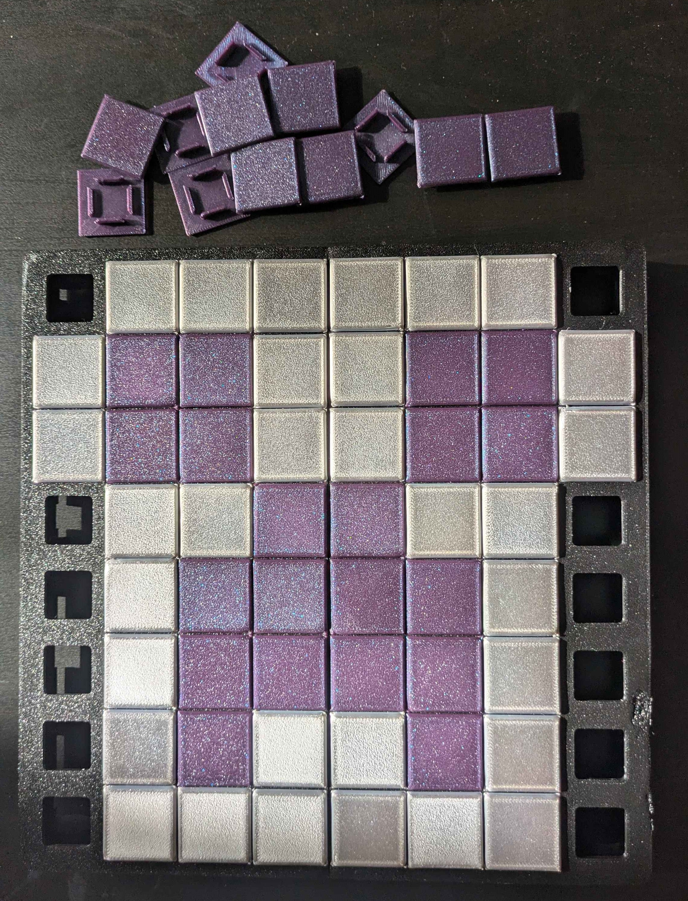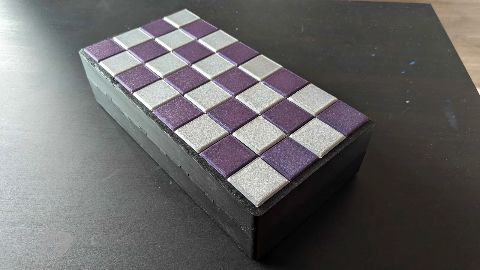 Mẫu bàn cờ gập dạng hộp print-in-place kiêm bảng pixel art 8x8, có 64 khe cắm tile nhấn vào. Kích thước bàn 250.2×250×33.2 mm, tile 29.5×29.5×5.75 mm; in 0.2mm và có thể gắn nam châm để giữ hộp đóng kín.
