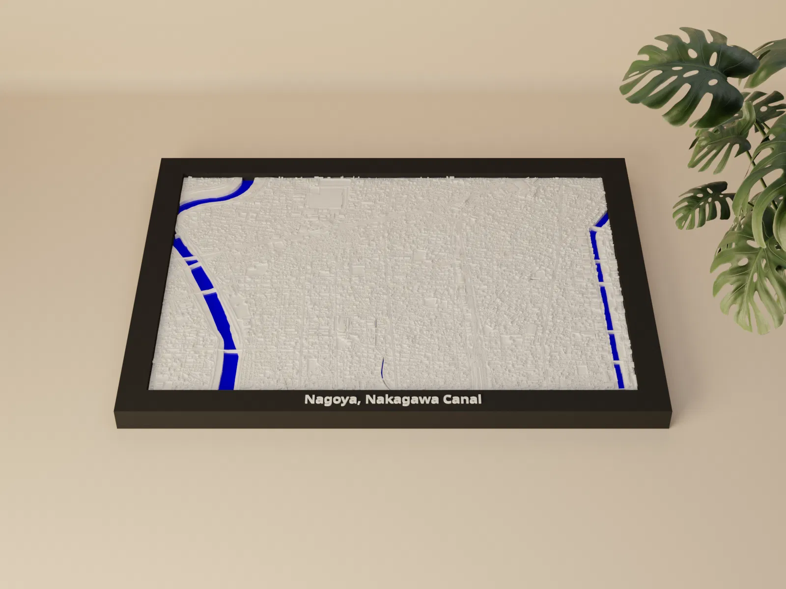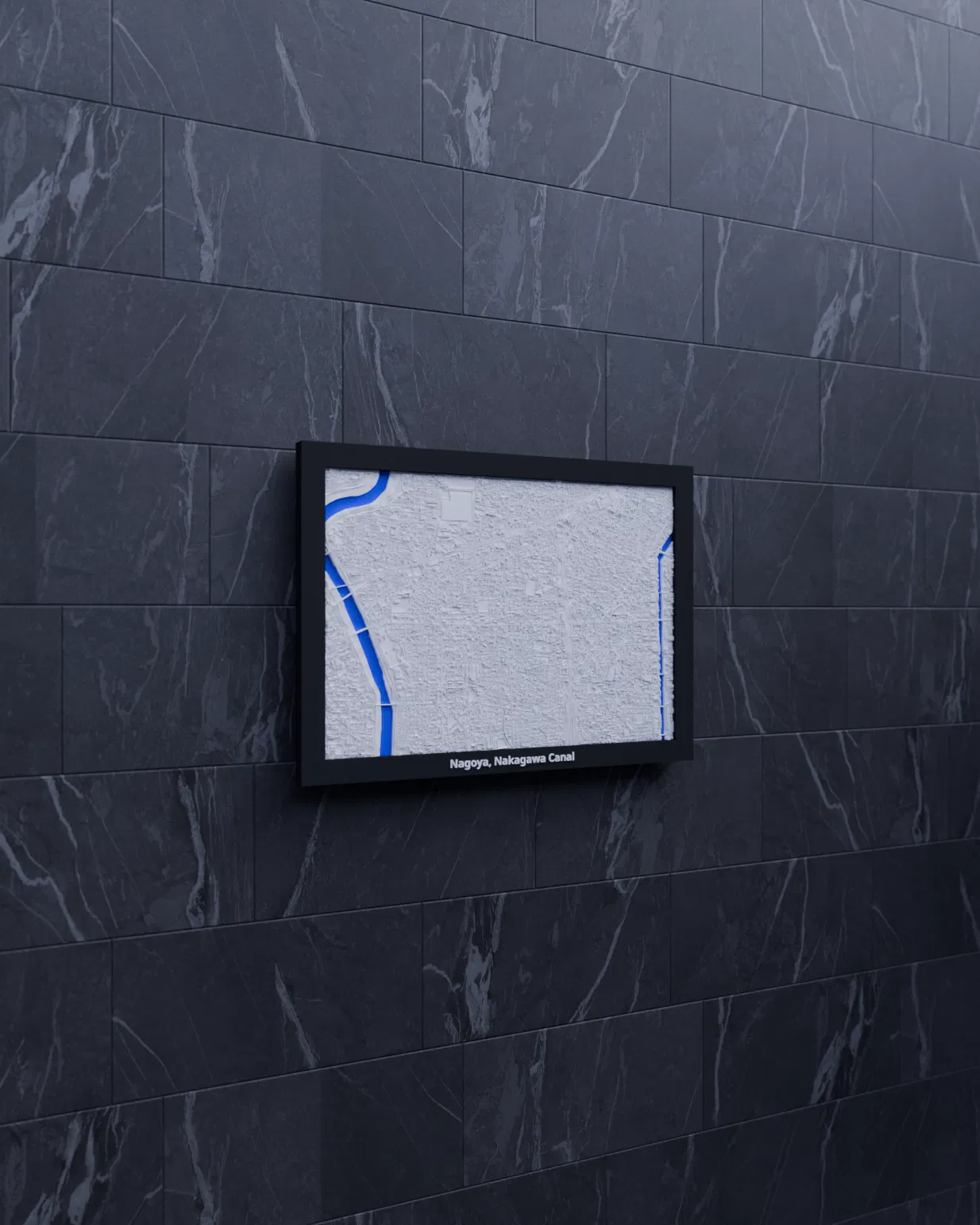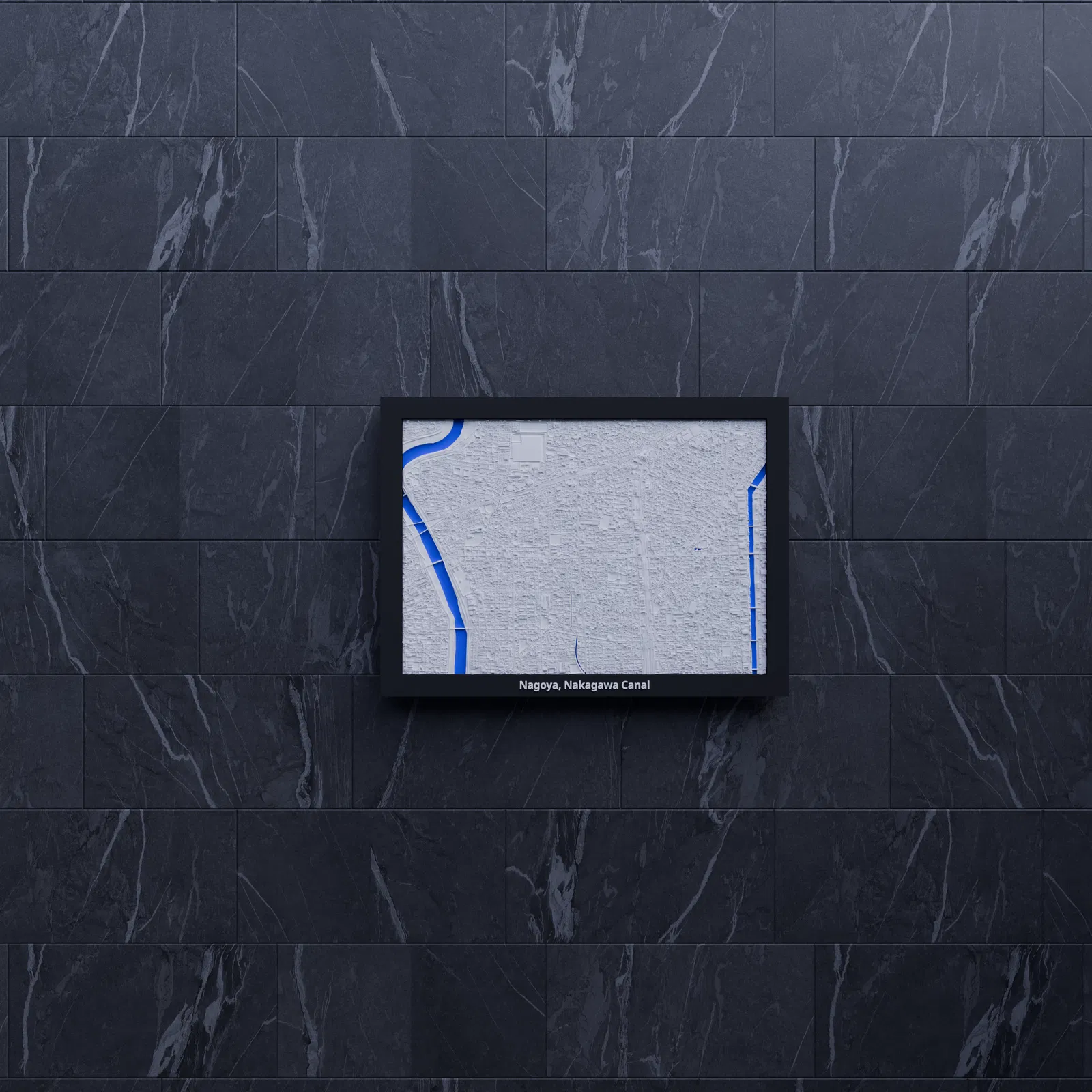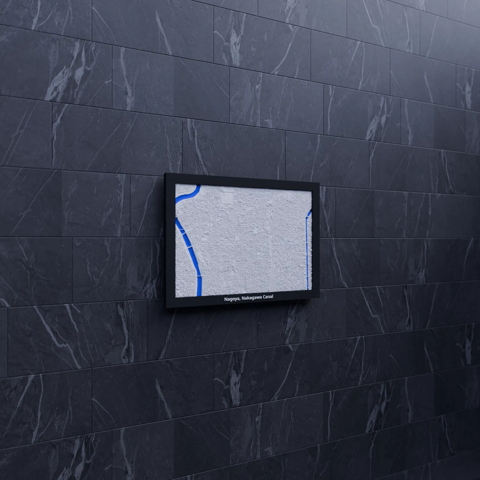Bắt trọn cảnh quan Nagoya và kênh Nakagawa với mô hình địa hình thu nhỏ in 3D. Dựng từ dữ liệu địa lý, tỷ lệ ~25155:1, kích thước 170.5 x 119.5 mm, kèm nhiều lựa chọn khung có lỗ treo.
