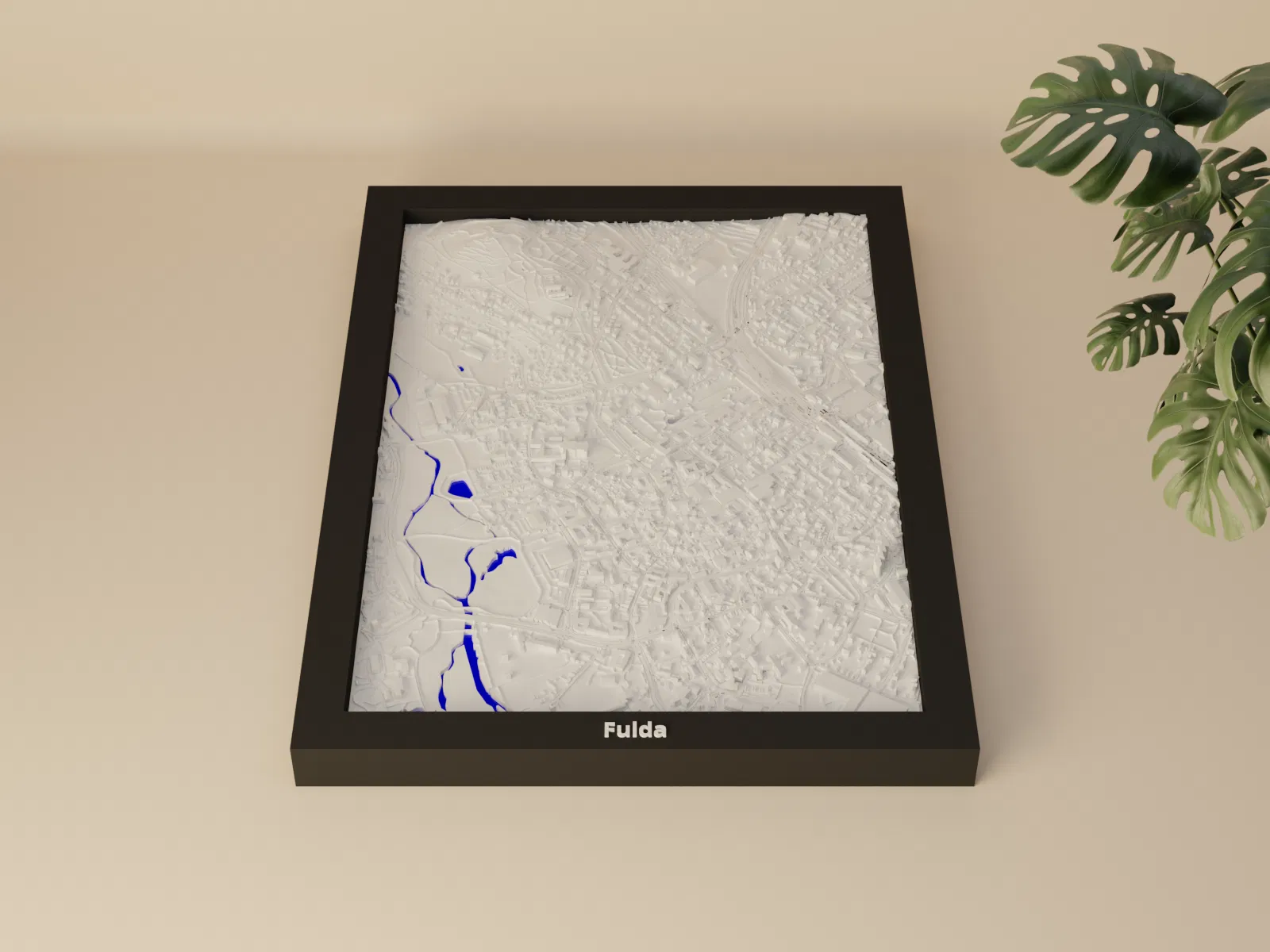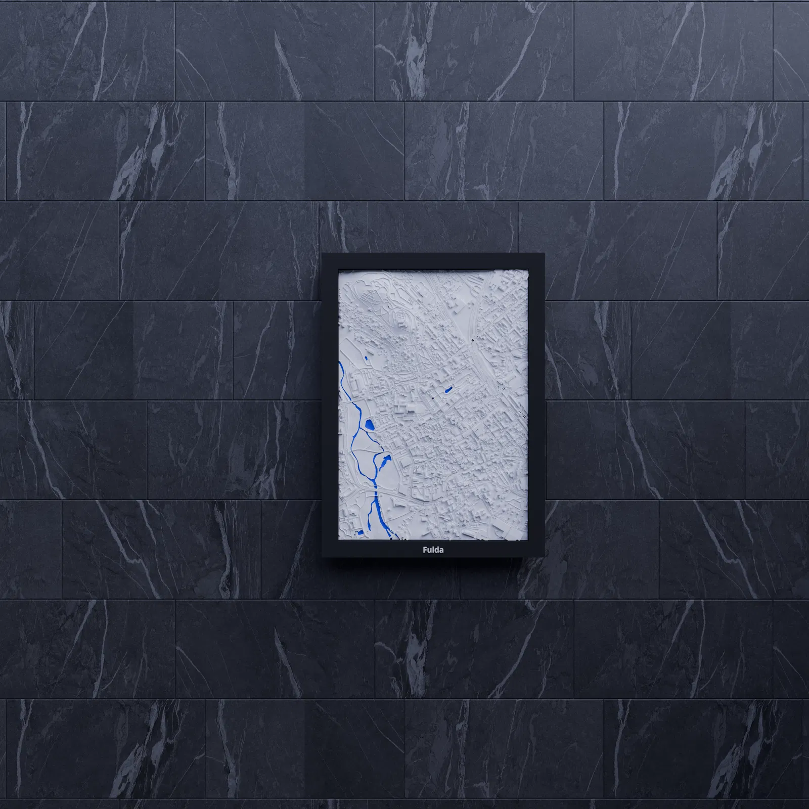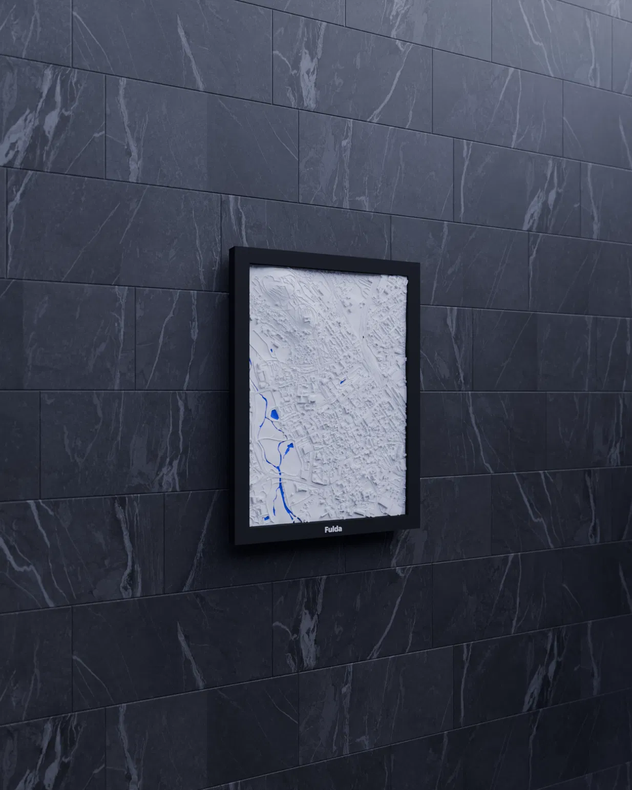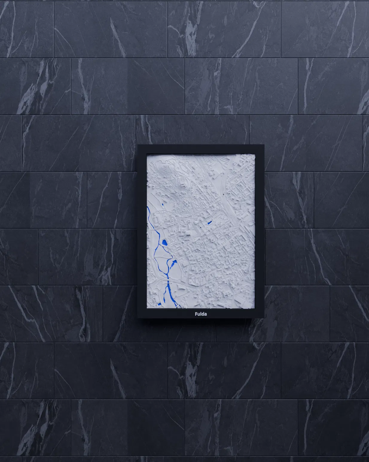 Mô hình mini địa hình topographic in 3D tái hiện Fulda (Đức) theo dữ liệu địa lý thật, thu nhỏ từ khu vực 1.677 km x 2.385 km xuống 119.5 x 170.5 mm. Kèm nhiều khung (frame) có lỗ treo, phù hợp học tập và decor.