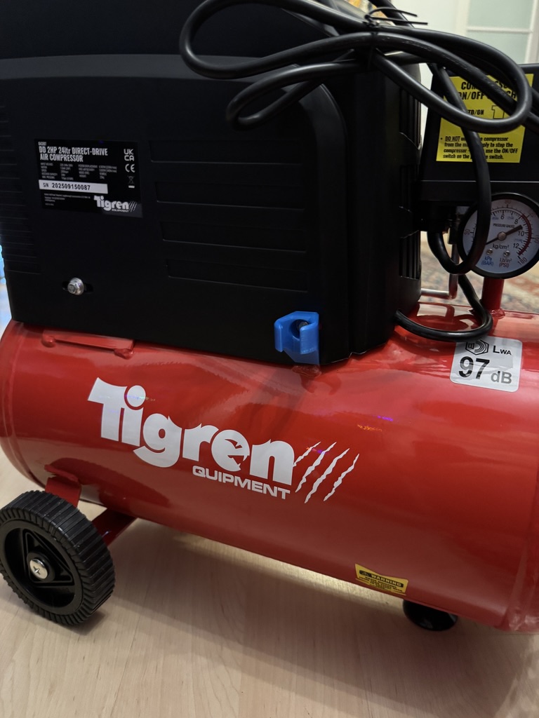 Một giá đỡ dụng cụ để gắn vào lỗ bắt bu-lông của máy nén khí Tigren Quipment. Nhiều khả năng cũng dùng được với đa số máy khác, miễn là đầu fitting của ống là loại tiêu chuẩn.