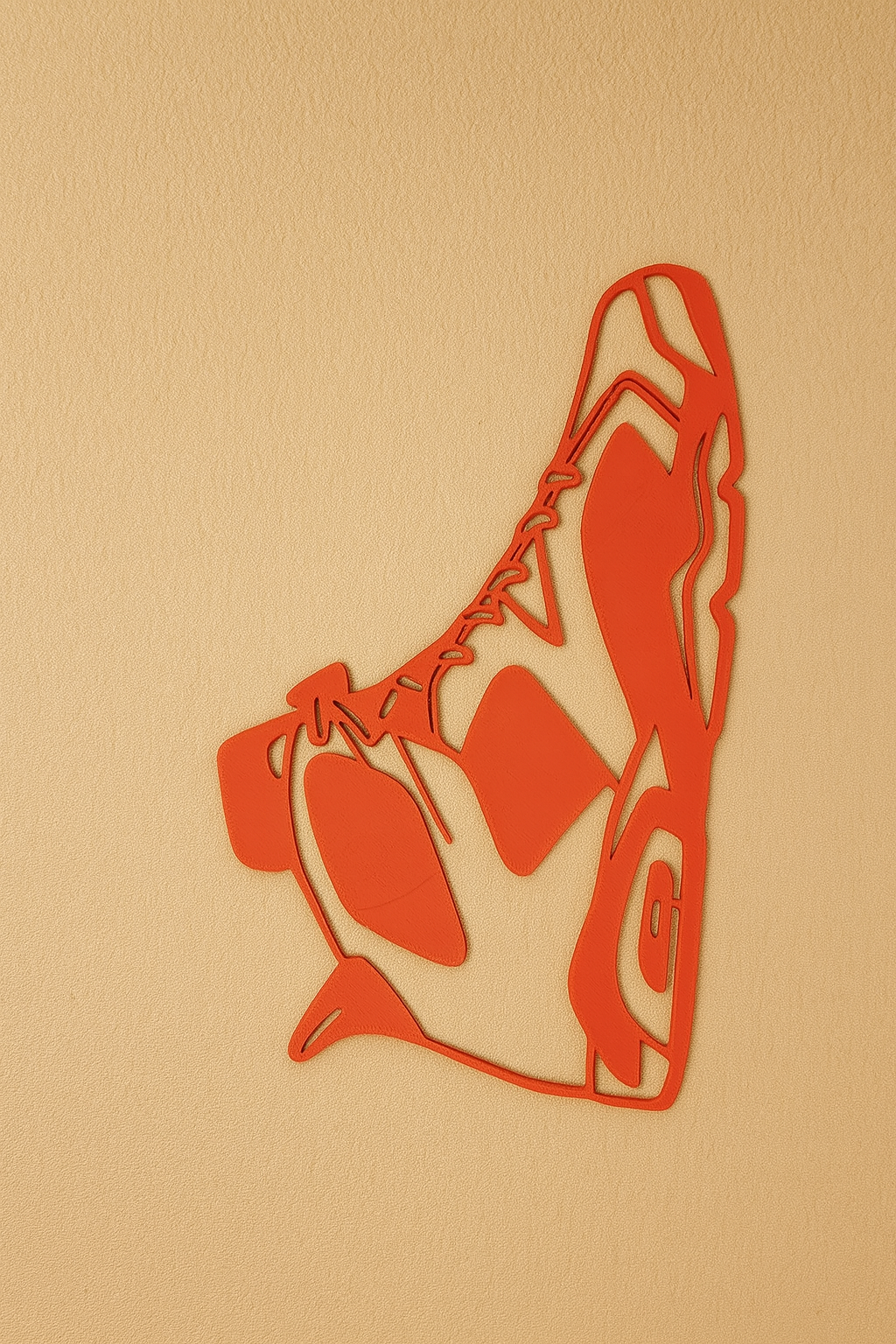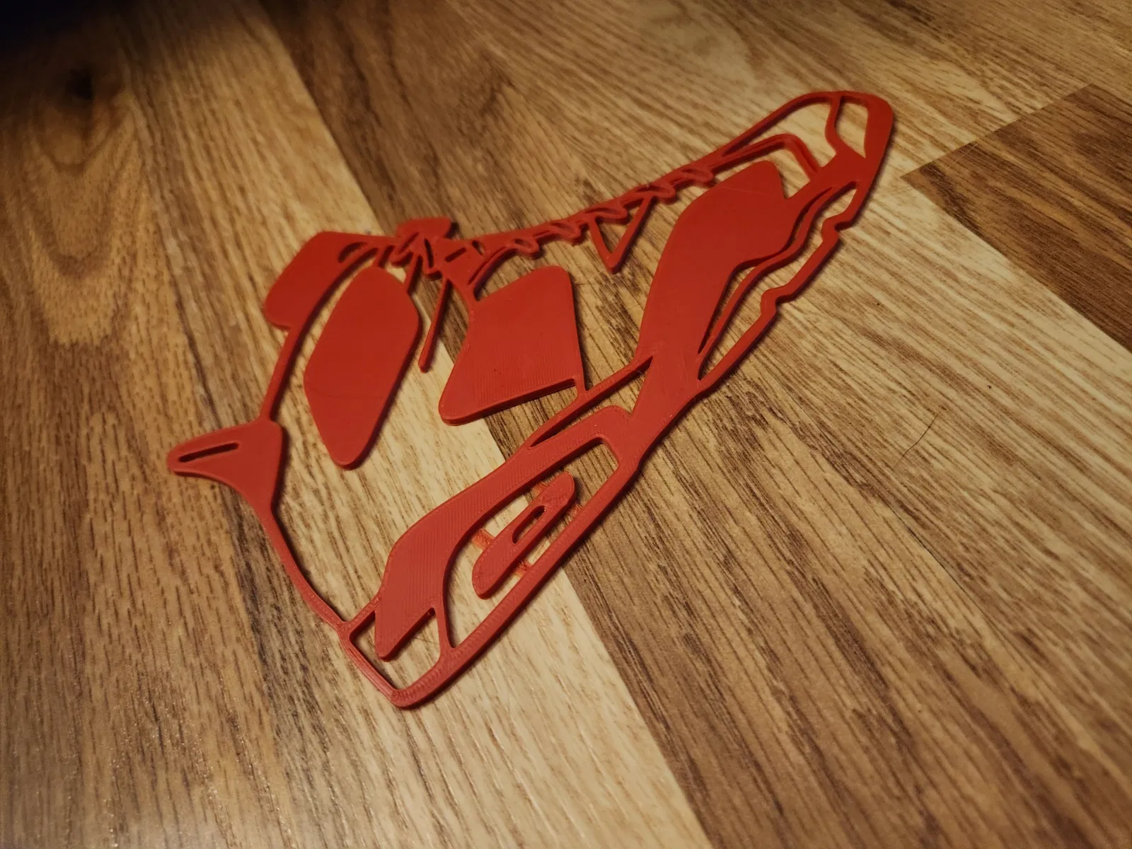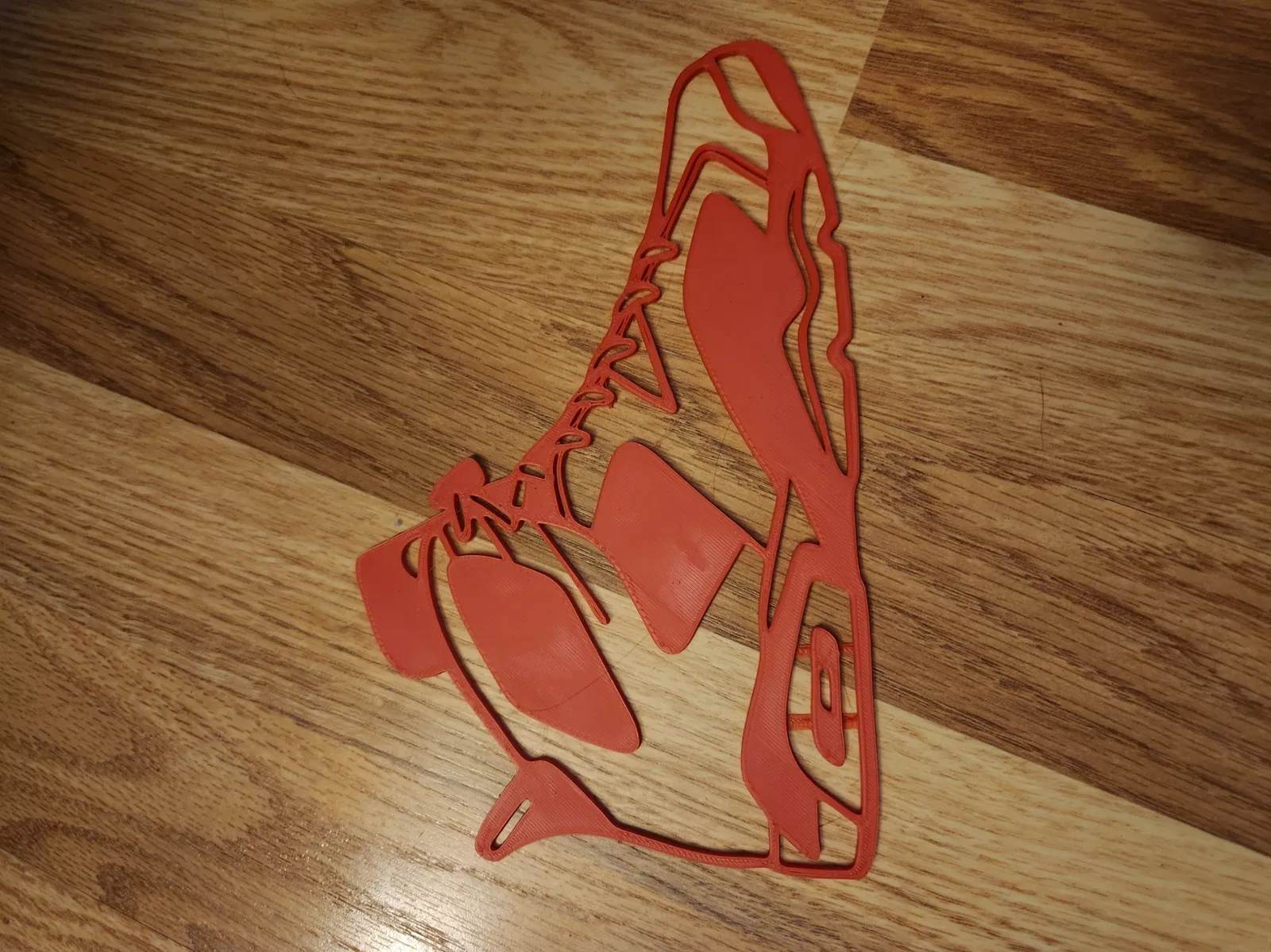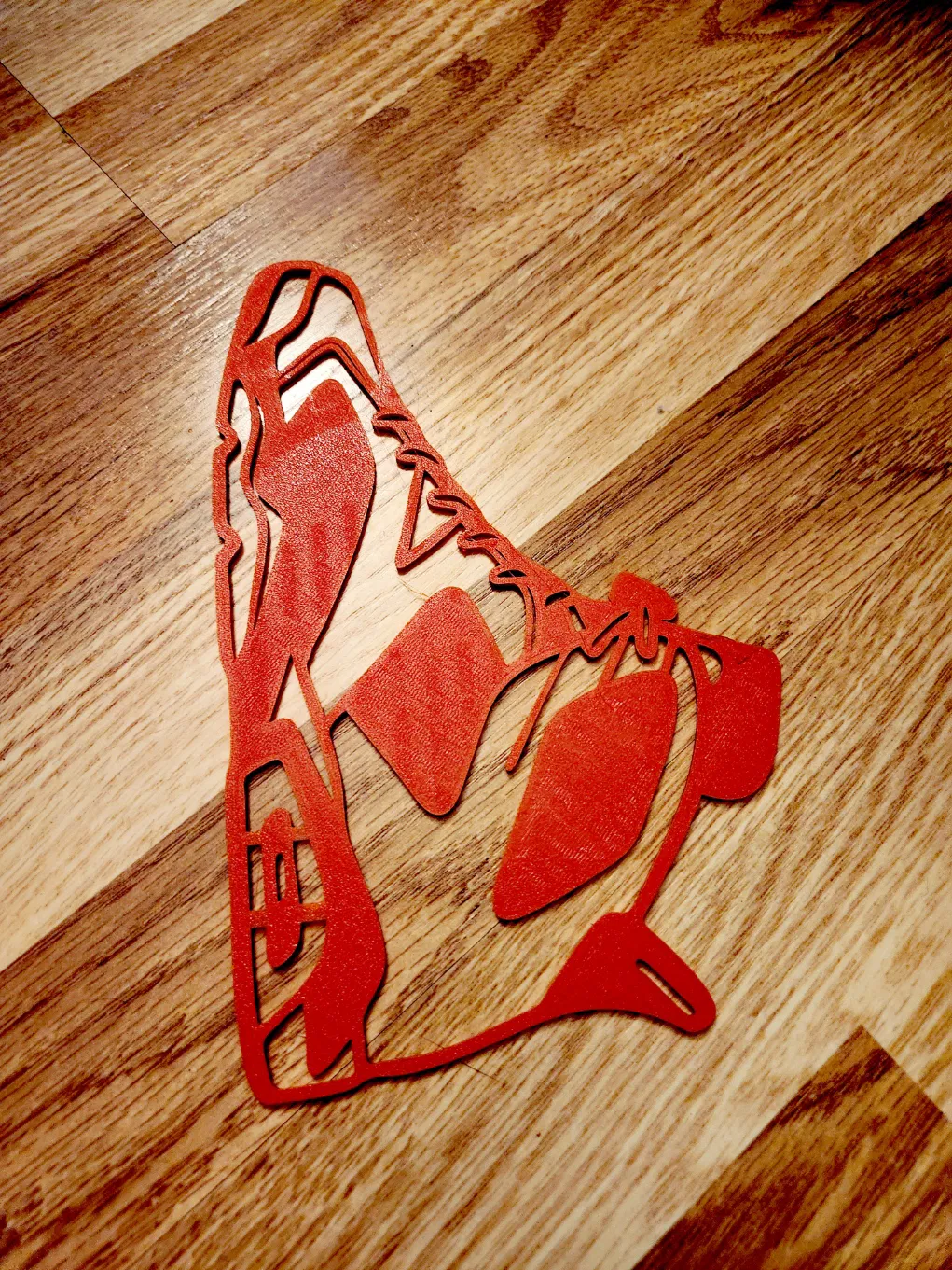 Wall art silhouette Jordan VI (6) theo kiểu viền mảnh, in nhanh và dễ, không cần supports. Phù hợp trang trí phòng sneaker, góc gaming, phòng ngủ hoặc trưng bày shop. Gợi ý layer 0.20 mm, 3 walls, infill 0–15%.