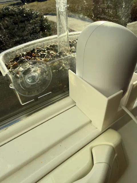 Đế (stand) đặt UniFi Protect G6 Instant sát mặt kính, thiết kế theo biên dạng cửa sổ Marvin Integrity khi tháo lưới. Có thể chỉnh focal distance để quay chim ăn ở máng gắn trên cửa sổ, chỉ cách vài inch.