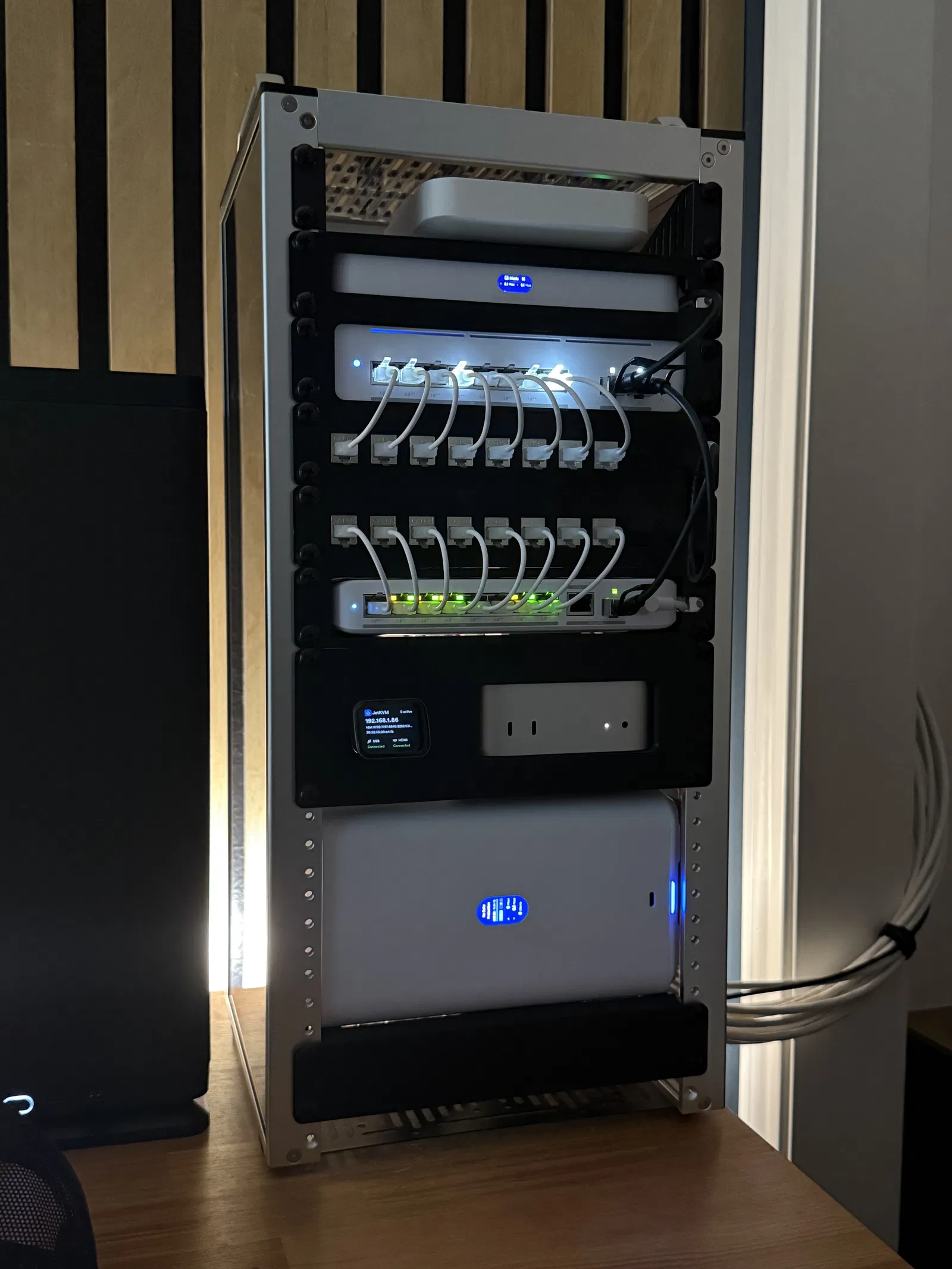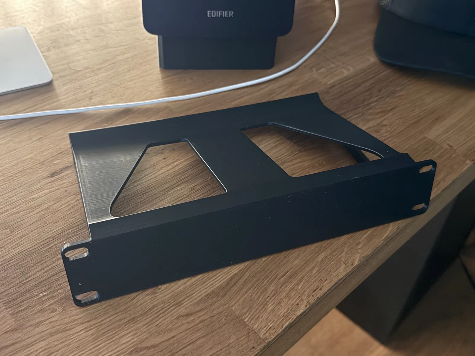 Dù bạn có thể dùng bất kỳ kệ 10 inch nào (lật ngược lại vì UNAS hơi cao hơn bề rộng của thanh rail rack 10 inch), mình muốn có cái gì đó “đúng bài” hơn một chút. Mình thiết kế cái kệ này riêng để đặt UNAS 2 và hạn chế nó trượt qua lại quá nhiều. Nó vẫn chỉ là một cái kệ, không kẹp/chốt cố định NAS chắc chắn, nhưng có phần mép gờ ôm quanh NAS một chút để giữ nó nằm yên. Kệ cũng chỉ sâu đúng mức cần thiết — mình có thiết bị khác ở phía sau nên kệ loại sâu tiêu chuẩn sẽ bị vướng.