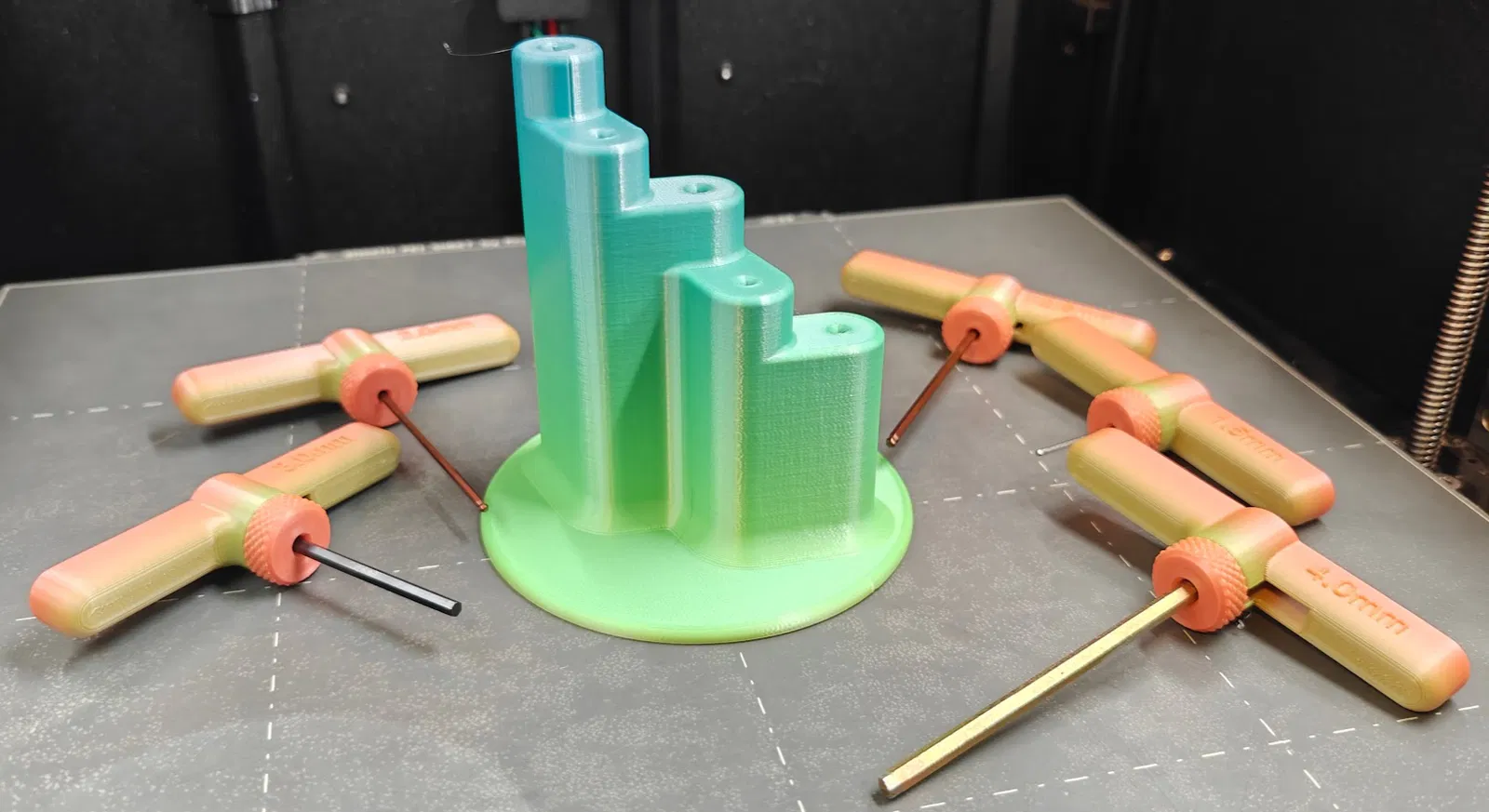 Kệ/stand giúp bàn làm việc gọn gàng hơn, dùng để dựng bộ T-Handle hex wrench. Thiết kế tự làm từ đầu (không remix), lỗ cho 1.5/2/2.5/3/4mm và dư khoảng 0.5mm để dễ dùng.