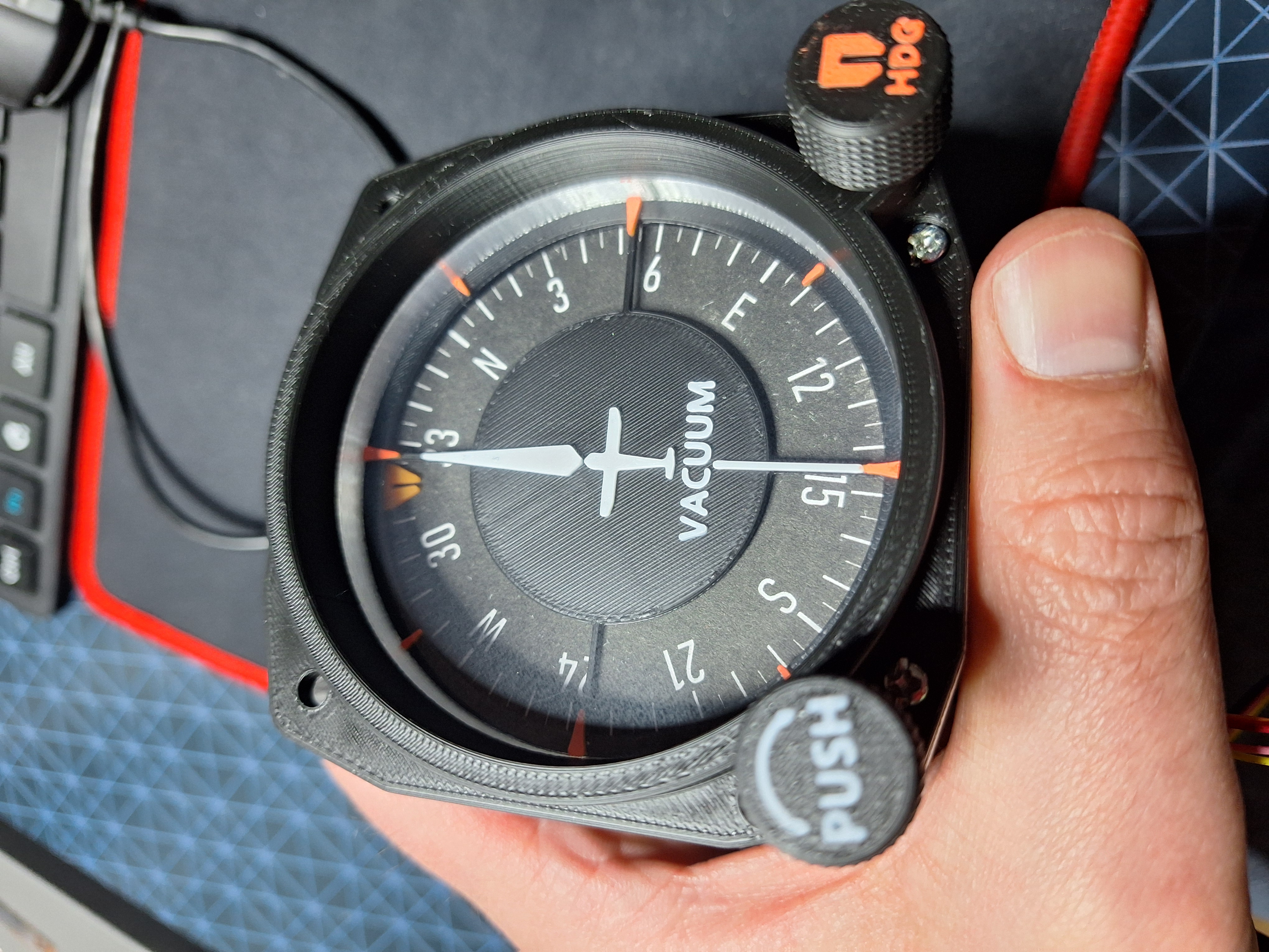 Bản remix Gyro Compass (Heading Indicator) in 3D hoàn toàn cho flight simulation. Dùng 2 stepper 28BYJ-48 và 2 encoder EC11 để chỉnh Heading Bug và sync Vacuum DG; có chi tiết Ring_Transp.stl cần in vật liệu trong suốt.
