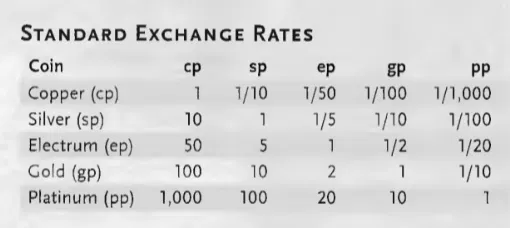 Dưới đây là thông tin nền về hệ tiền tệ trong D&D 5e và giá trị tương đối của từng loại: