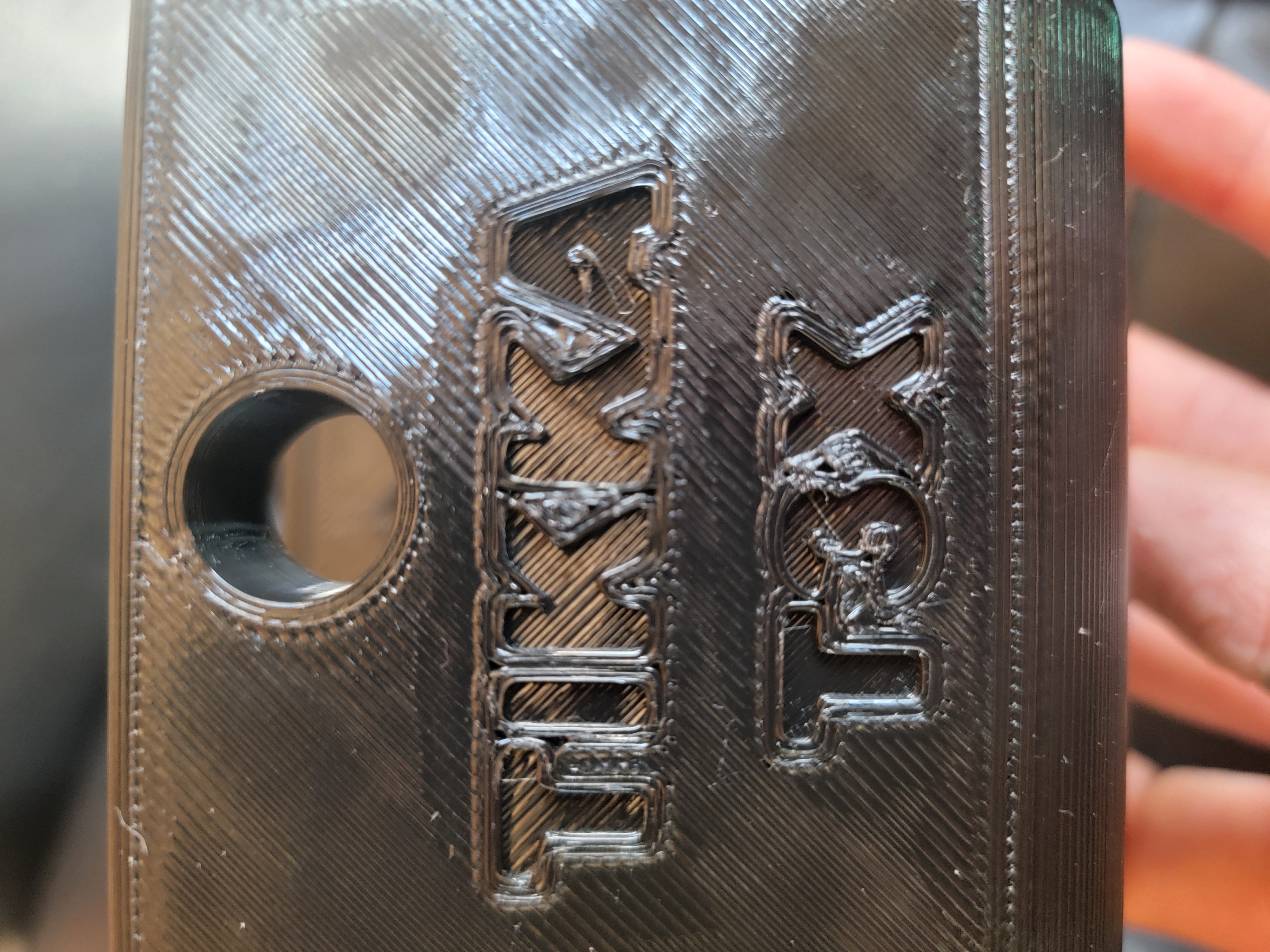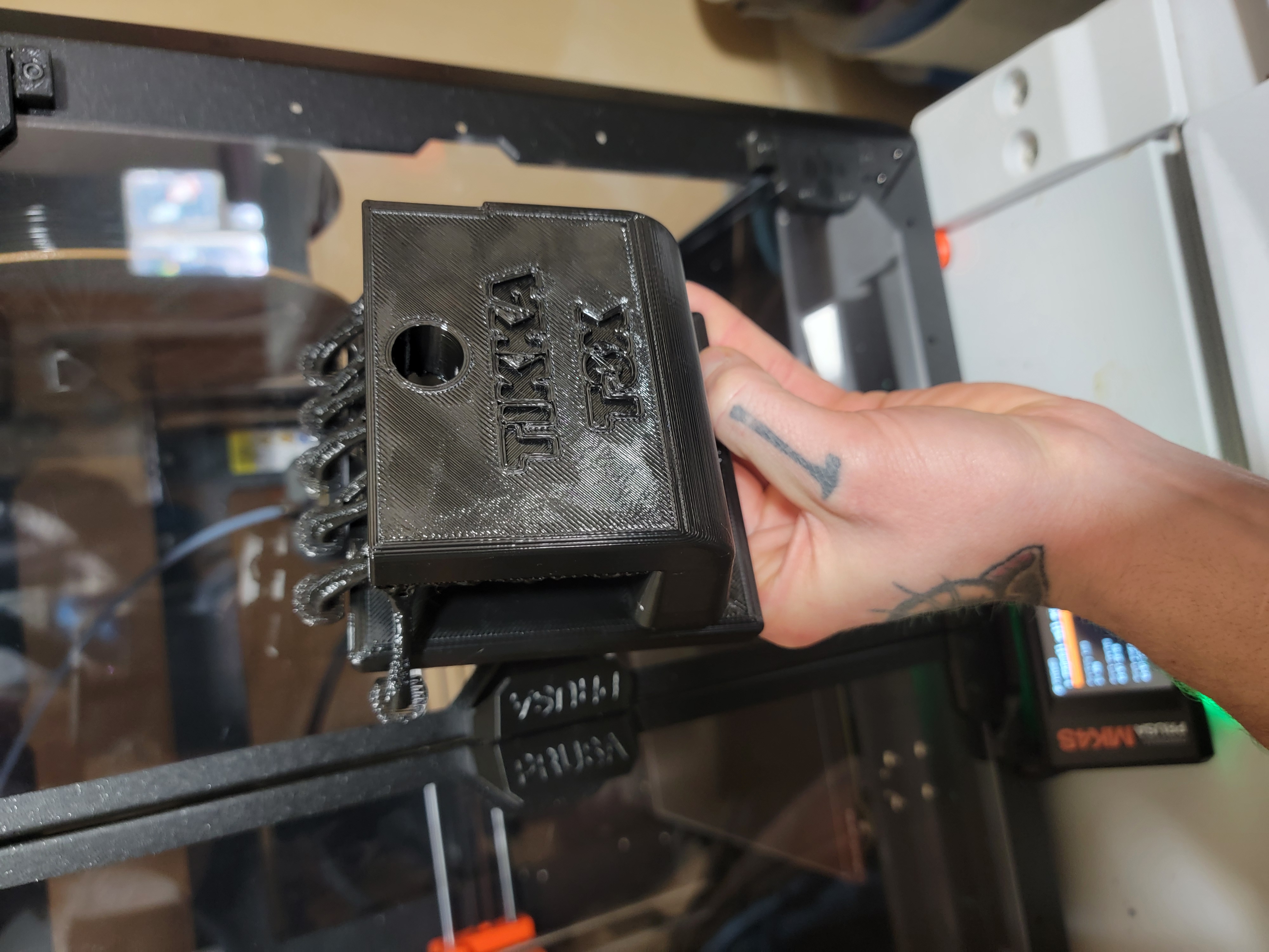 Mình in bằng PETG, để nhiều lớp thành (khoảng 6?) và dùng tree supports bắt đầu từ build plate. Khi in thì để chữ “tikka” nằm ngang phía mặt trước.