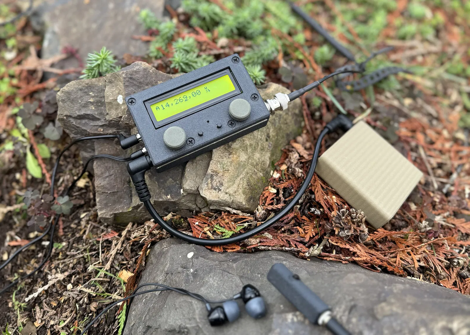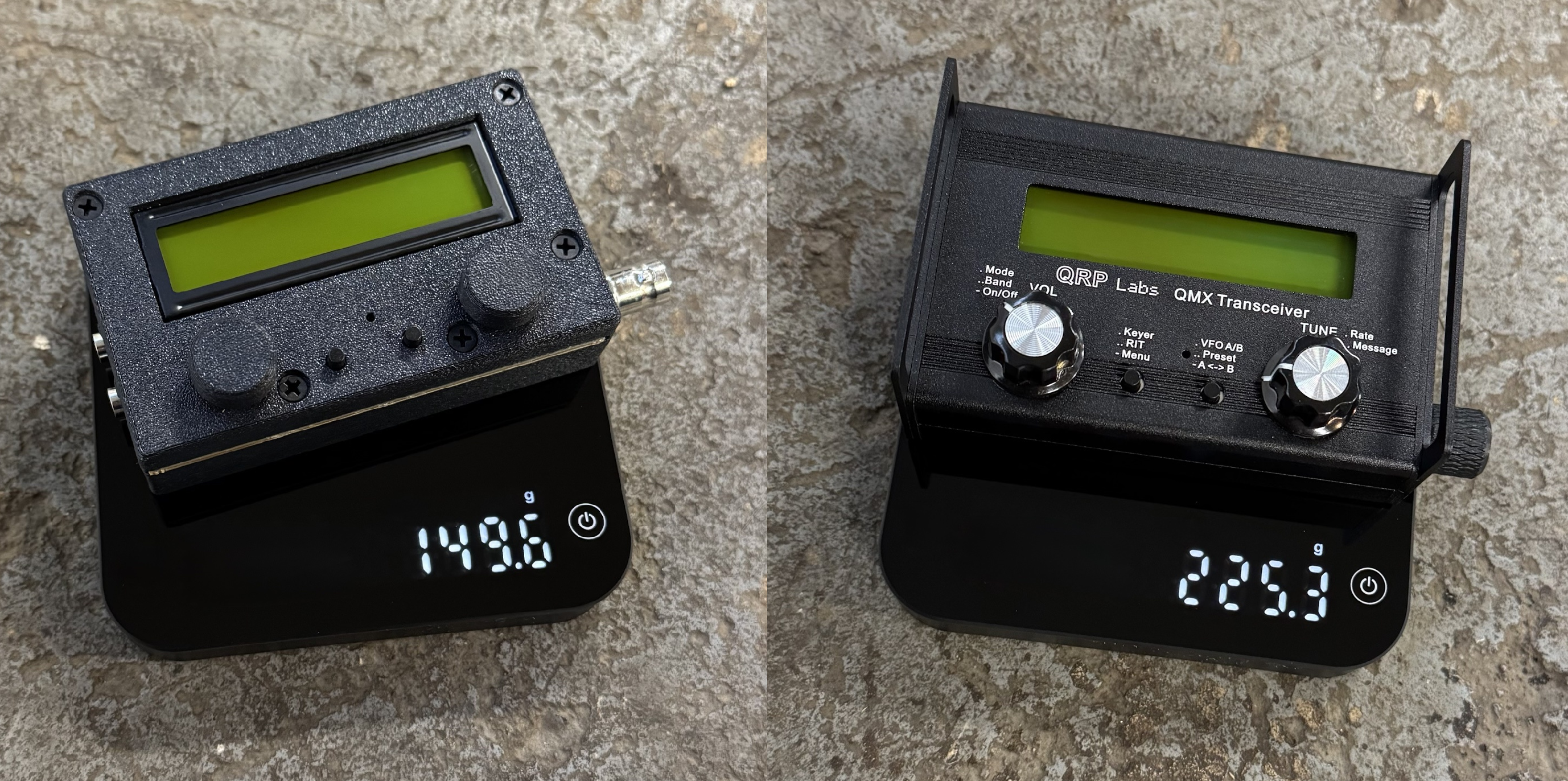 Con QMX trong hình là bản QRP Labs tự lắp, Rev 5, mid band, có jack PTT. Case và knobs được in bằng ASA-GF. Bộ knobs siêu nhẹ có thể xem ở đây: