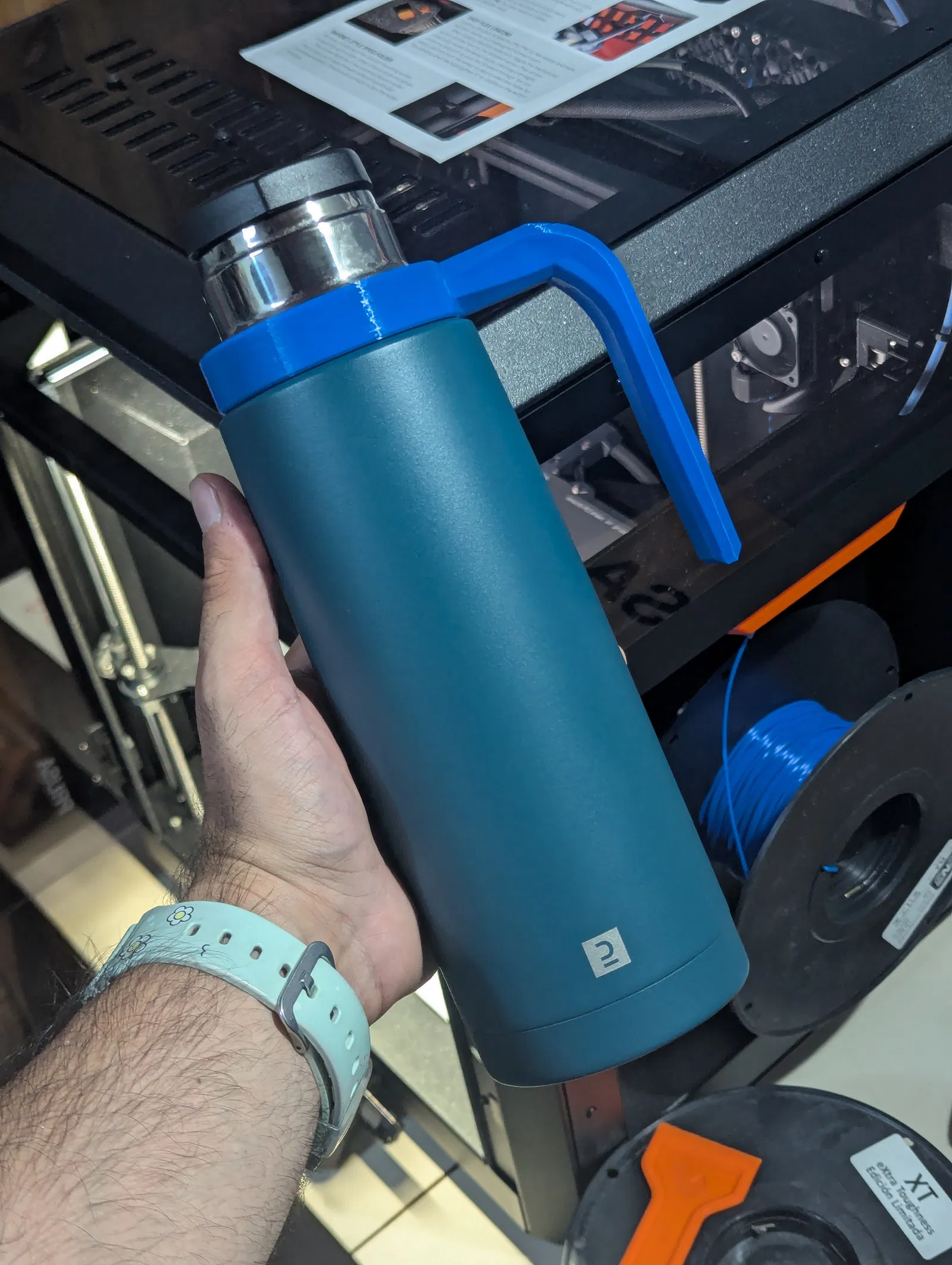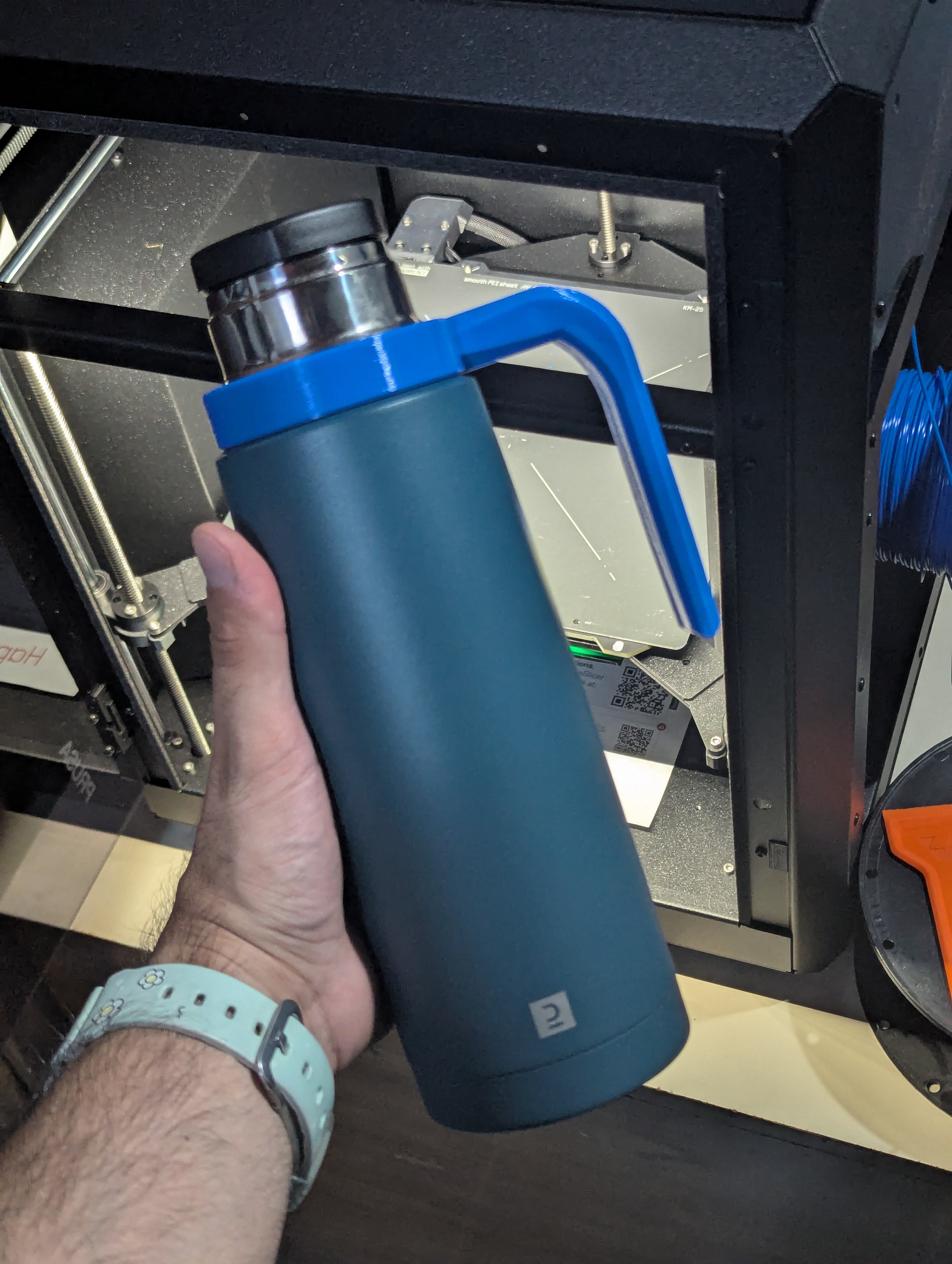Tay cầm thiết kế riêng cho bình giữ nhiệt Quechua 0.75L (Decathlon), lắp khít nắp zin dạng vặn ren giúp cầm chắc và rót dễ hơn, giảm trơn trượt bề mặt kim loại. Khuyến nghị in PETG/ASA, tối thiểu 3 perimeters.