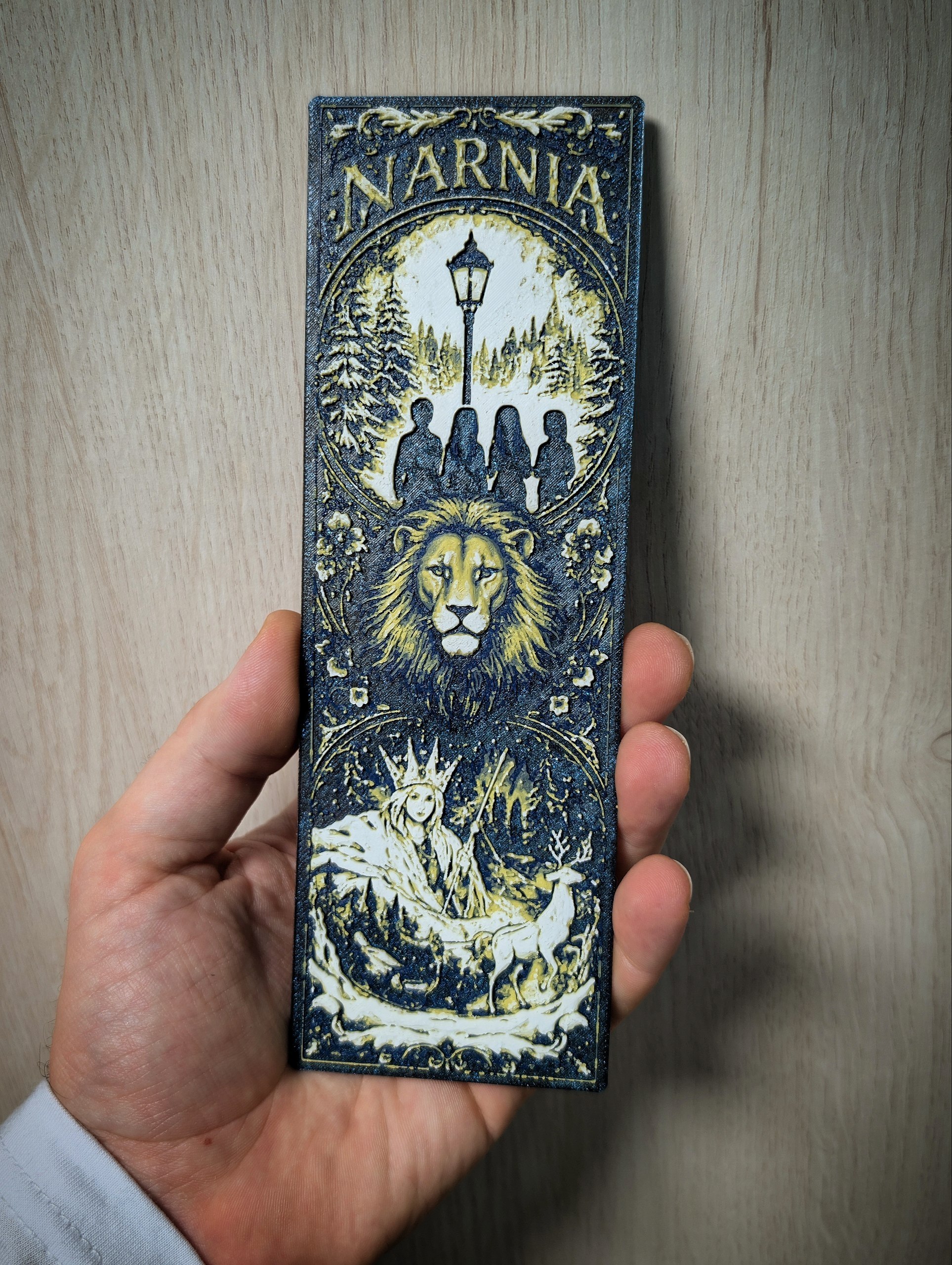 Bookmark lấy cảm hứng từ *The Chronicles of Narnia: The Witch and the Wardrobe*, tạo bằng kỹ thuật Hueforge. Hỗ trợ CFS/AMS/IFS và được tạo với MakerWorld-Chroma Canvas.