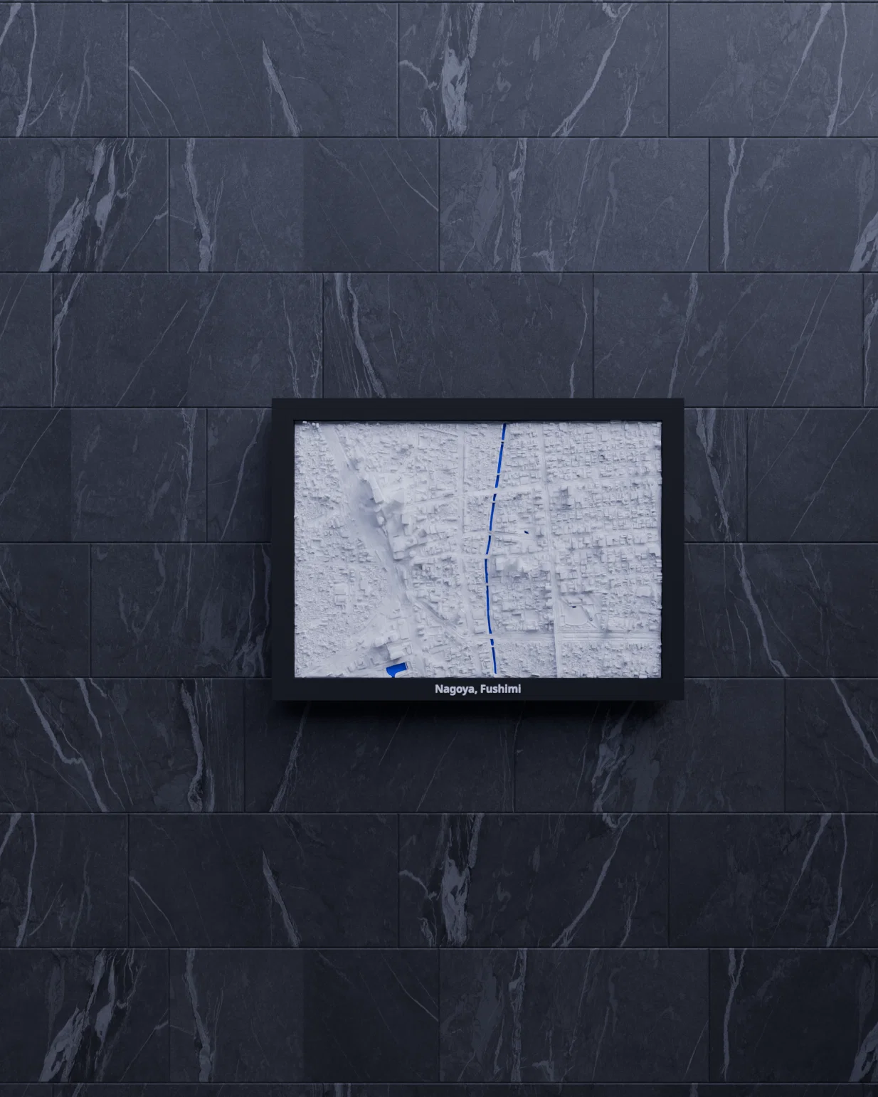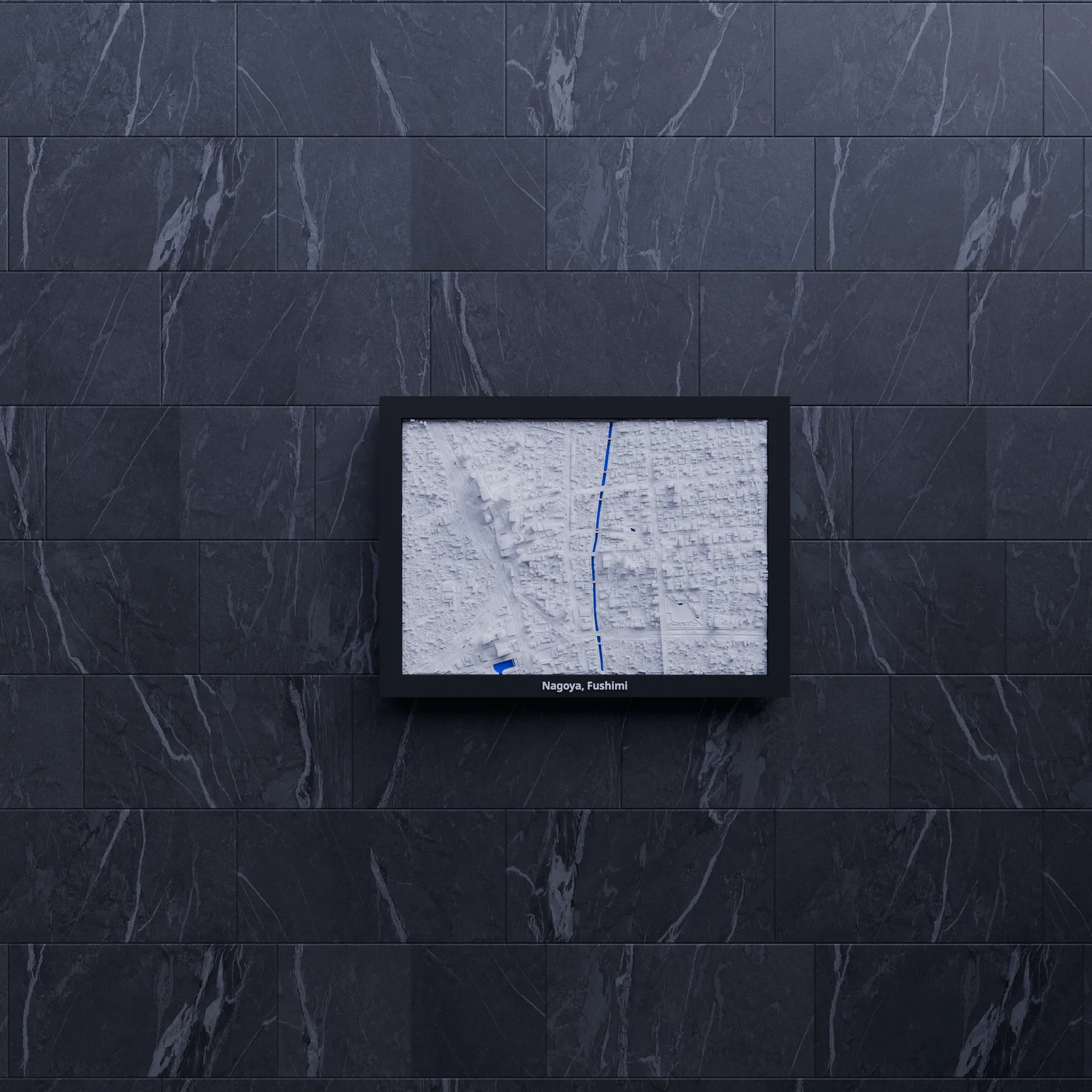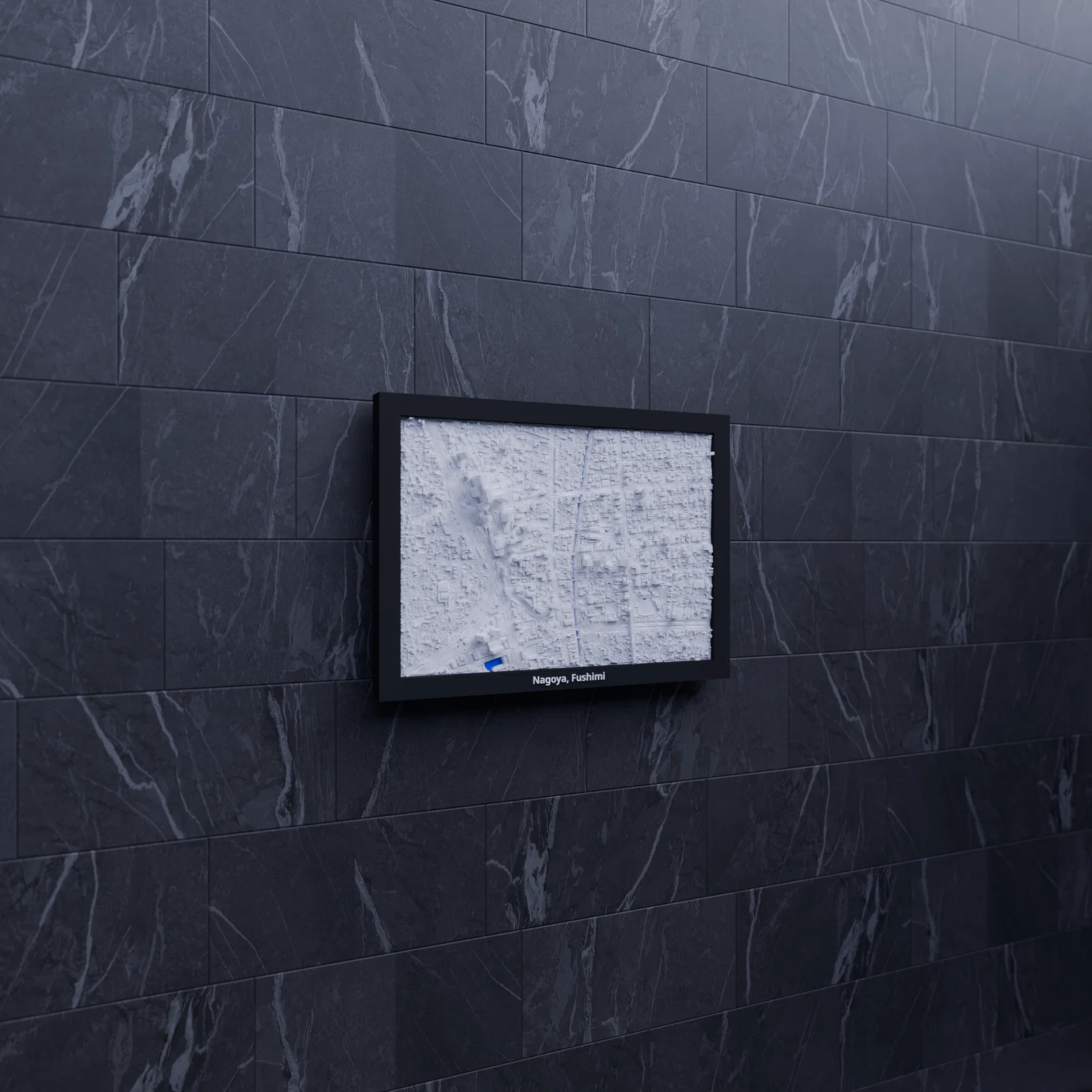 Mô hình địa hình (topographic) in 3D tái hiện khu vực Nagoya, Fushimi (Nhật Bản) từ dữ liệu địa lý. Kích thước in 170.5 x 119.5 mm, tỷ lệ xấp xỉ ~16520:1, kèm nhiều frame có lỗ treo.