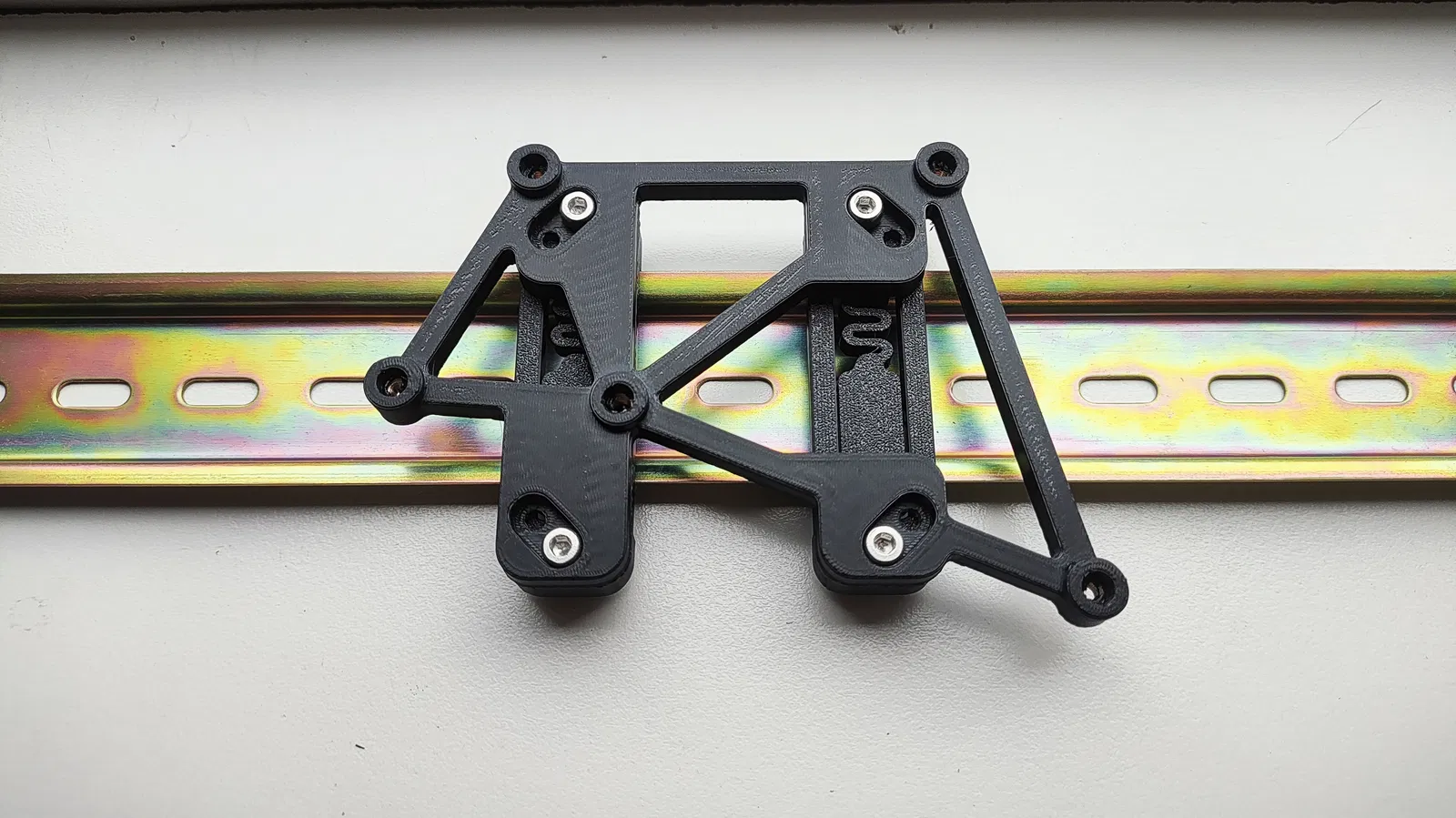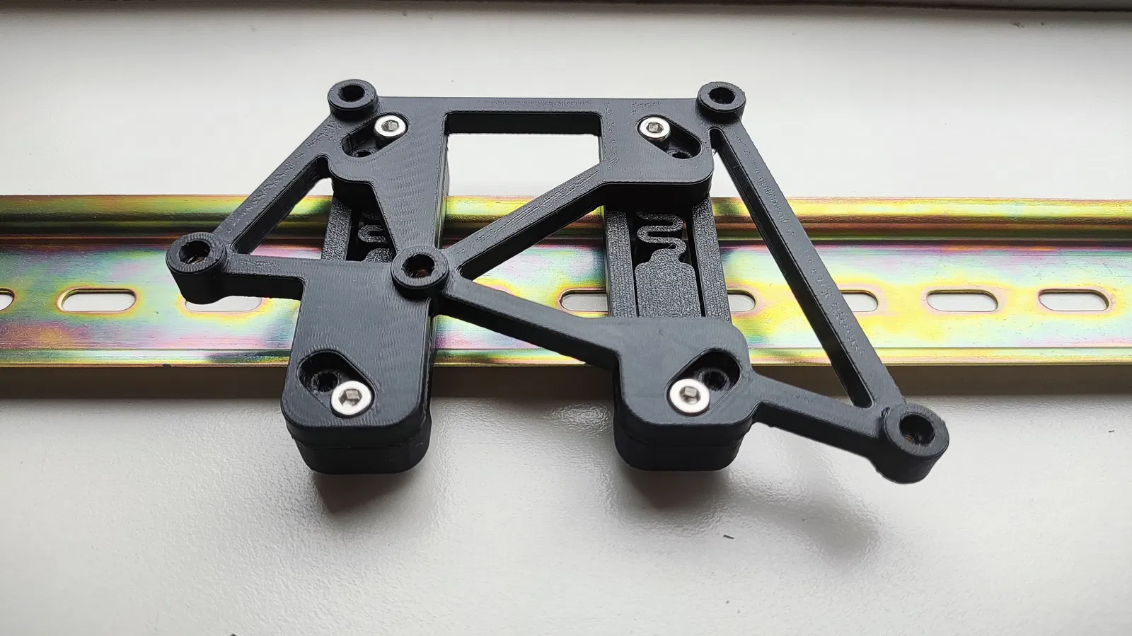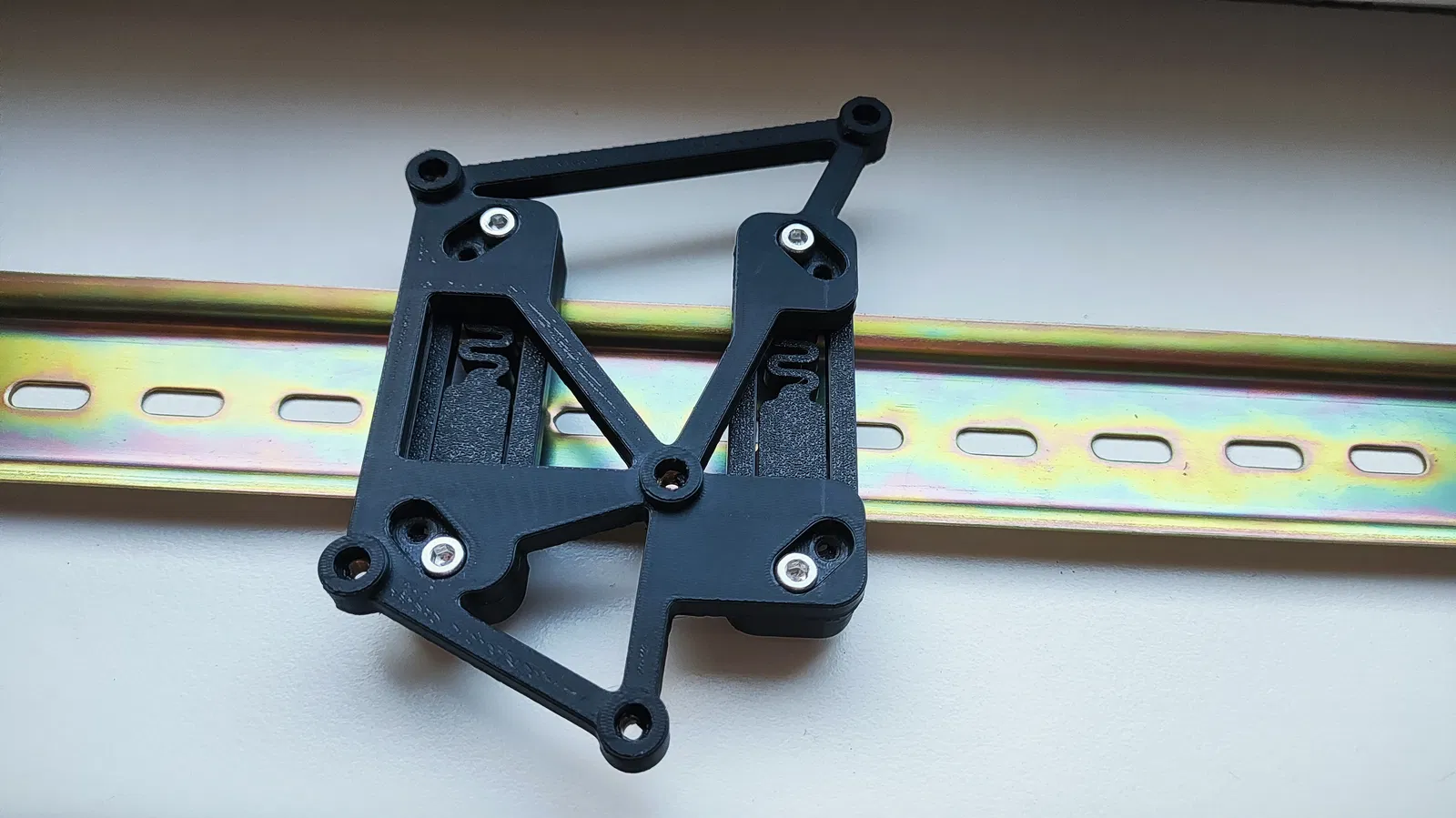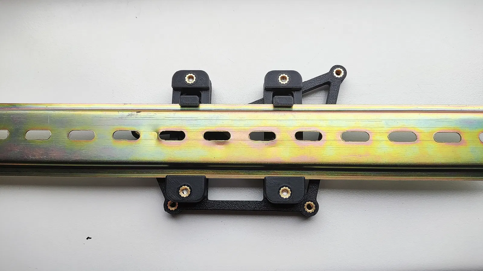 DIN Rail Brackets của mmuellerphoto dùng rất ổn, nên mình thiết kế ngàm dựa theo bộ đó và cho phép chọn hướng lắp. Mình cũng muốn gắn chắc chắn hơn, nên thiết kế này dùng 2 bracket.