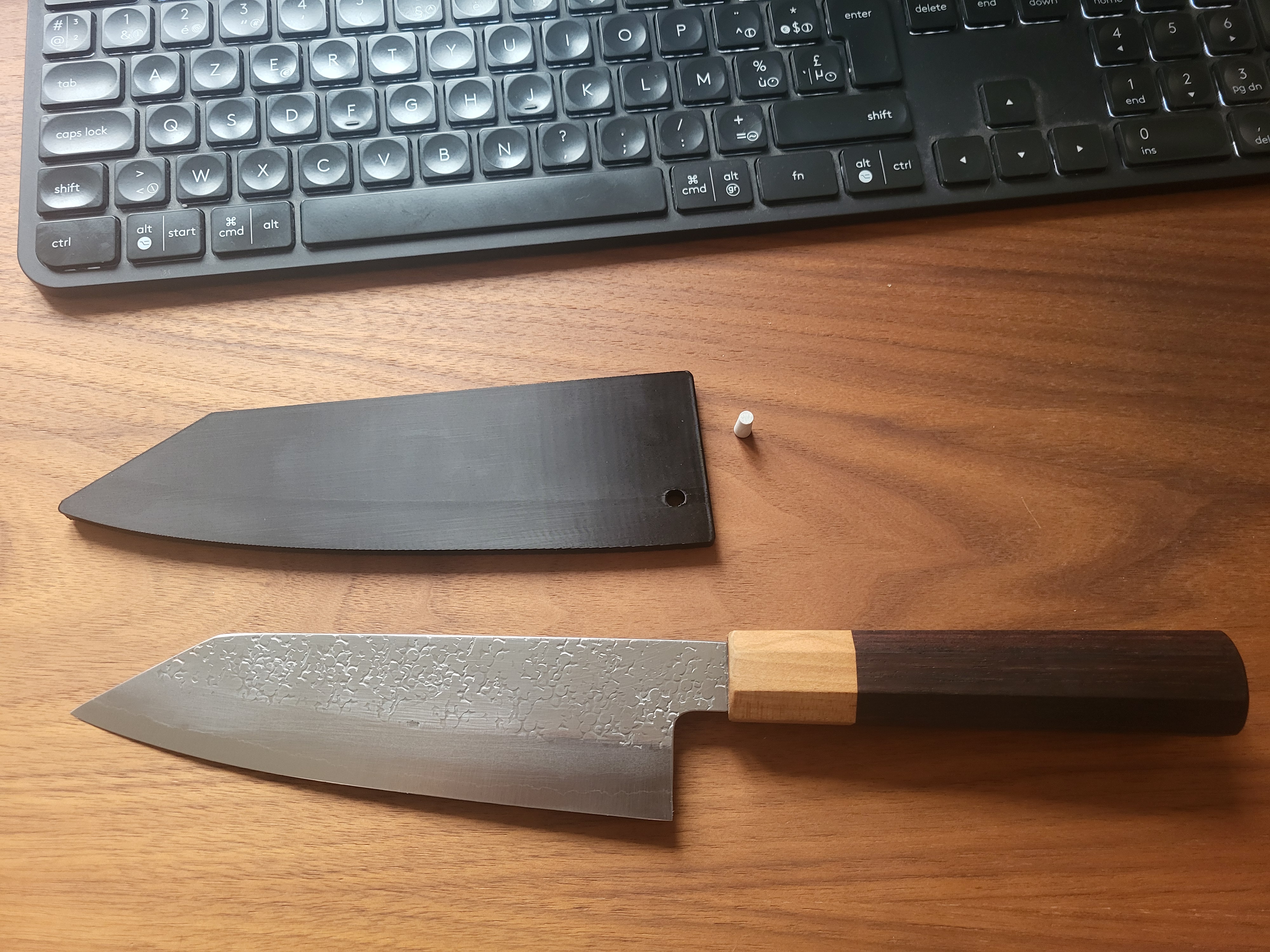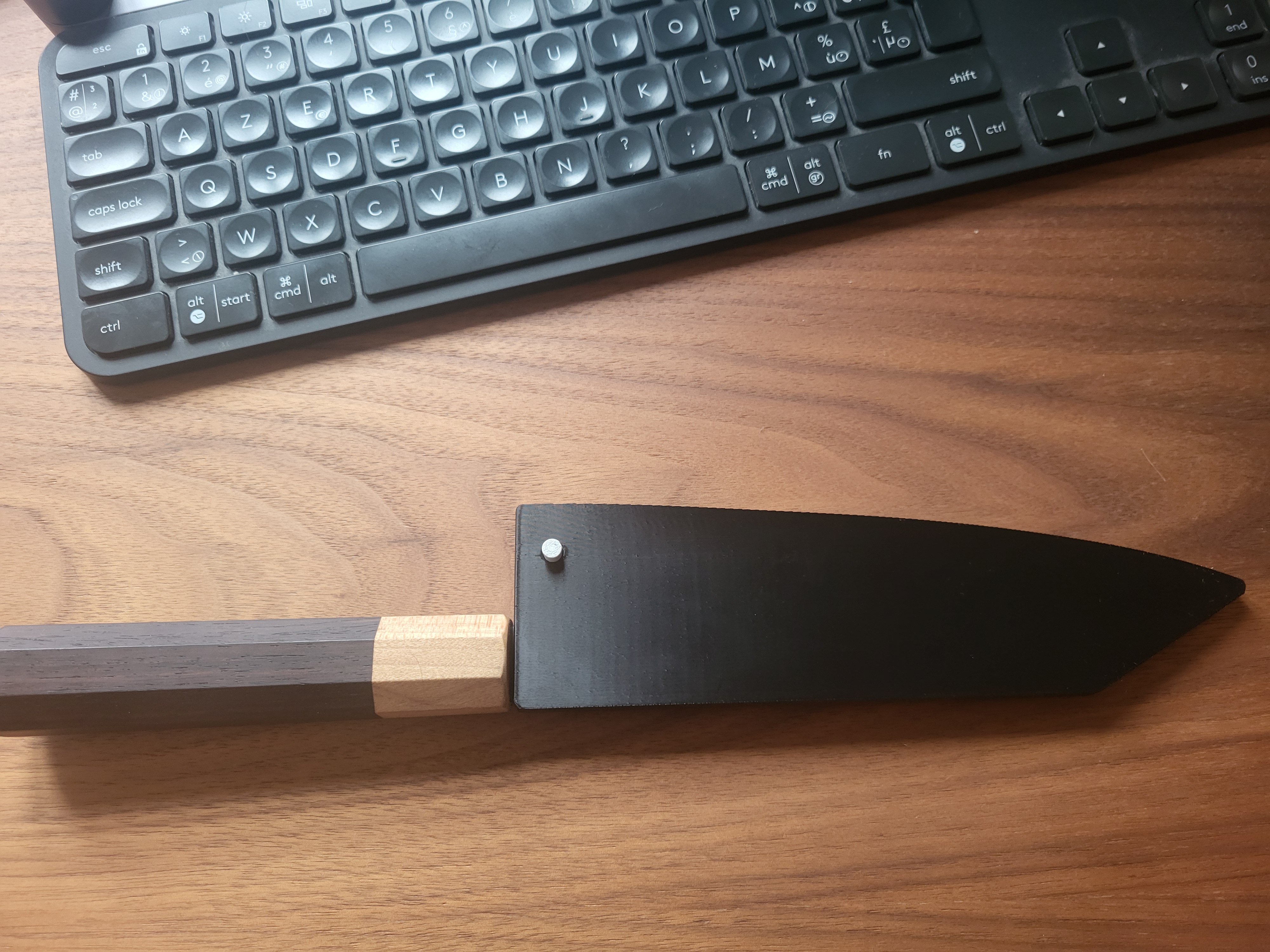 Saya/vỏ bao dao dành cho Okeya Gin 3 bunka 165 mm. Mẫu này mình custom theo cây dao của mình nên chưa chắc sẽ vừa với dao của bạn. Gợi ý in: thử để mũi dao hướng lên để giảm overhang.