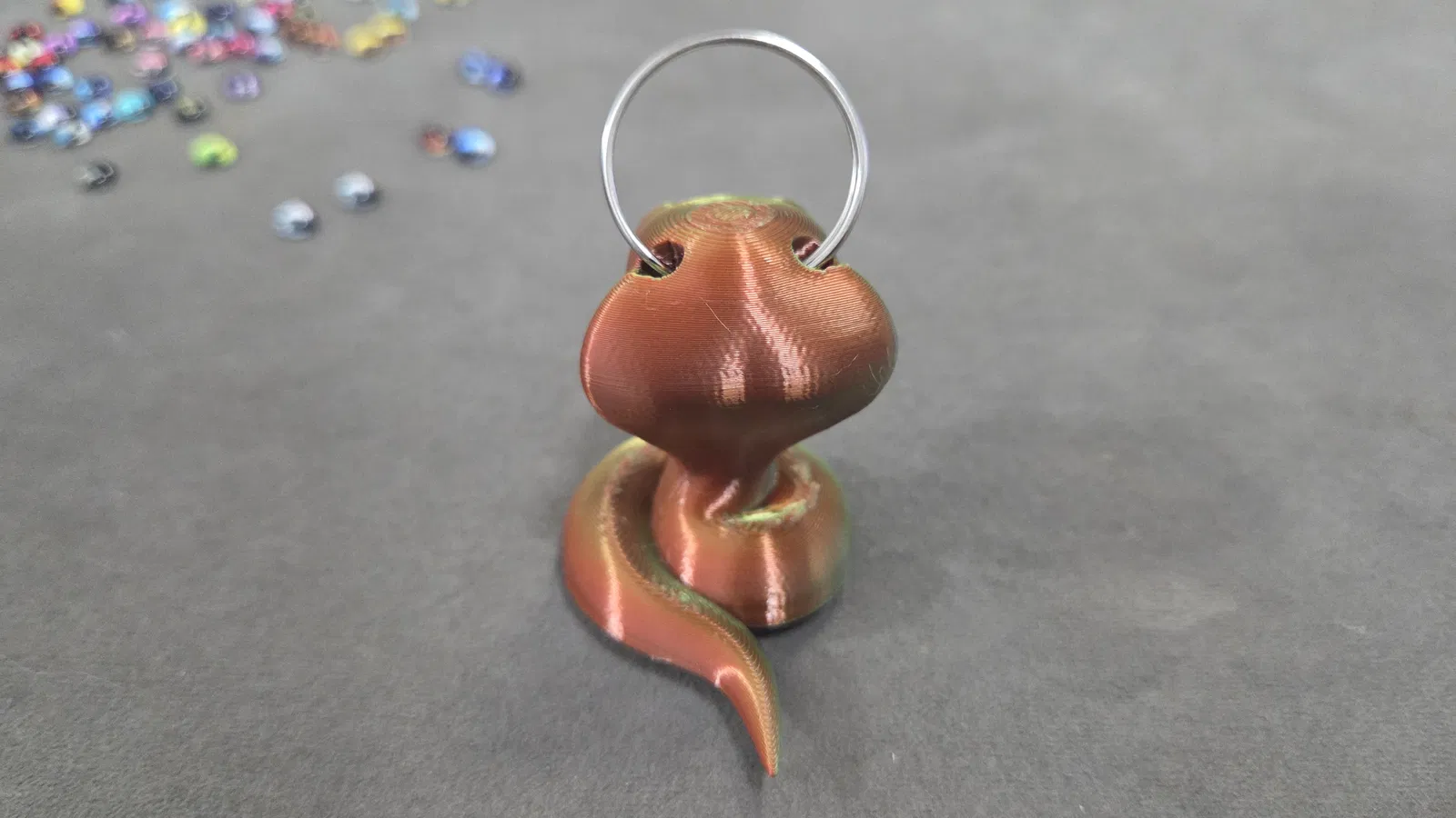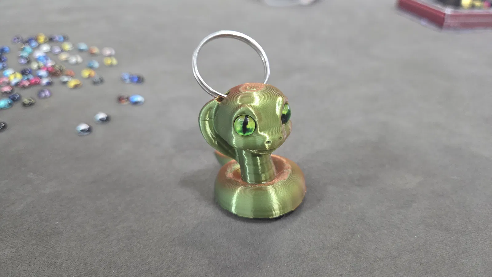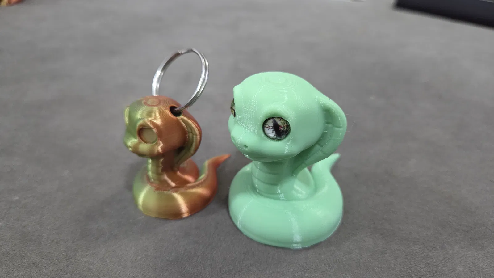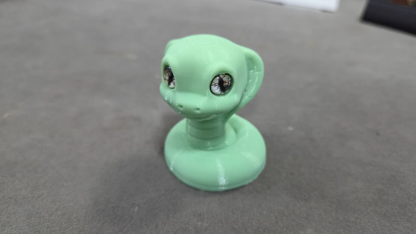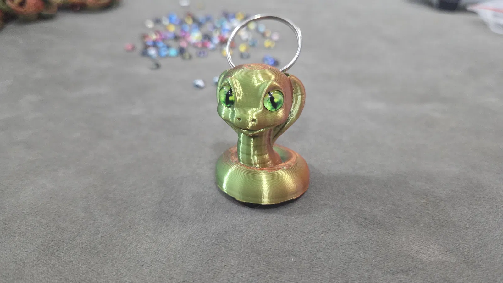 Mẫu rắn hổ mang cute của 3DMDesign nay tương thích mắt thủy tinh 6mm và 8mm. Có 2 file 3mf: bản 6mm làm móc khóa và bản 8mm lớn hơn. Painted supports chỉ cần dưới cằm, không dùng brim.