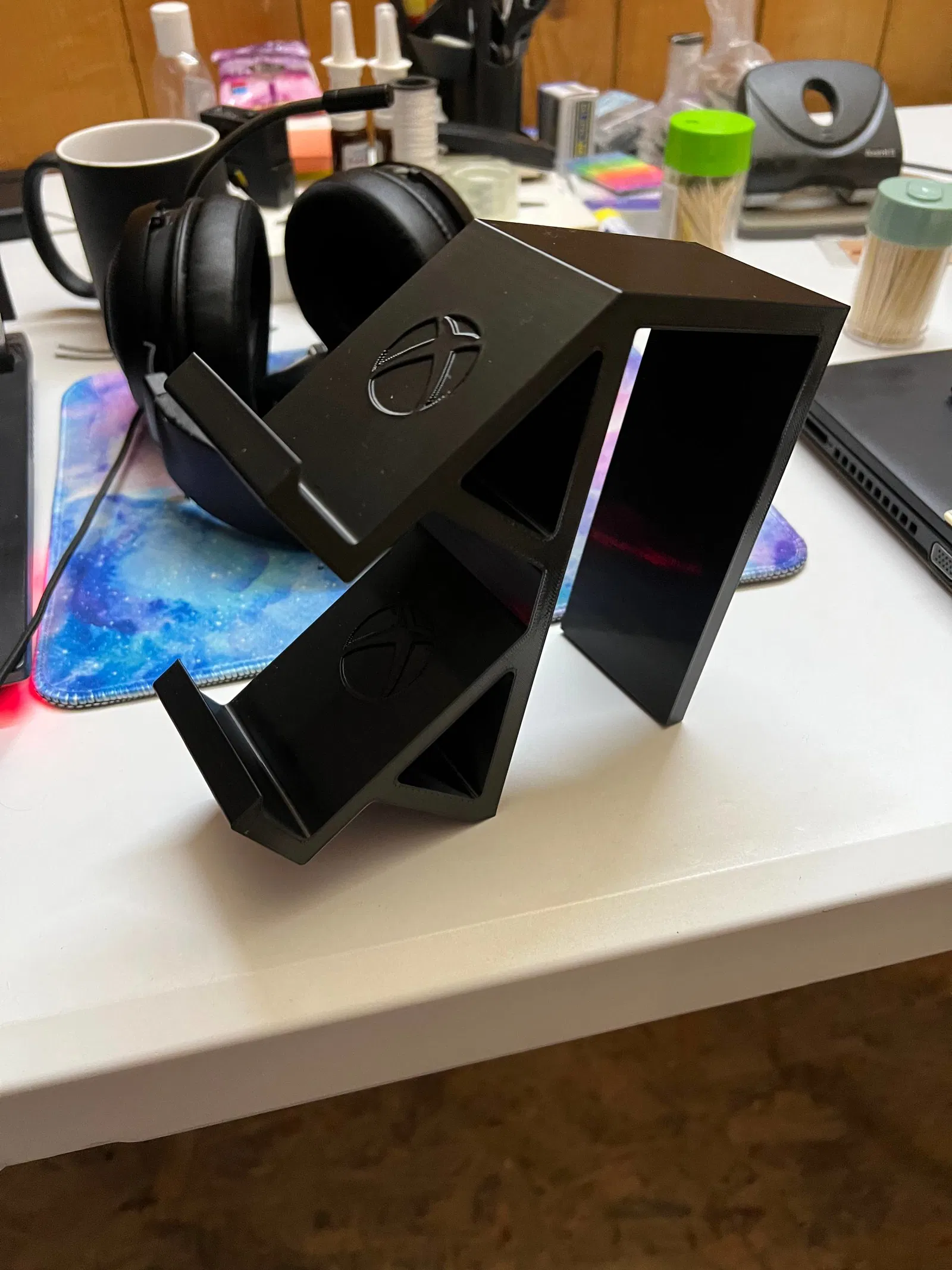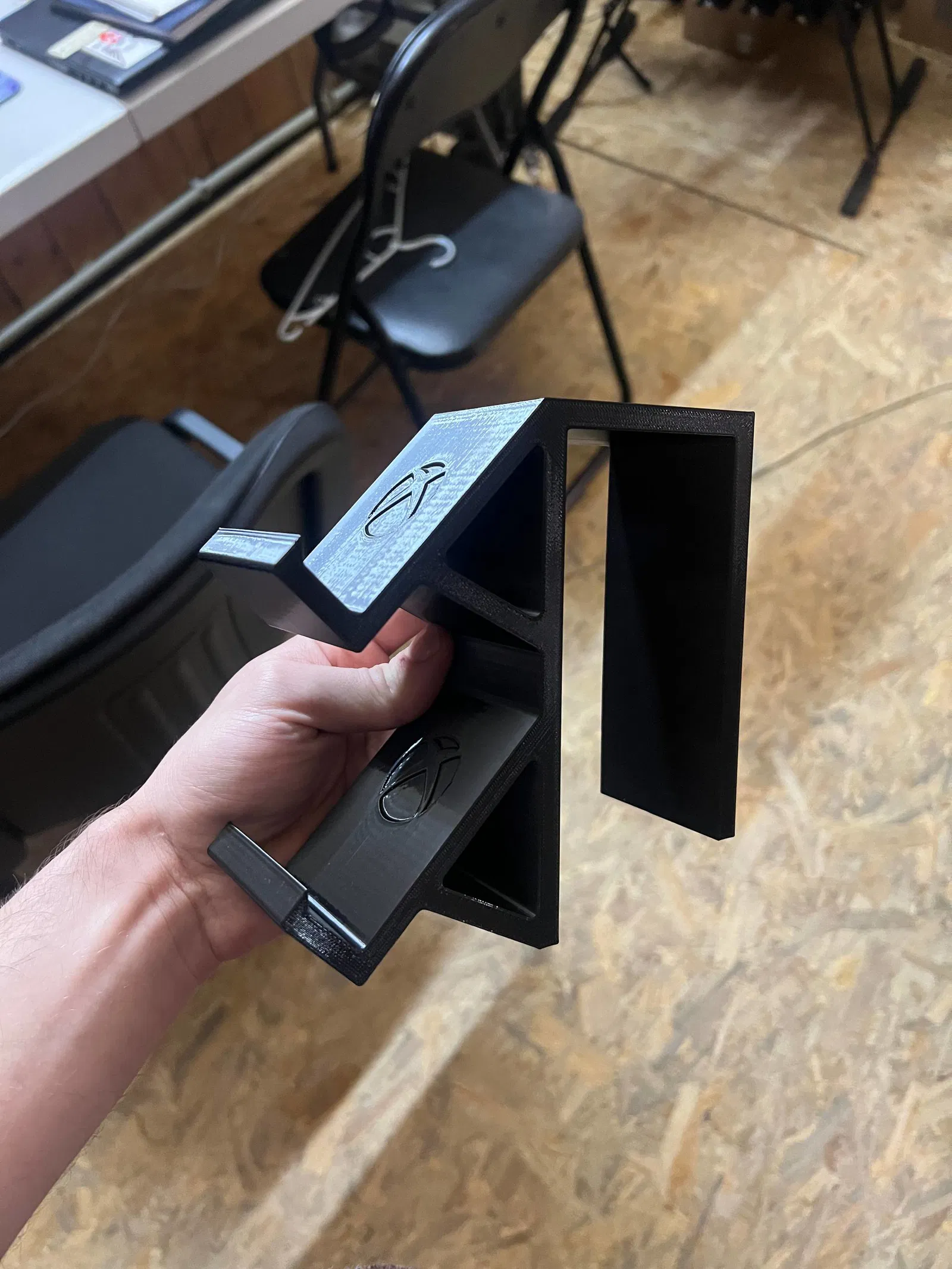 Mẫu giá đỡ để đặt gọn 2 tay cầm Xbox (XBOX S). Bản in thử được thực hiện trên PRUSA Core One với nhựa PETG màu đen, phù hợp để sắp xếp khu vực chơi game ngăn nắp hơn.