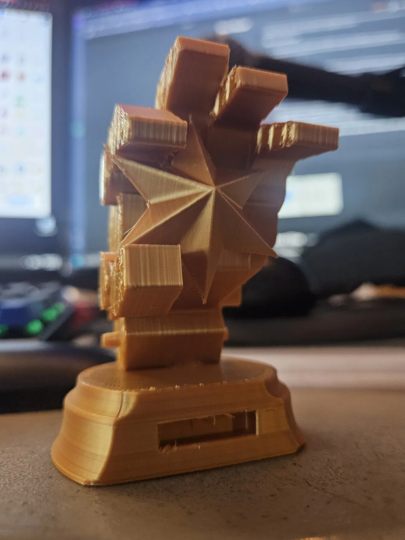 Mẫu này là một bàn tay cơ khí của BattleMech dạng “Generic” có khớp, đang nắm một ngôi sao 6 cánh trồi lên từ phần cúp có bảng tên (nameplate). Cần 2 điểm dán keo. Khuyến nghị in ở tỉ lệ 1X bằng resin cho bản nhỏ làm đồ trang trí, và 2X bằng FDM để làm bản lớn với chữ dễ đọc. Trên Elegoo Neptune 4 Plus (FDM), bản nhỏ “kích thước gốc” in khoảng 2 tiếng (tất cả chi tiết), còn bản phóng to 200% có thể mất hơn 12 tiếng.