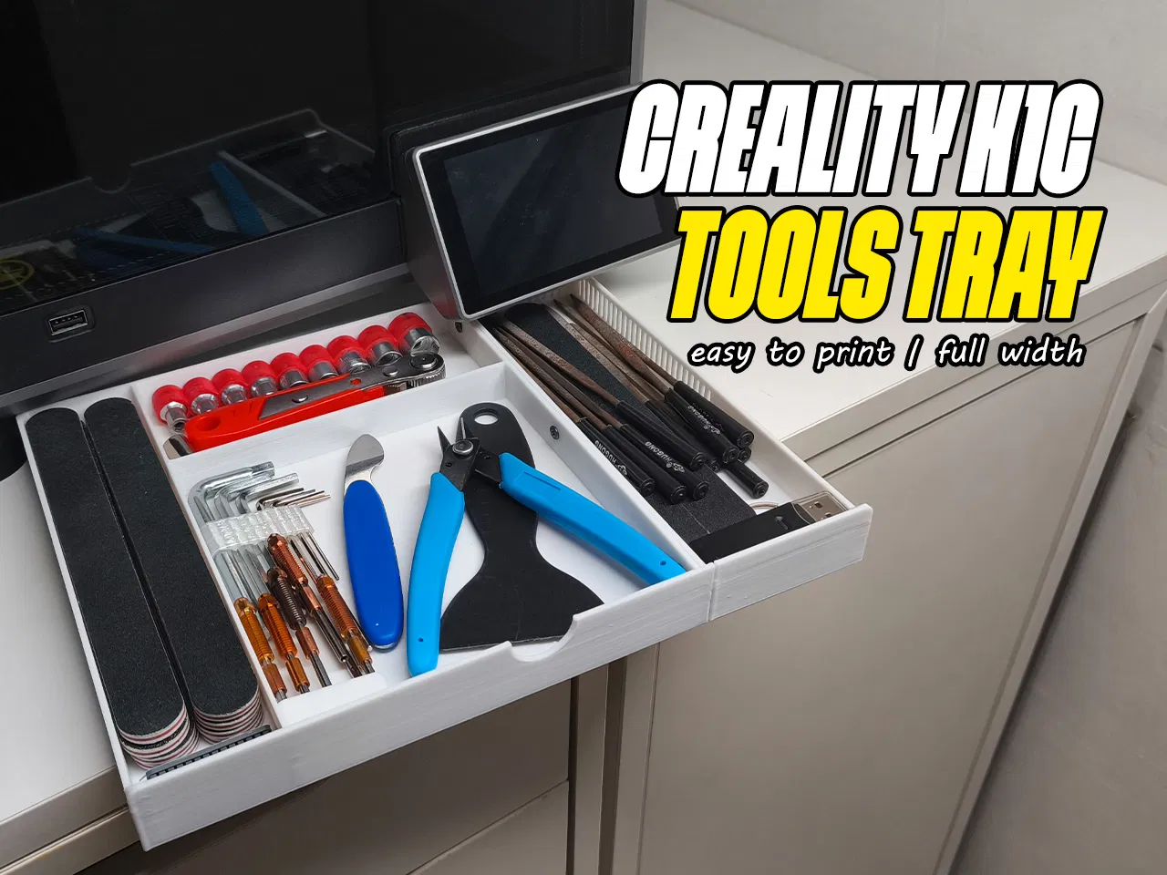 Khay lưu trữ đơn giản cho Creality K1C, dạng low profile nằm sát và gọn dưới máy. Thiết kế full width có khe thoáng gió; gồm 2 nửa trái/phải ghép lại bằng 3 vít M3*4, in không cần support.