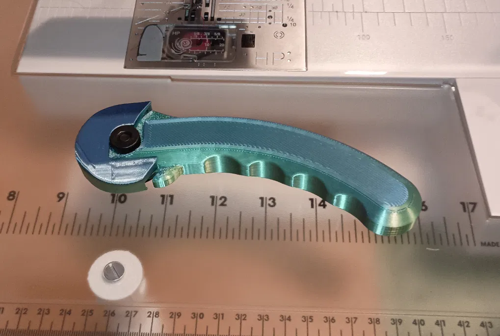 Biến thể đã được chỉnh sửa mạnh từ “Better 45mm rotary cutter handle”. Thiết kế có lỗ xuyên 8mm cạnh phẳng chống xoay ốc, lưỡi canh giữa dùng thuận cả tay trái/phải, nắp che giữ bằng 4 nam châm 3x5mm.