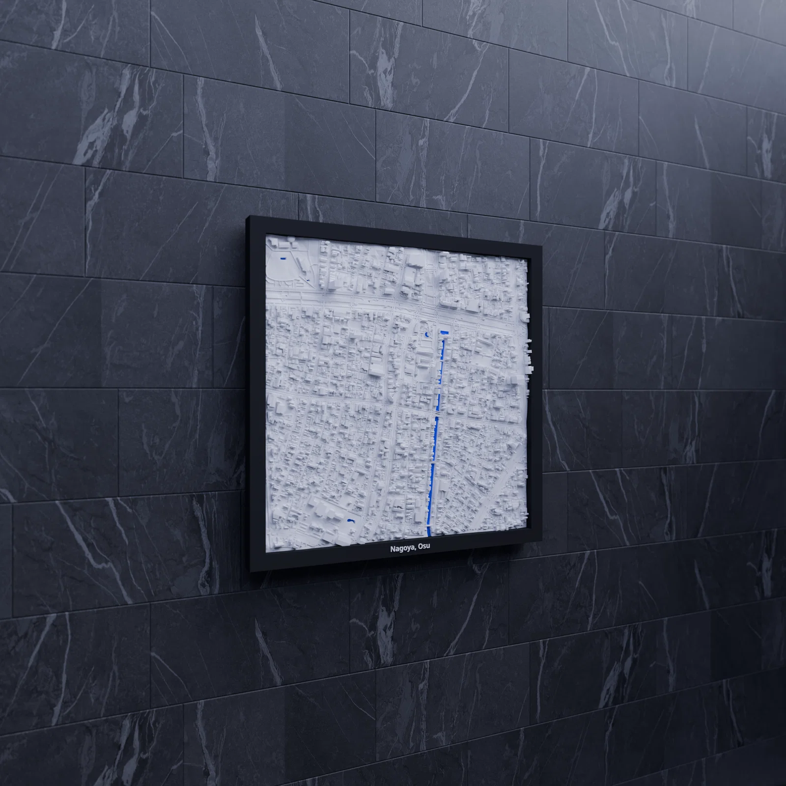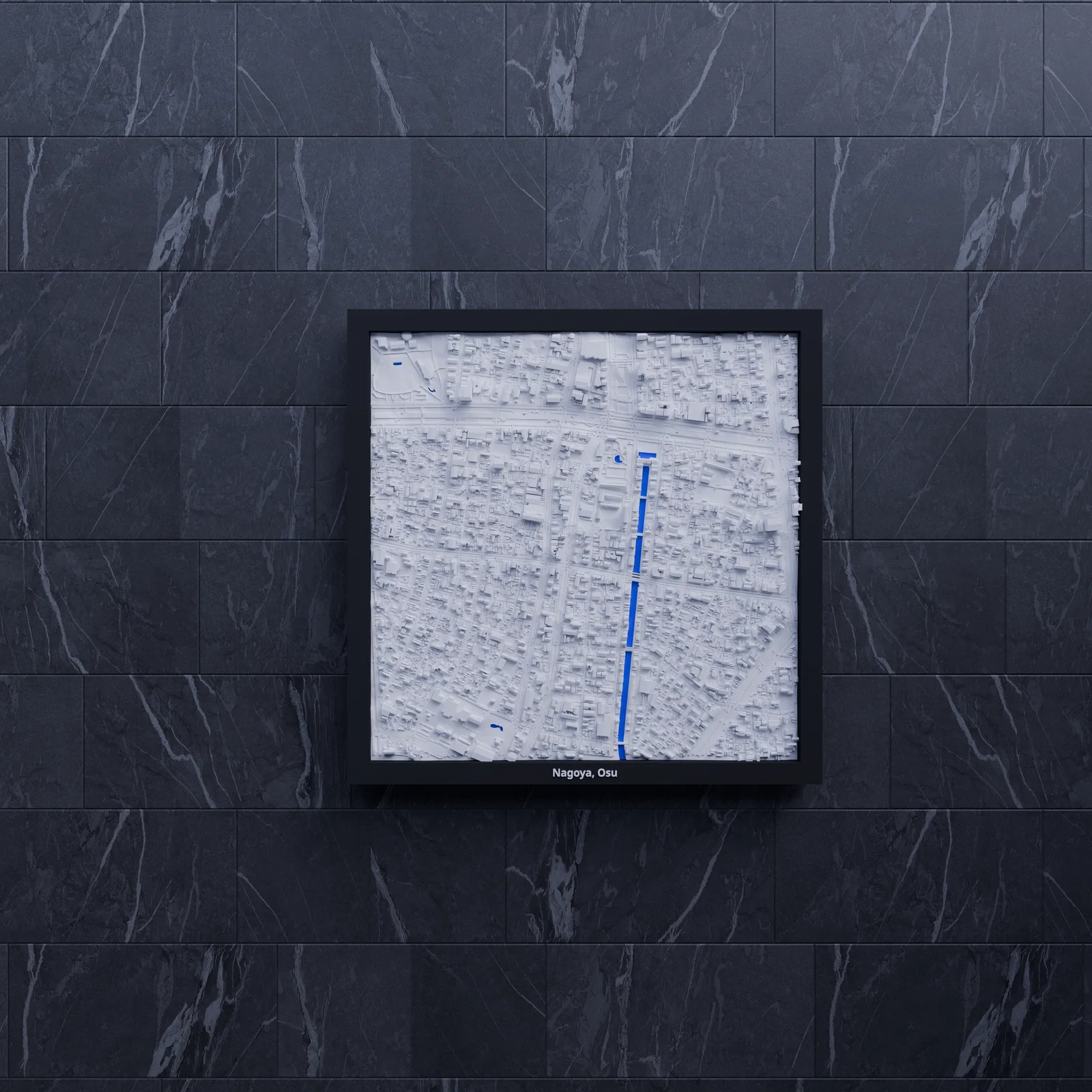 Mô hình thu nhỏ địa hình in 3D tái hiện Nagoya, Osu (Nhật Bản) từ dữ liệu địa lý, quy mô 200×200 mm, tỉ lệ ~8009:1. Có nhiều frame kèm lỗ treo, phù hợp decor, học tập và trực quan kiến trúc.