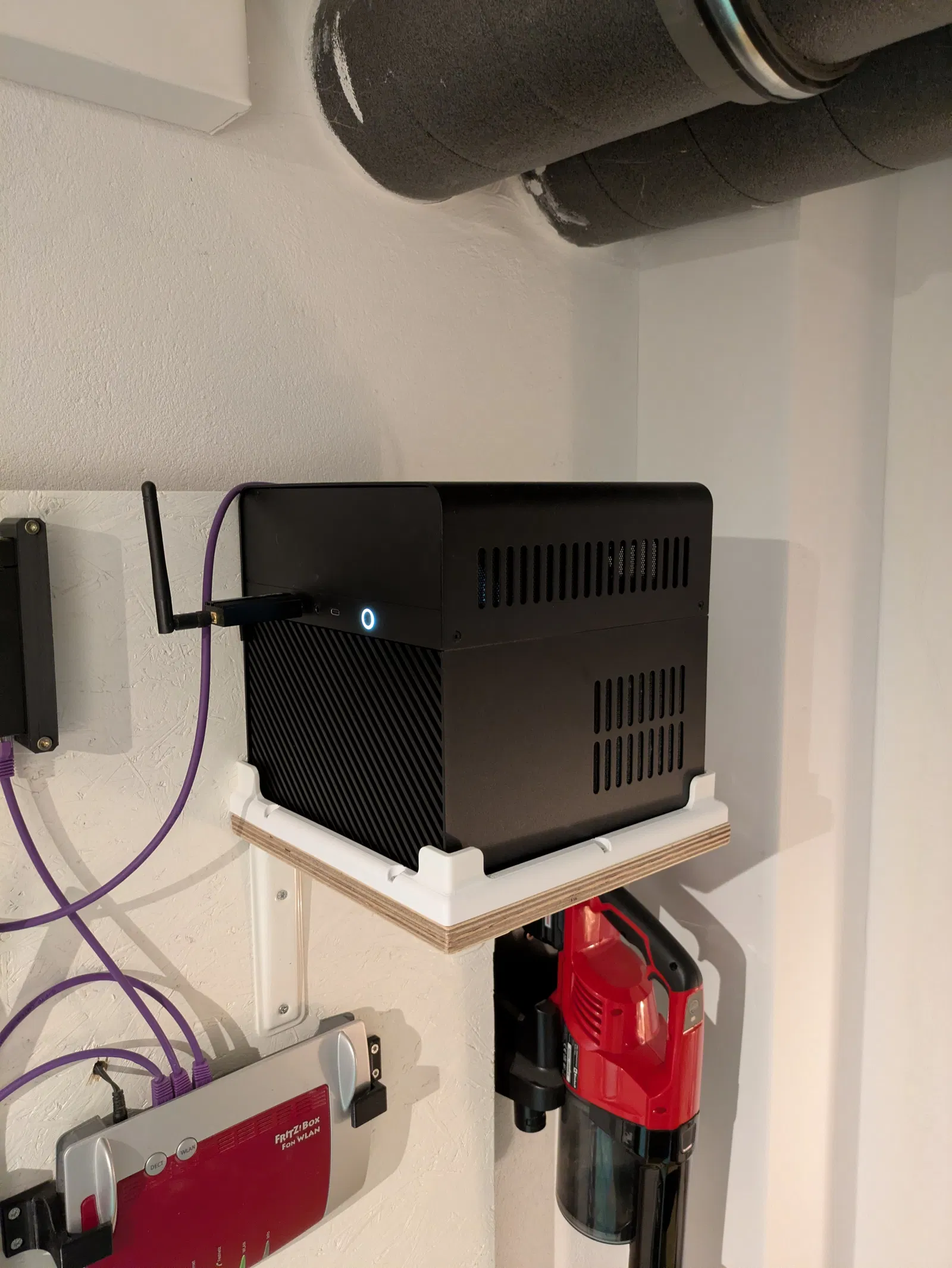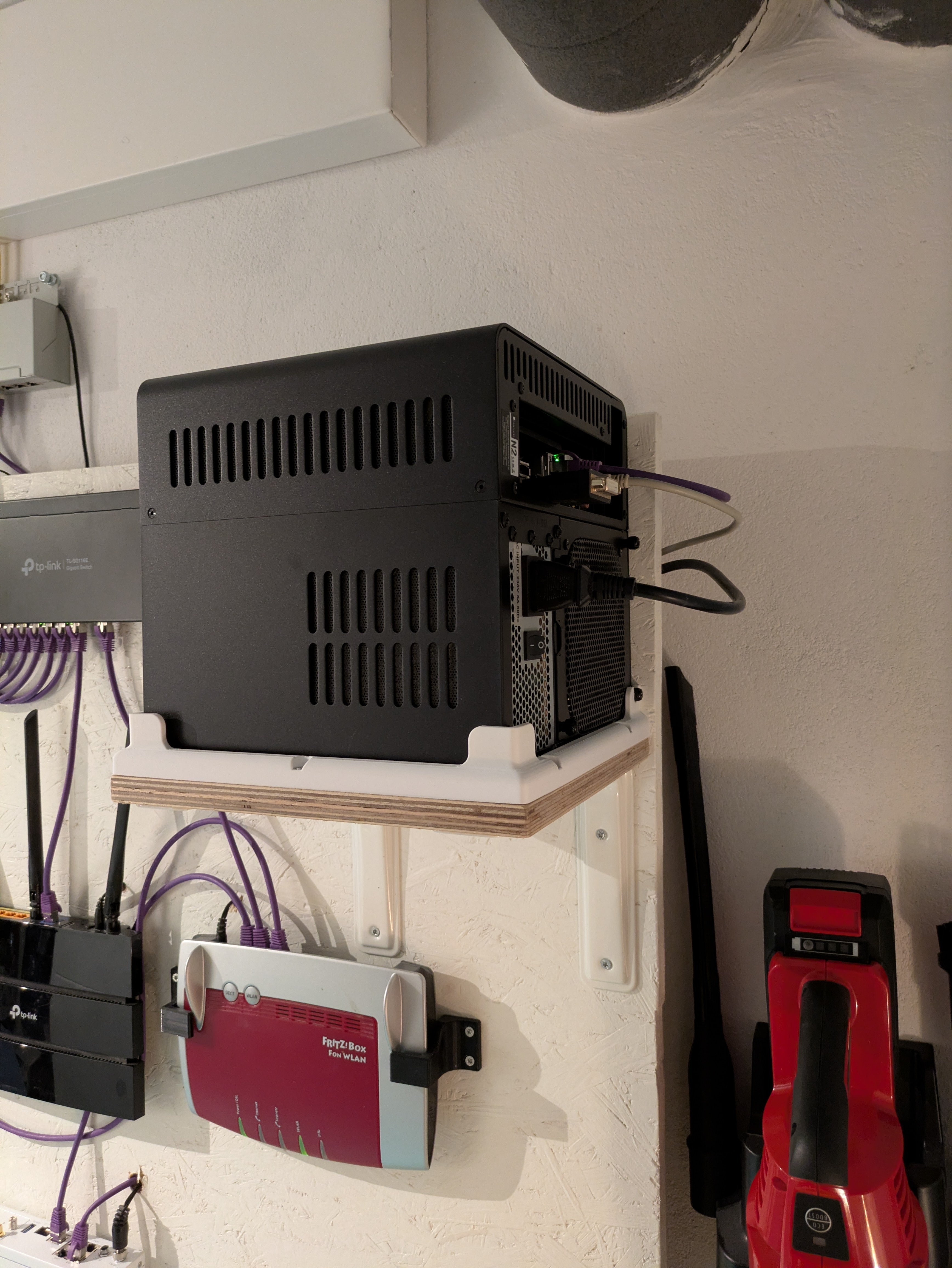 Phần kệ thì mình dùng một tấm MDF (239 × 250 mm² / 9.4" × 9.8") và hai cái metal brackets; toàn bộ bộ kệ được bắt vít lên một tấm plywood, coi hình để rõ hơn. Canh theo đúng hướng như trong hình thì tất cả các khe thông gió của vỏ máy vẫn được thoáng, không bị che.