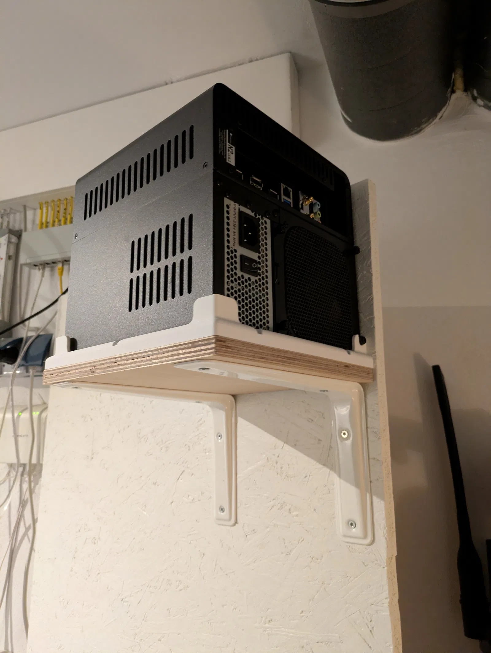 Mình làm một cái kệ nhỏ cho con Jonsbo N2 chạy headless trong phòng tiện ích. Để chắc chắn nó không bị rơi, mình thiết kế cái khung này để giữ N2 cố định và chắc chắn.