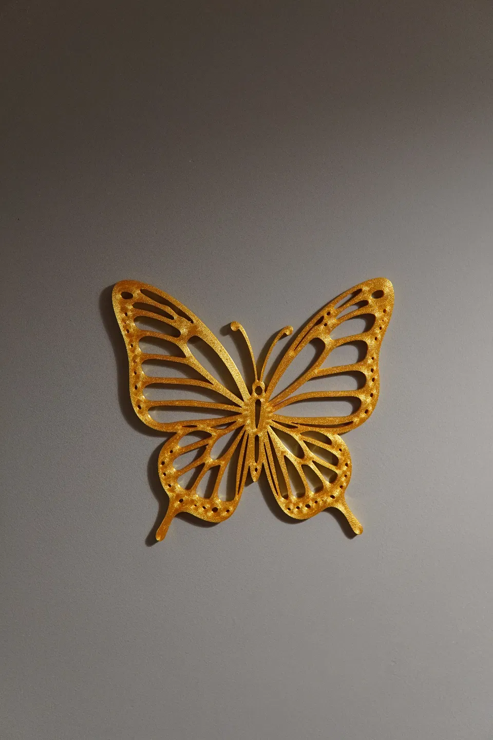 Con bươm bướm vàng in 3D này nổi bật với các chi tiết tinh xảo: đôi cánh mảnh, đối xứng, kèm hoạ tiết filigree thanh lịch. Bề mặt ánh kim vàng từ silk filament tạo cảm giác sang trọng, rất hợp để trang trí hoặc làm quà tặng độc đáo.