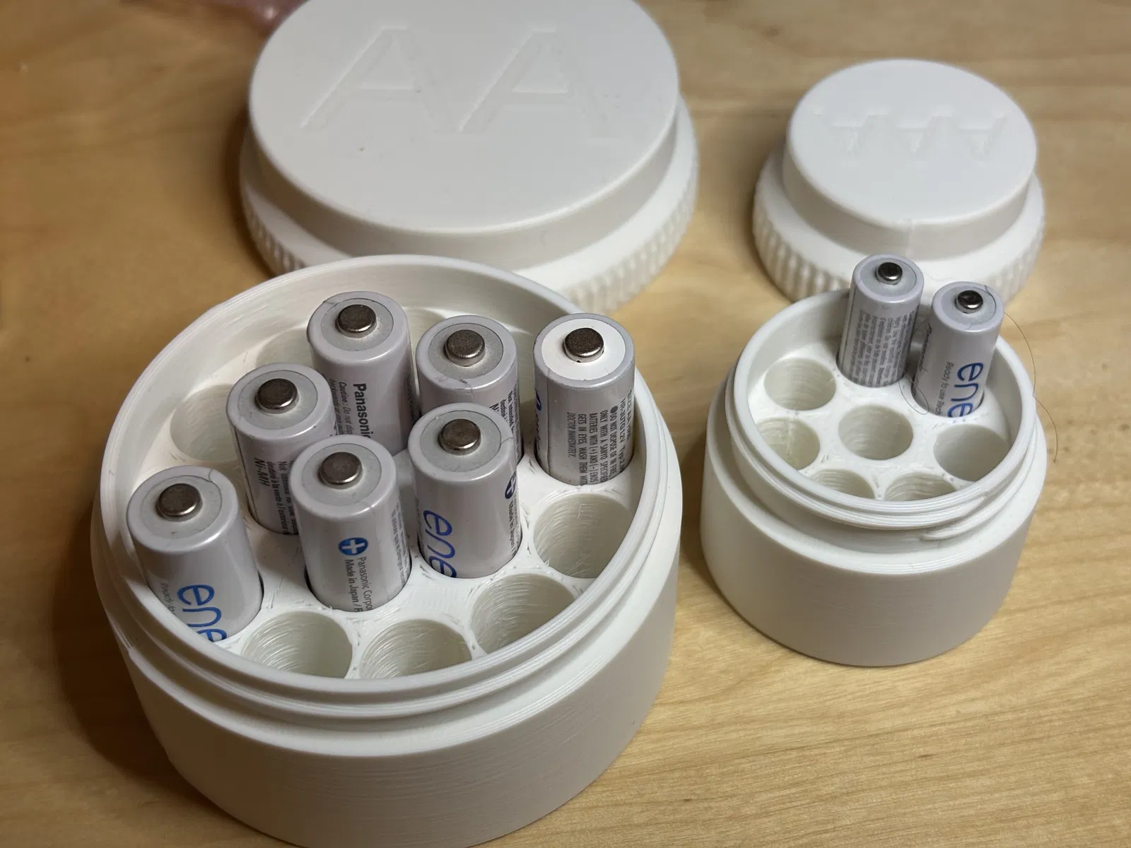 Hộp đựng pin AA/AAA dạng nắp vặn siết, có nhãn kích cỡ ngay trên nắp. Có phiên bản chứa 8 hoặc 16 viên. Thiết kế parametric bằng OpenSCAD, dùng BOSL2 cho ren vặn và bề mặt nắp; in không cần supports.