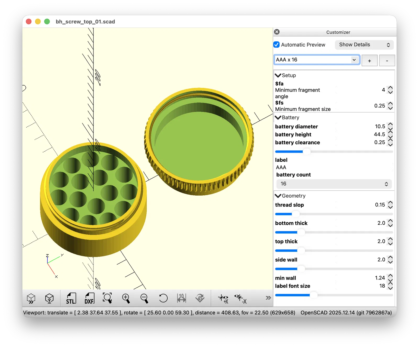 Thiết kế parametric bằng OpenSCAD, dựa trên cách sắp xếp tối ưu các vòng tròn bên trong một vòng tròn khác. Thư viện BOSL2 rất xịn, cung cấp phần ren vặn, tạo texture cho nắp và nhiều tính năng khác.