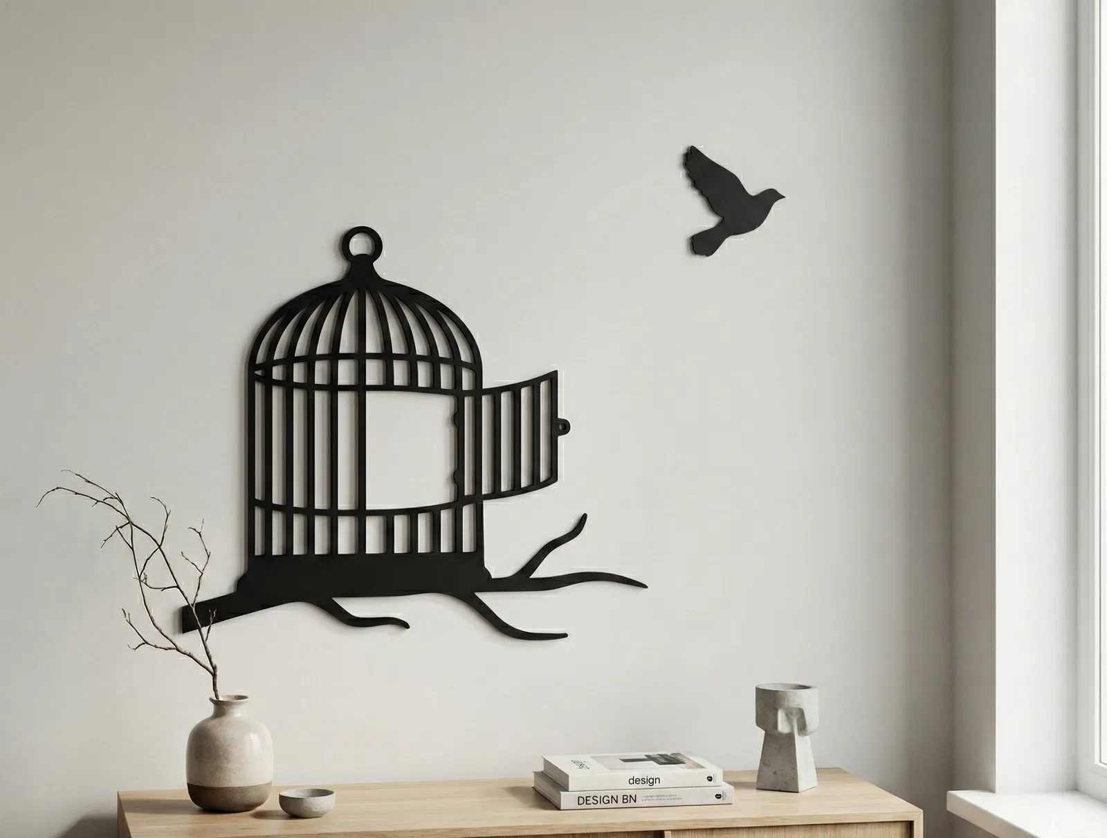 Một silhouette thơ và gọn gàng: chiếc lồng chim trên cành cây, kèm chú chim đang tung cánh bay. Món decor “đúng gu” cho không gian hiện đại, sống chậm và tinh tế.