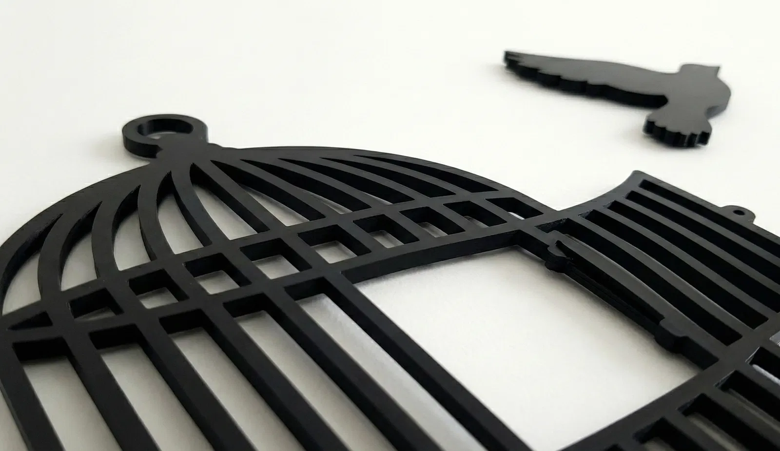 Silhouette lồng chim trên cành cây với chú chim đang bay—một mẫu wall art tối giản, hiện đại. Model tách 2 plates, dễ scale theo build plate, in không cần supports, hợp PLA (Matte Black) để treo decor phòng khách/phòng ngủ/văn phòng.