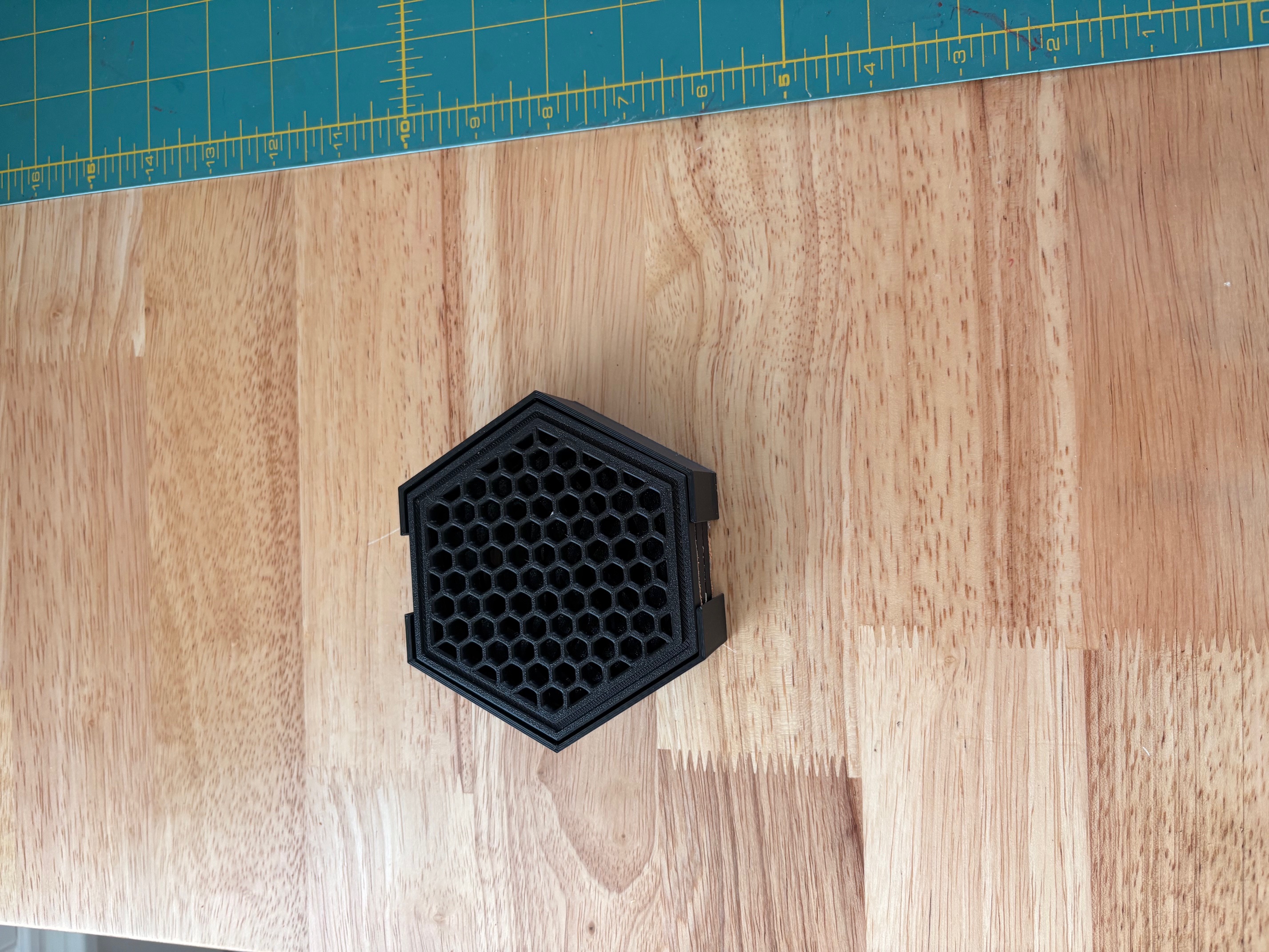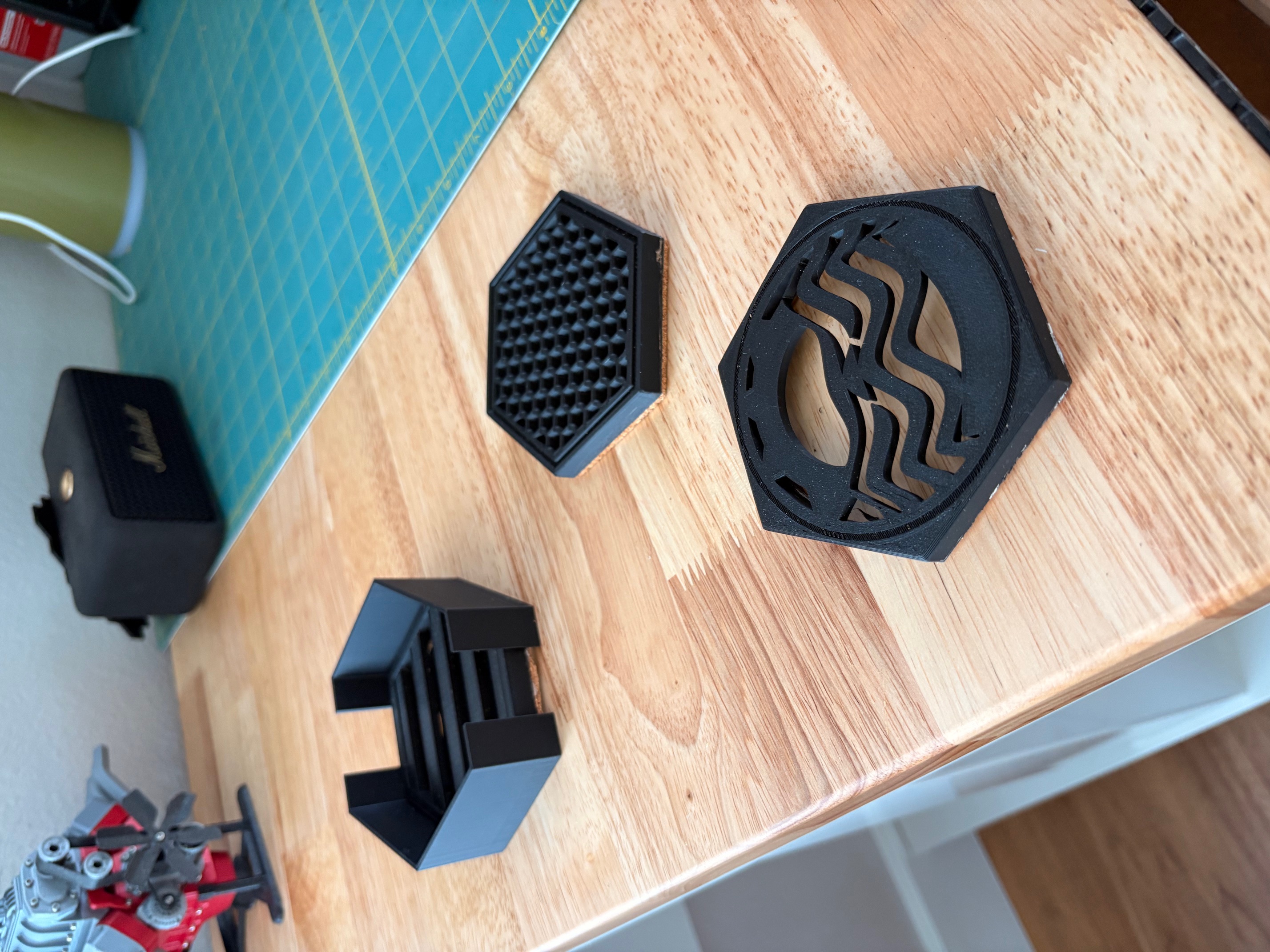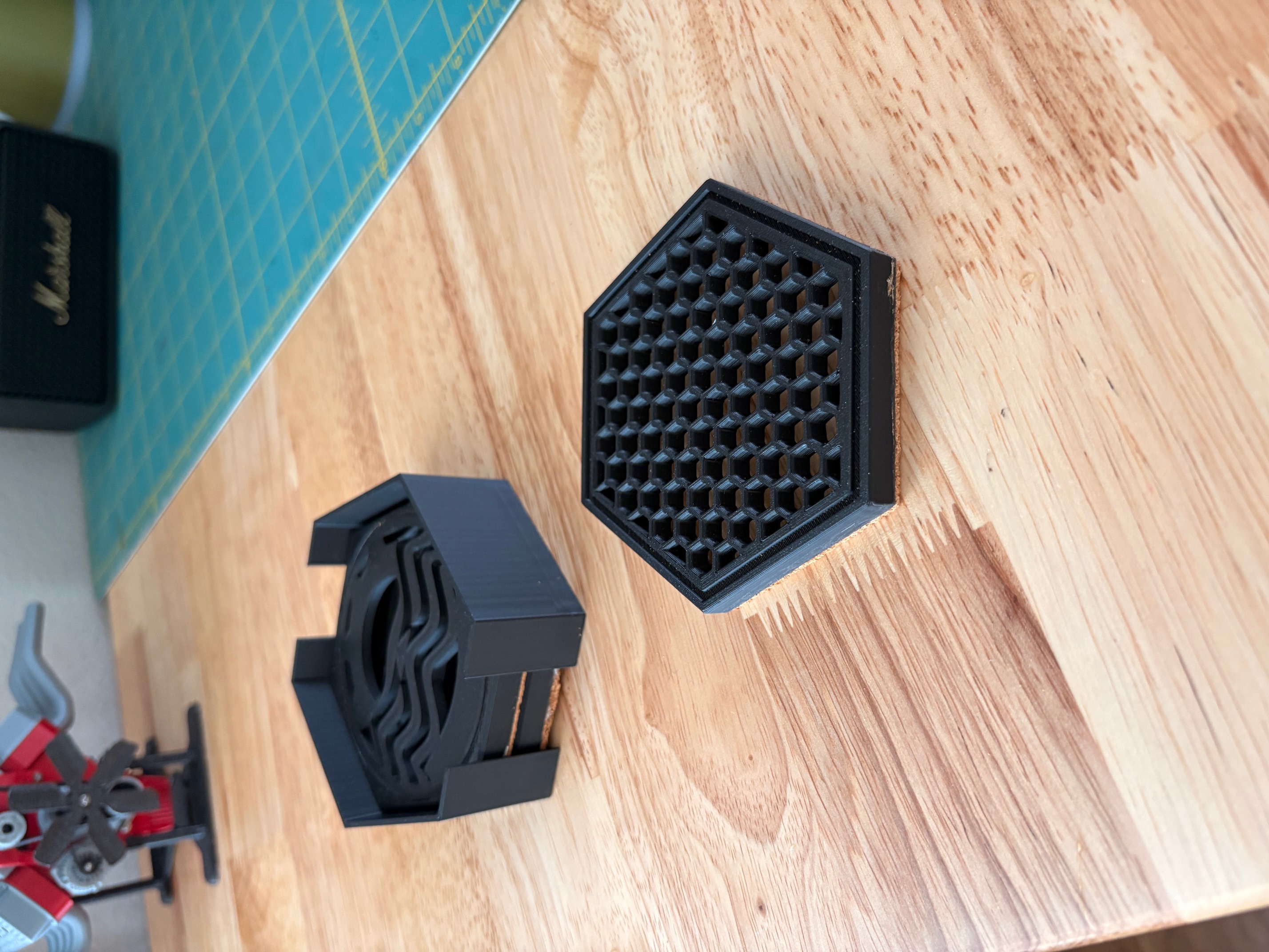 Bộ “Three design hexagon coaster set” gồm 3 lót ly lục giác với 3 kiểu: wavey, straight và hexagon, kèm khay đựng 3 cái. Dùng được có/không cork để bảo vệ bàn và mặt bếp. Gợi ý in: 0.15 mm, 15% infill.