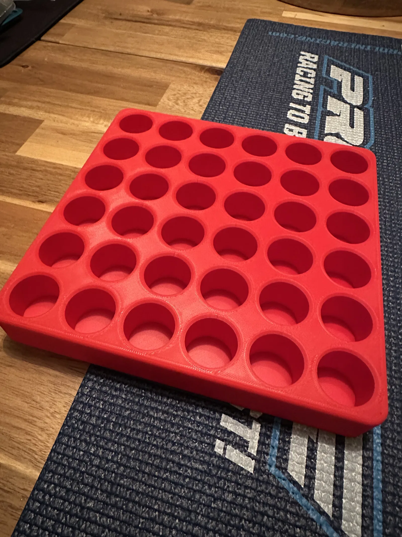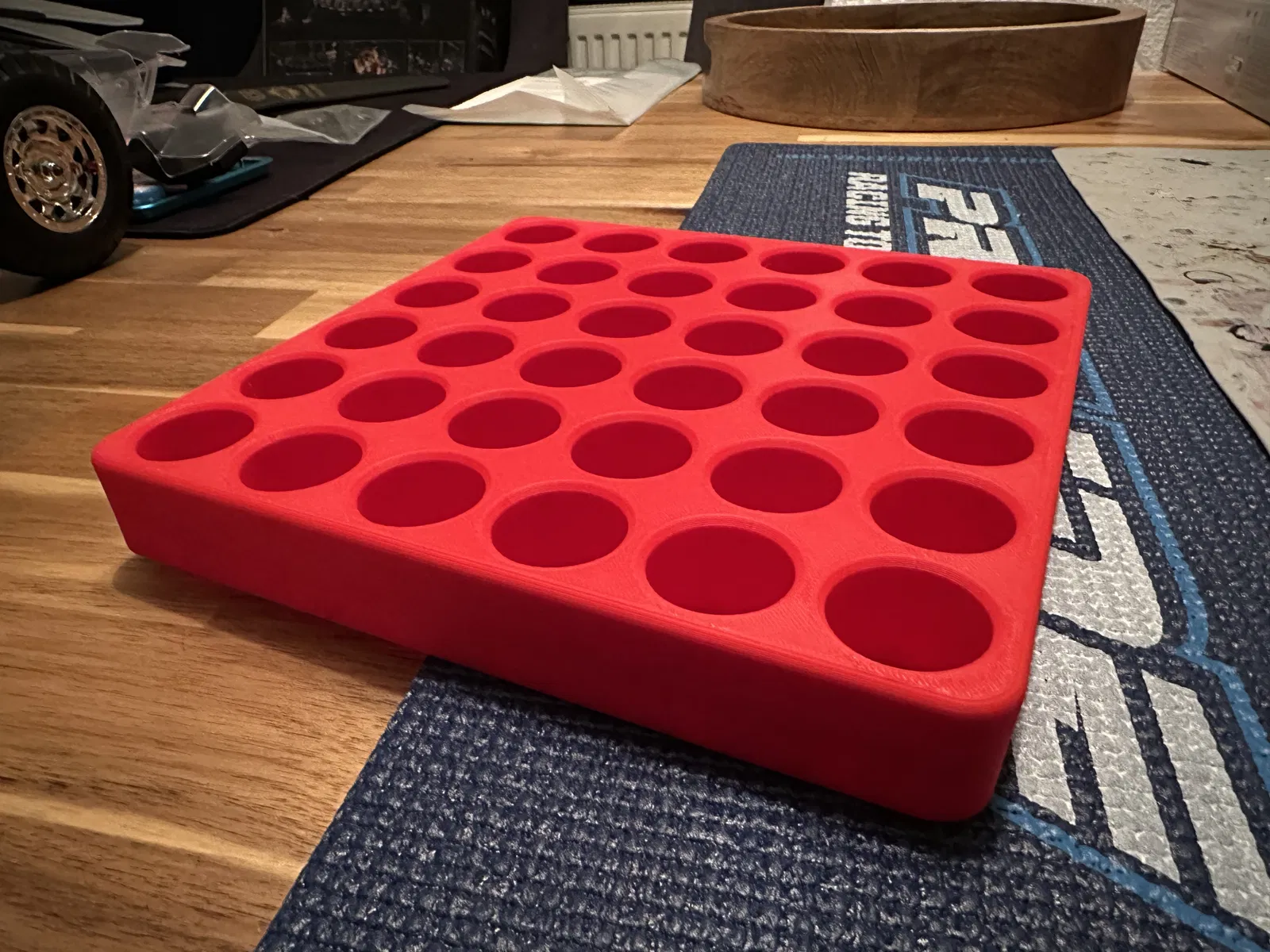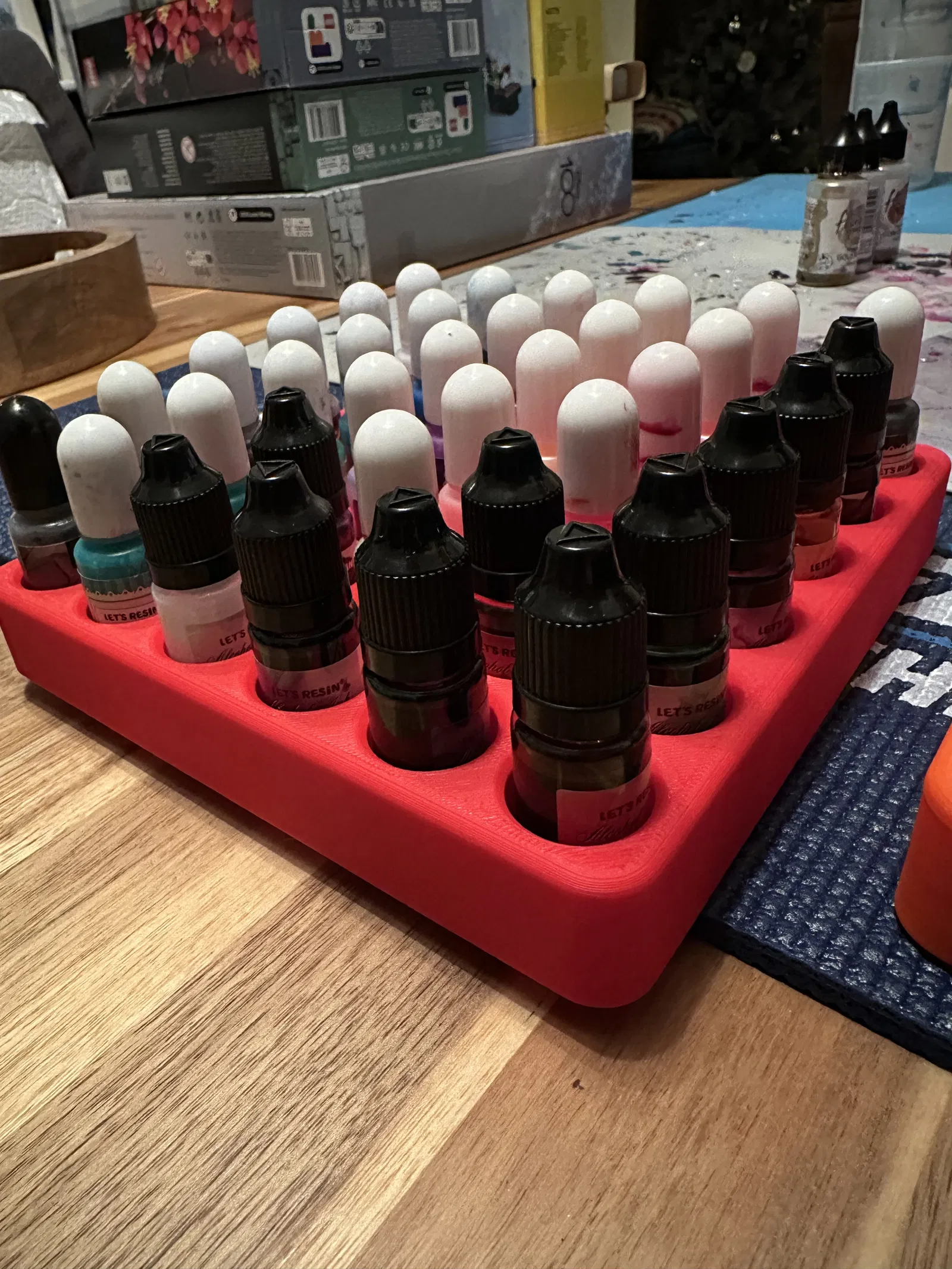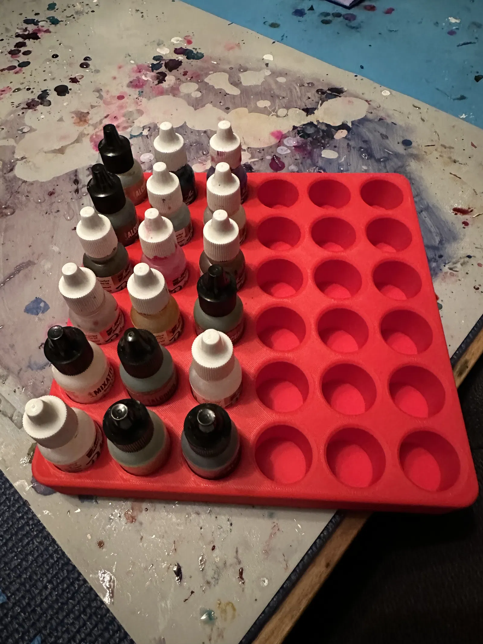 Khay/holder để cất gọn 36 chai alcohol ink loại 25mm theo chiều đứng, dễ thấy màu. In 0.25mm layer height, infill 10% với PLA hoặc PETG. Lỗ 26mm, sâu 24mm; có thêm bản 21mm.