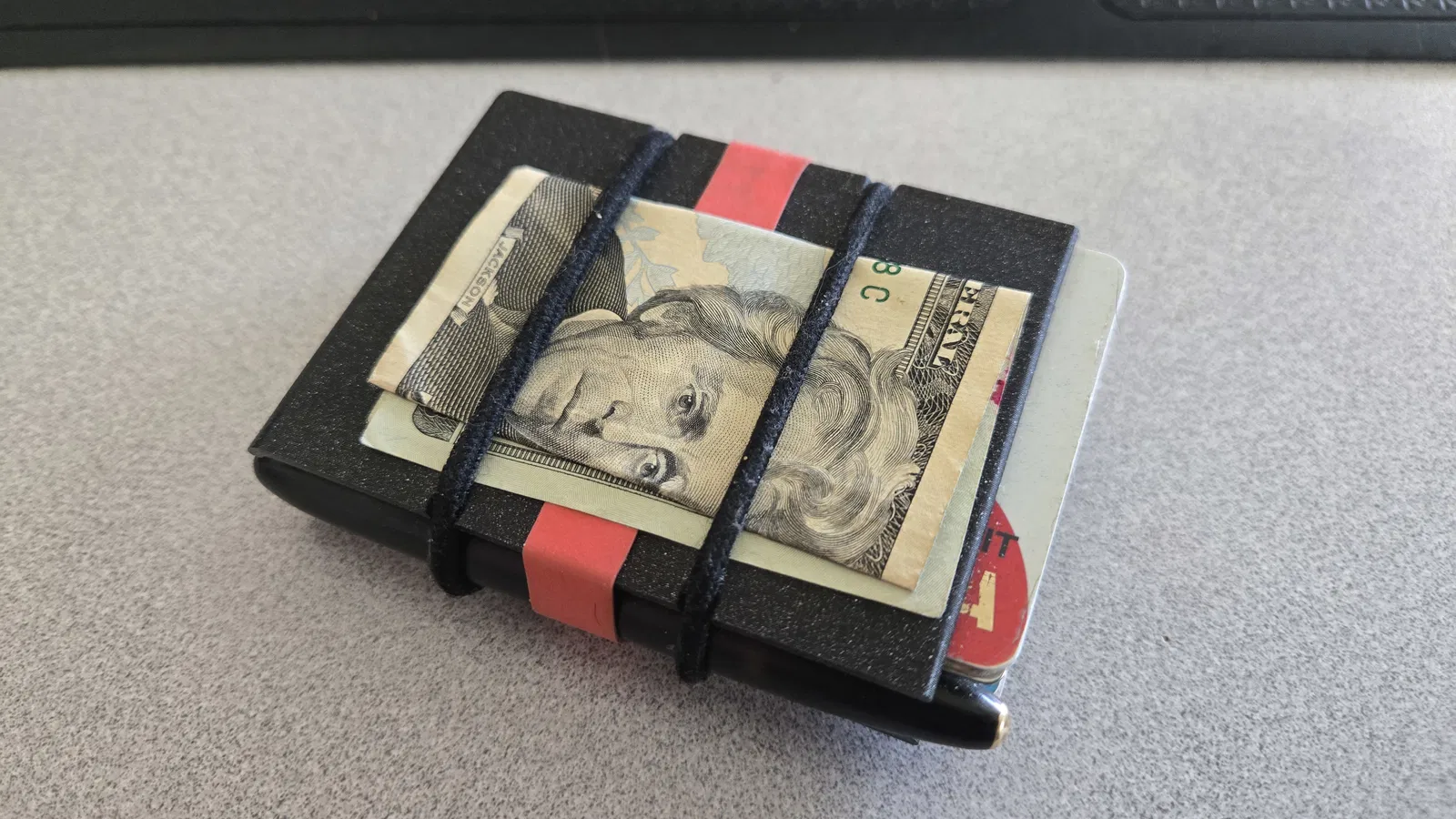 Các món được giữ bằng dây thun buộc tóc và/hoặc dây thun bản rộng. Tiền mặt có thể gấp lại và kẹp/đặt ở phía ngoài của vỏ.