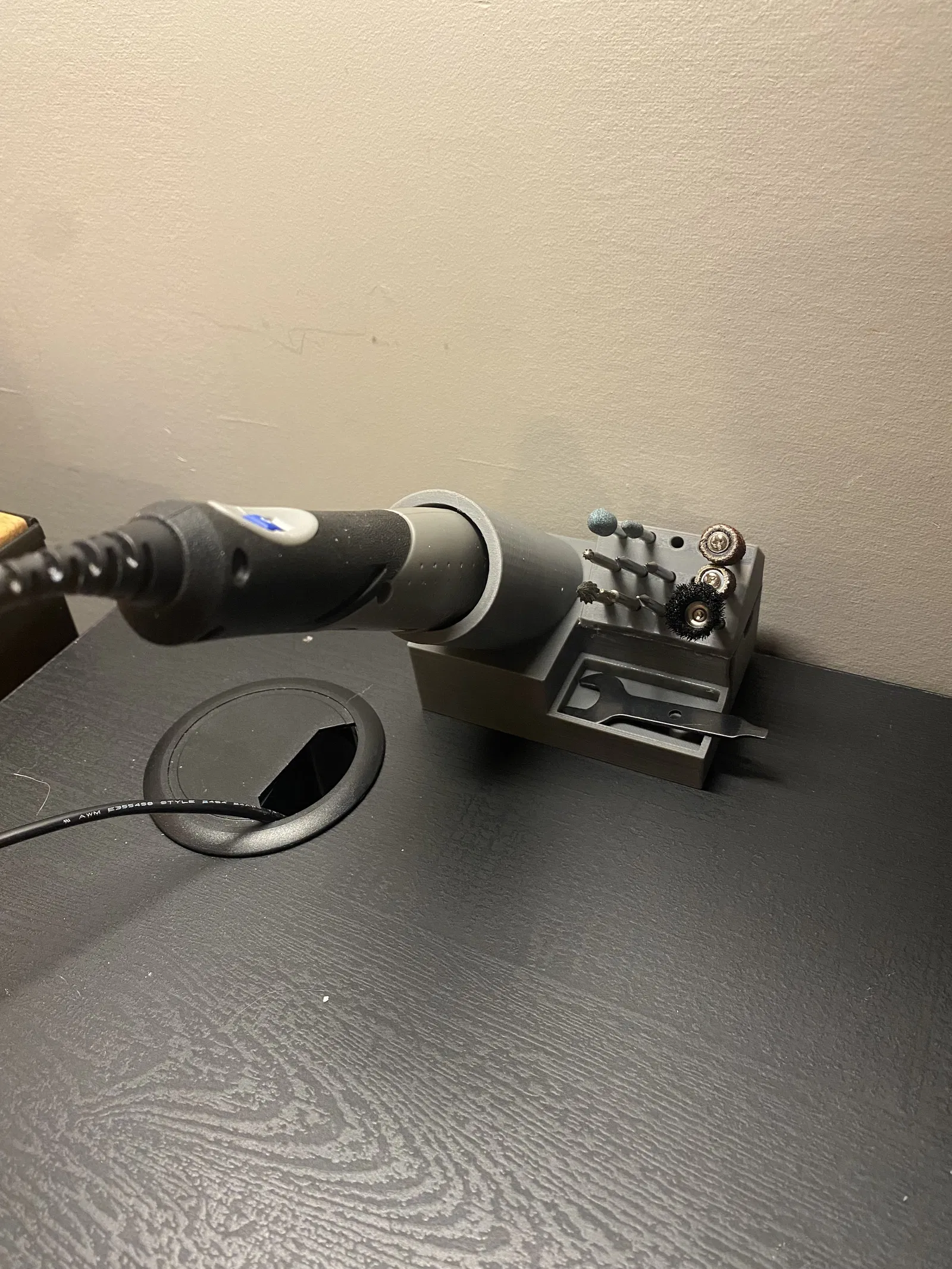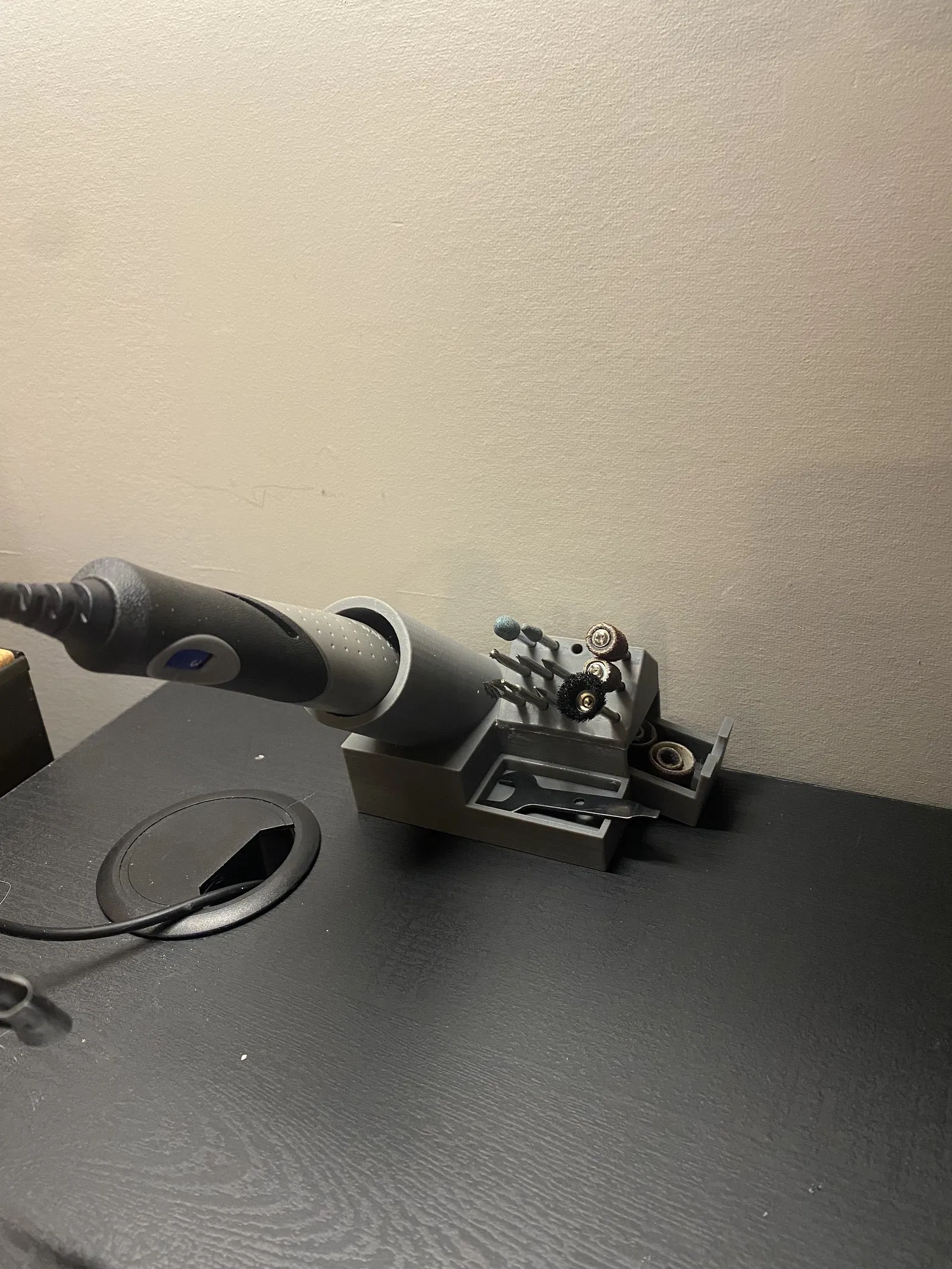 Giá đỡ và khay sắp xếp nhỏ gọn cho Dremel 2050, chứa được tối đa khoảng 15 món tool. Thiết kế in 3 phần riêng để tránh phải dùng supports; có thể cần băng keo hai mặt để cố định cho chắc.