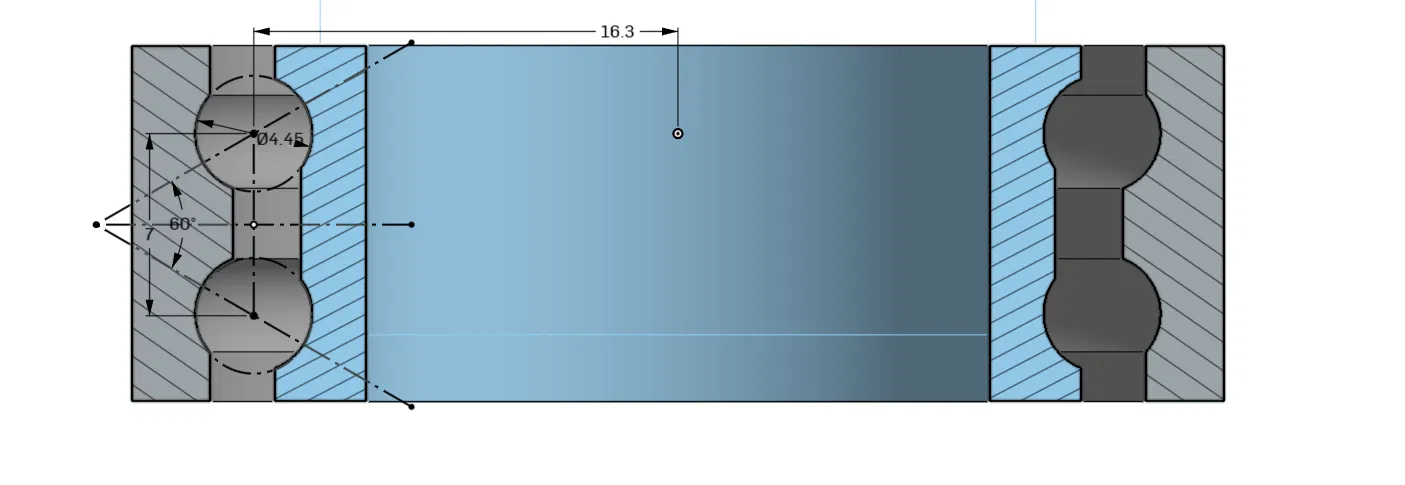 Mẫu double ball bearing easy print mình thiết kế chạy rất ổn. In cực dễ: cứ in phần inner race và outer race nằm phẳng trên bàn in, không cần supports. Nhớ canh chỉnh (dial in) độ chính xác kích thước của máy in cho chuẩn để ra kết quả tốt nhất. In xong hai phần race thì chỉ cần canh cho các vết lõm (indents) trên hai race thẳng hàng rồi bắt đầu bấm (snap) các viên BB vào. Khi BB đã snap vào và lấp đầy khoang, chúng sẽ không tự rớt ra nữa. Vậy là bạn có một cái bearing quay trơn, nhẹ.