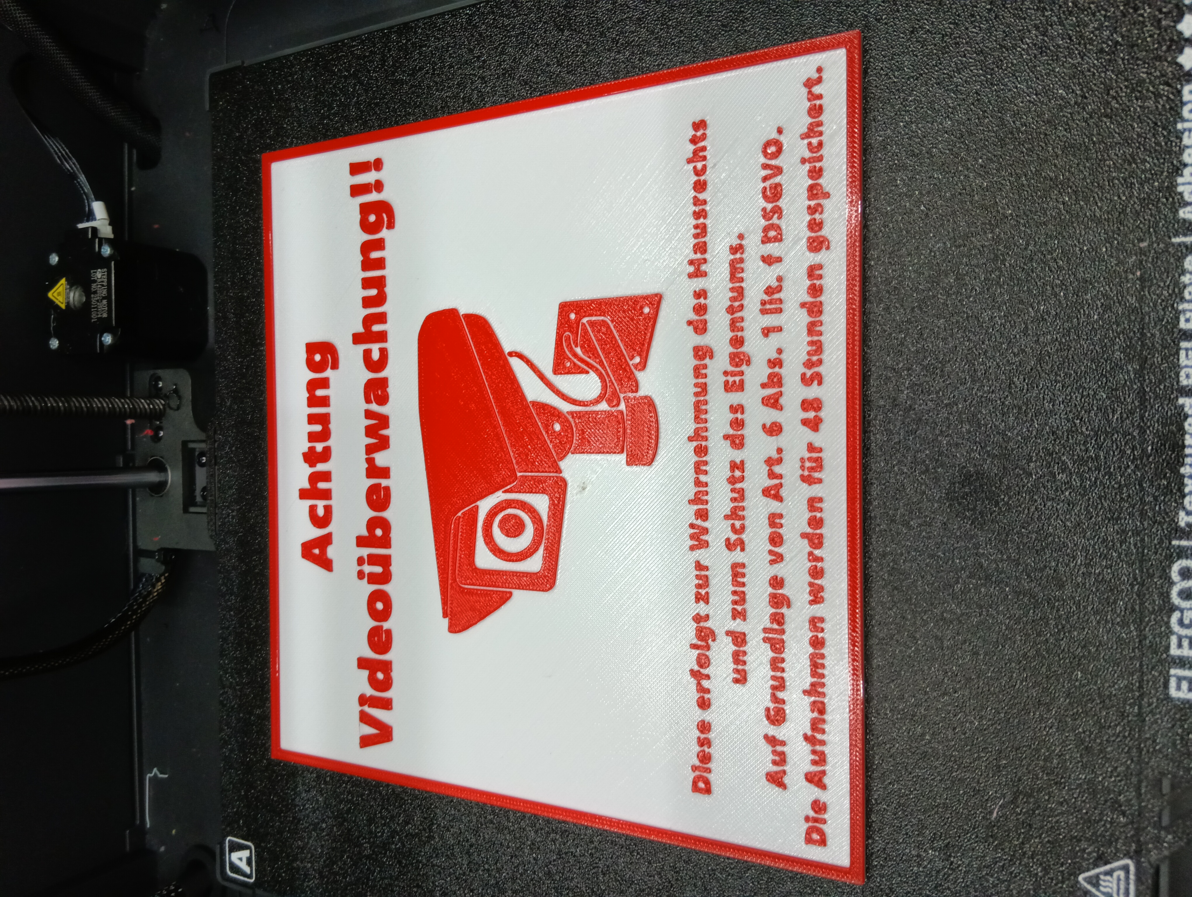 Mẫu bảng dành cho khu đất tư nhân, dùng để thông báo đang có video surveillance và dữ liệu được ghi/ghi lại trong 48 giờ. Có kèm nội dung nhắc theo DSGVO. Phù hợp in 3D bằng PETG.