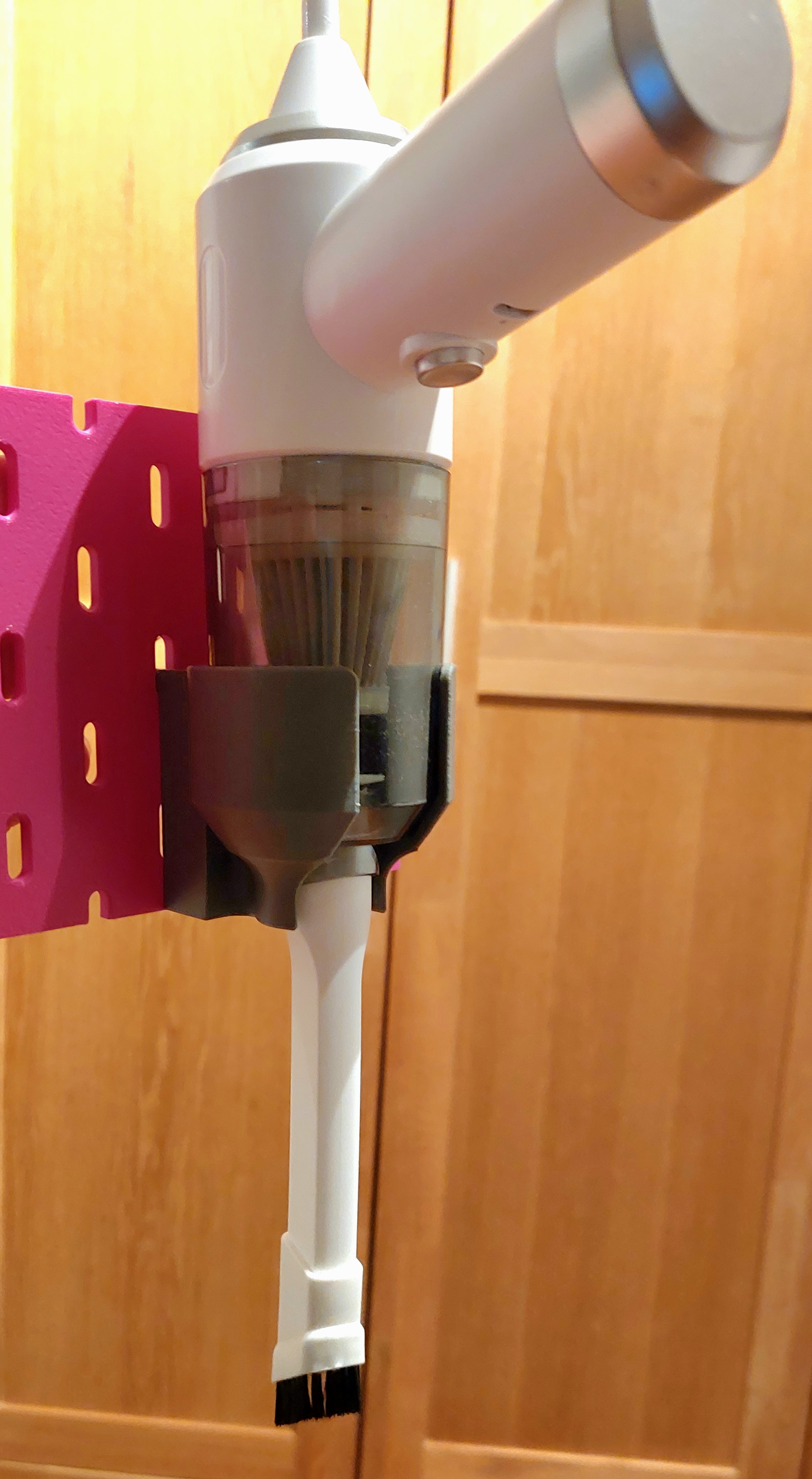 Móc treo dành cho mini máy hút bụi (Xiaomi, Strong, v.v.) gắn lên bảng lỗ IKEA SKADIS. Kích thước đường kính trên 54 mm, dưới 27 mm; khuyến nghị tree supports cho 3 móc và infill Gyroid.