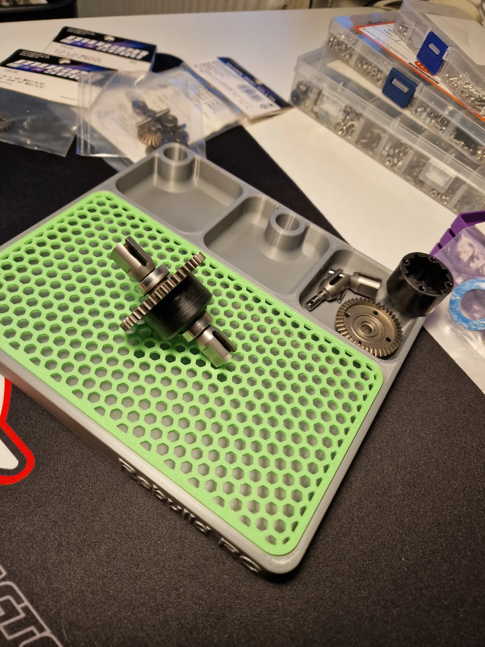 Khay custom để rebuild và bảo dưỡng differential cho RC. Thiết kế làm trong Fusion 360, in 3D tiện lợi. Có thêm lỗ thoát nhỏ giúp vệ sinh nhanh và xả gear oil dễ dàng hơn.