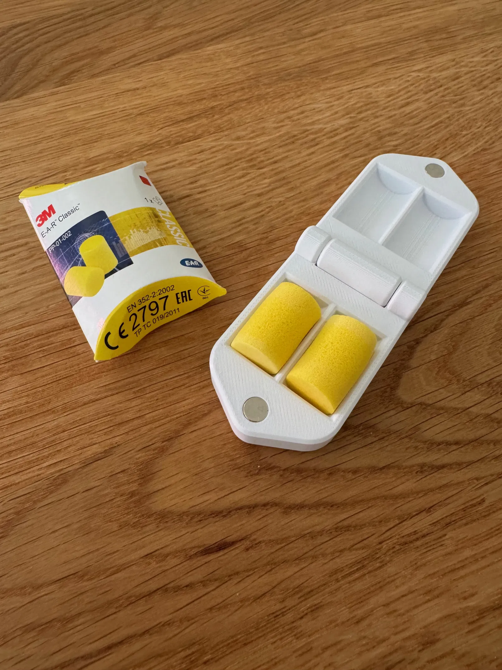 Hộp đựng nhỏ gọn cho nút tai 3M Classic, thiết kế print in place và không cần supports. Có 2 phiên bản dung sai; bản tight chạy tốt trên Bambulab X1 Carbon (nozzle 0.4, layer 0.16). Cần 2 nam châm 3x6 dạng press-fit.