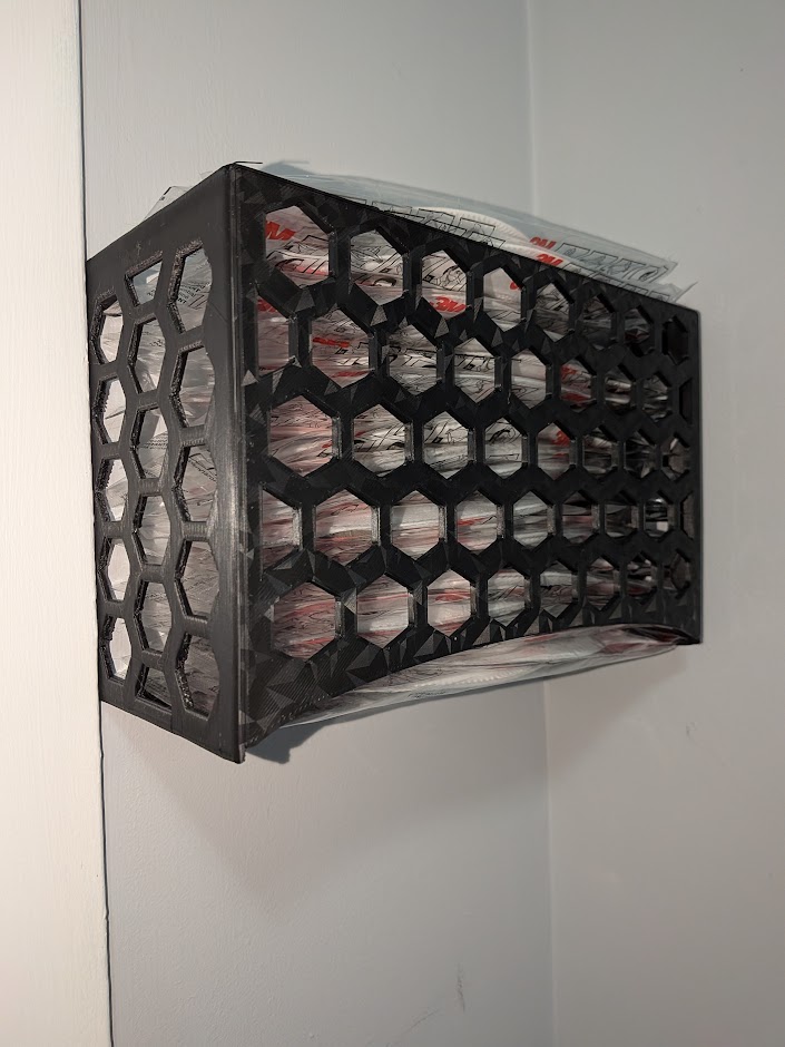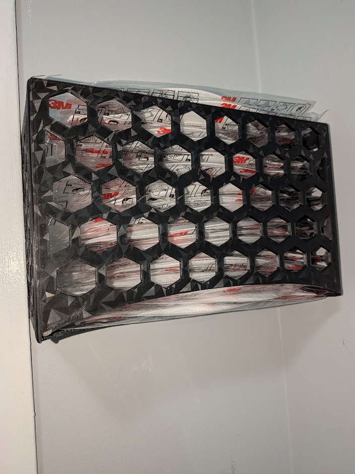 Khay treo tường (wall mounted) để đựng khẩu trang/respirator loại trifold 3M Aura, giúp sắp xếp gọn gàng và lấy nhanh khi ra ngoài. In layer height 0.2, không cần supports; có thể dán băng keo 2 mặt hoặc bắt vít/đinh.