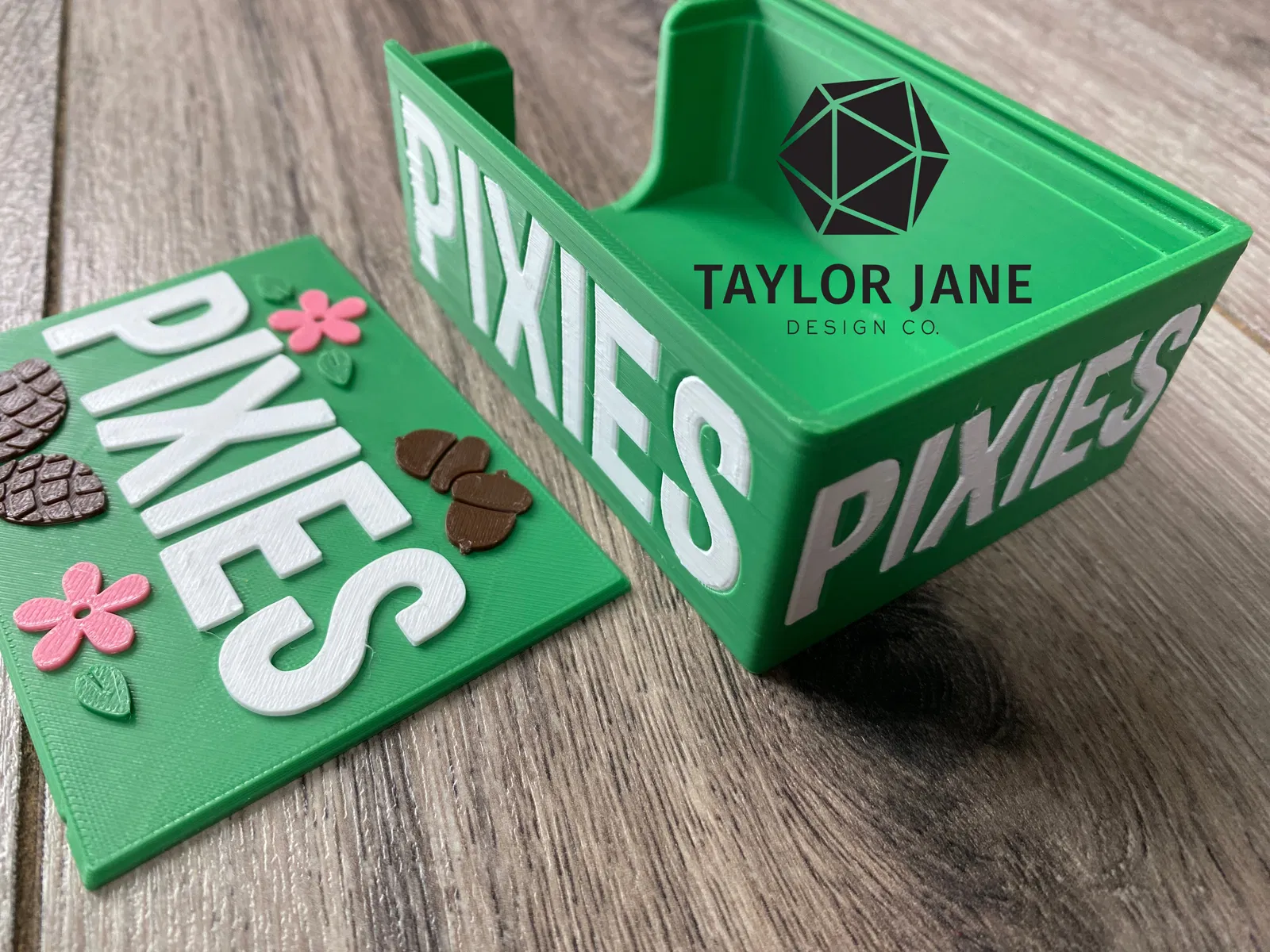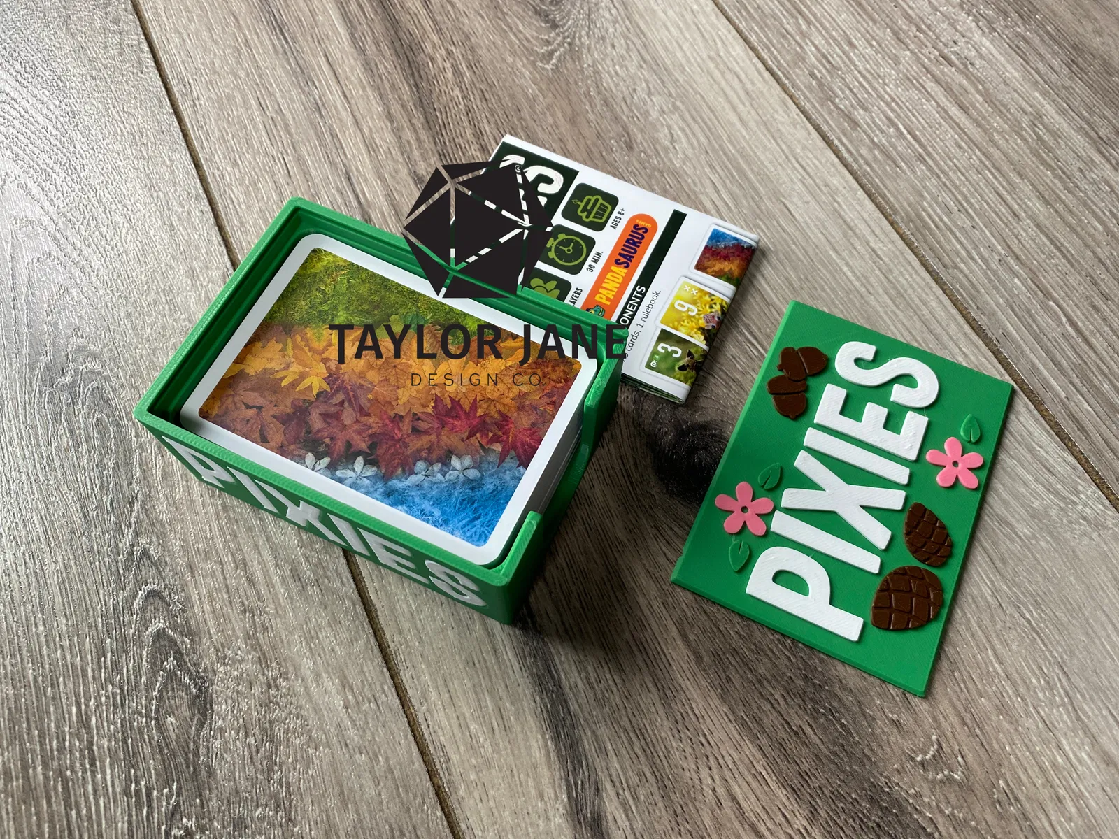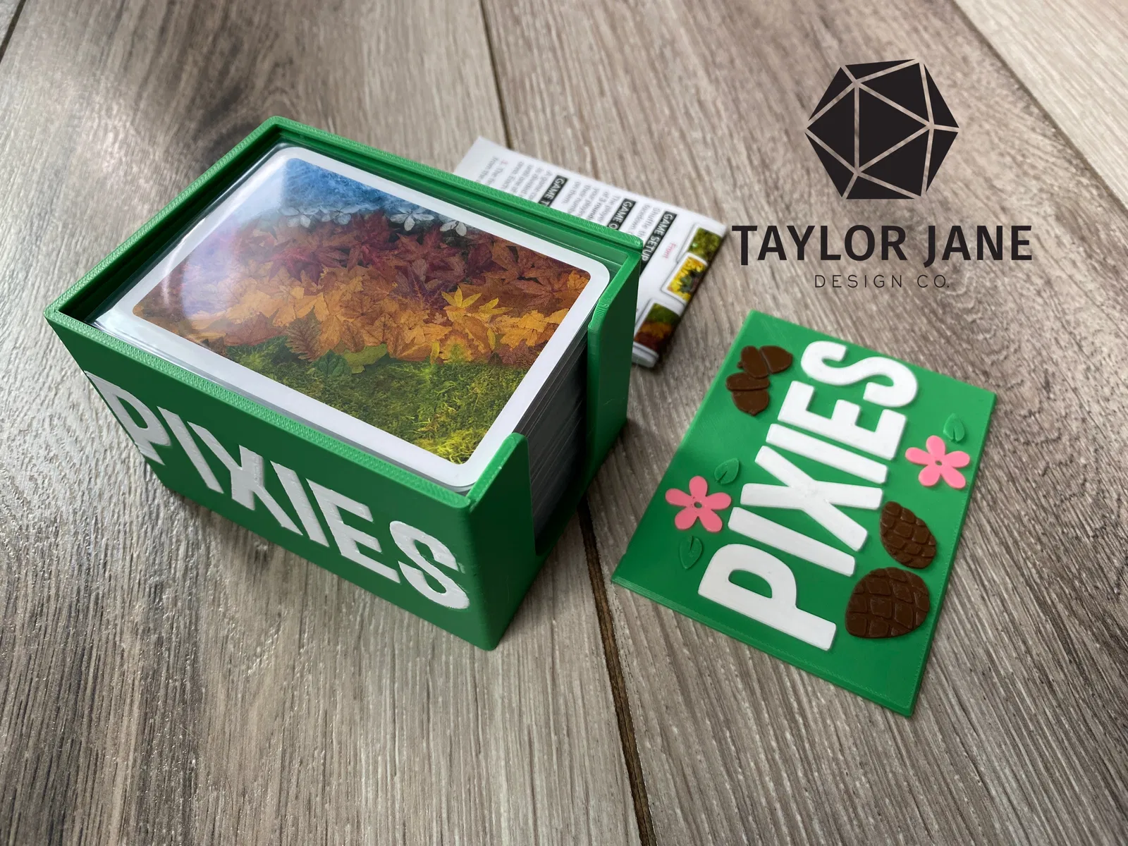 Hộp du lịch gọn cho Pixies, tối ưu để dựng đứng; có bản dùng cho bài có sleeve và không sleeve. Chứa vừa base game lẫn Flower Power expansion, nắp snap có notch canh chuẩn, hỗ trợ in multicolor/đổi màu theo layer.