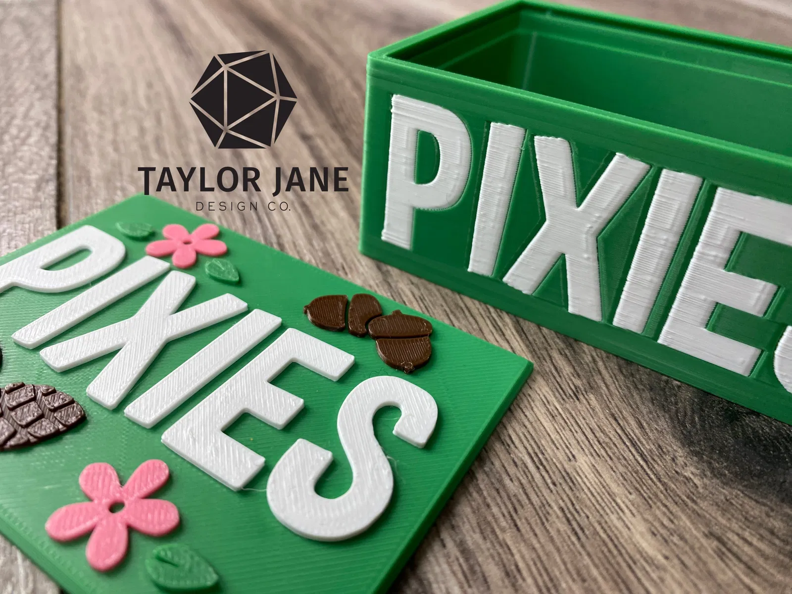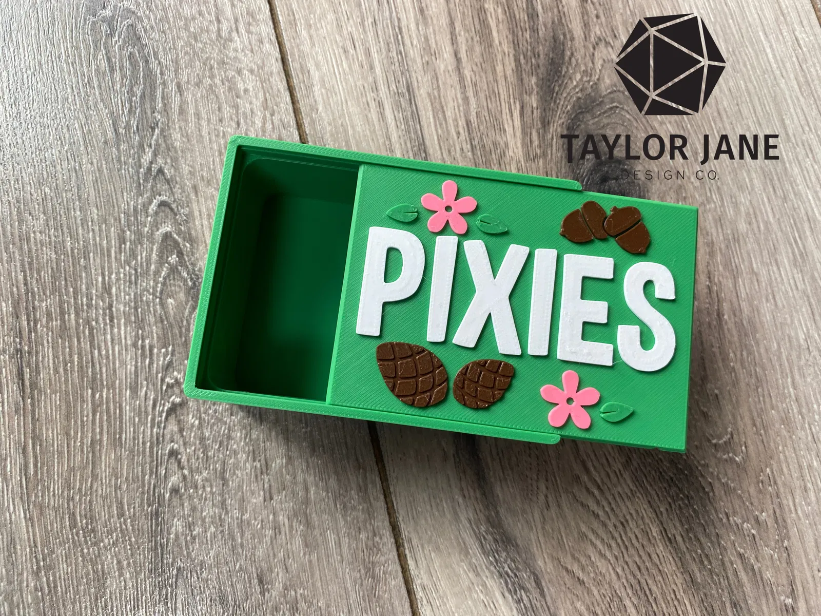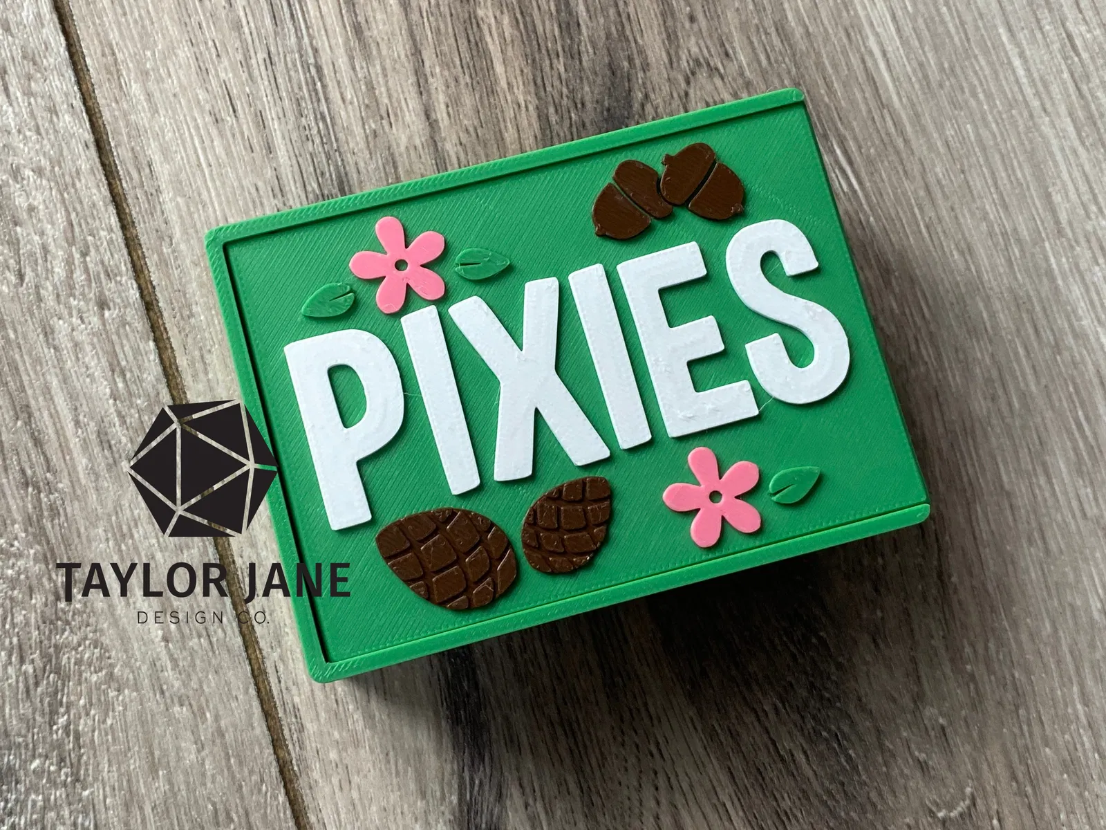 Hộp du lịch gọn cho Pixies, tối ưu để dựng đứng; có bản dùng cho bài có sleeve và không sleeve. Chứa vừa base game lẫn Flower Power expansion, nắp snap có notch canh chuẩn, hỗ trợ in multicolor/đổi màu theo layer.