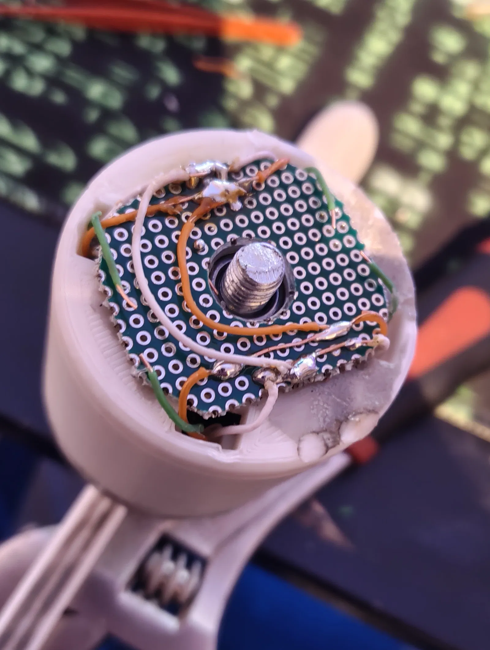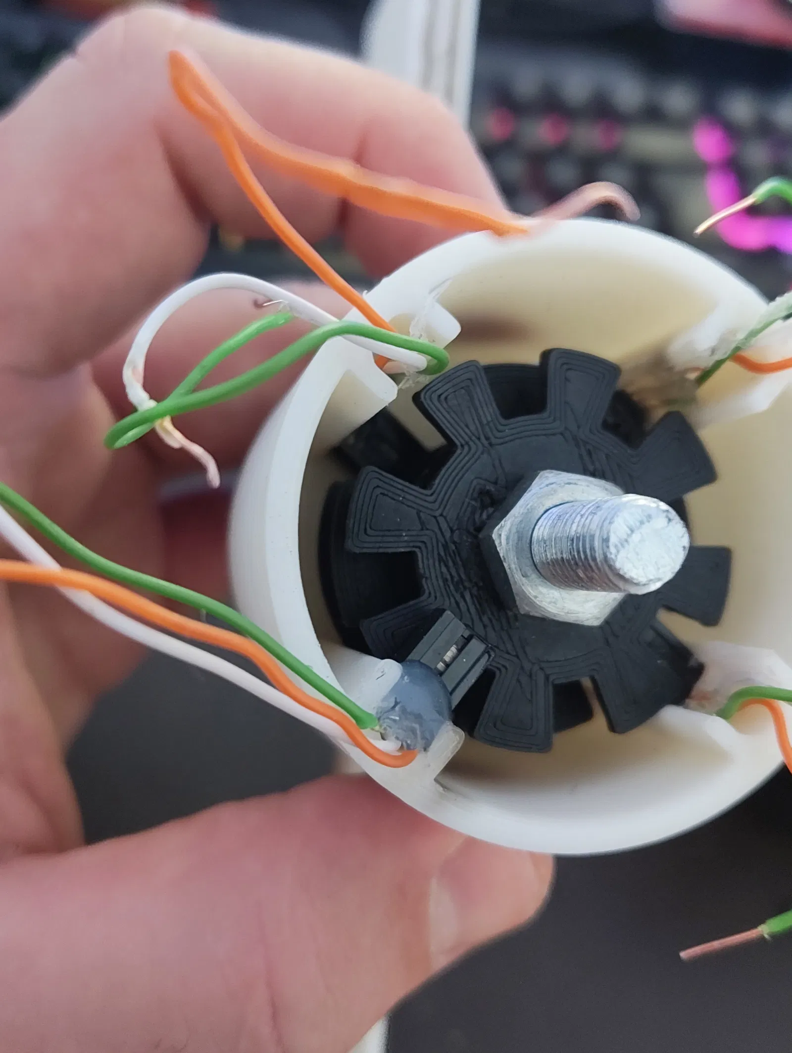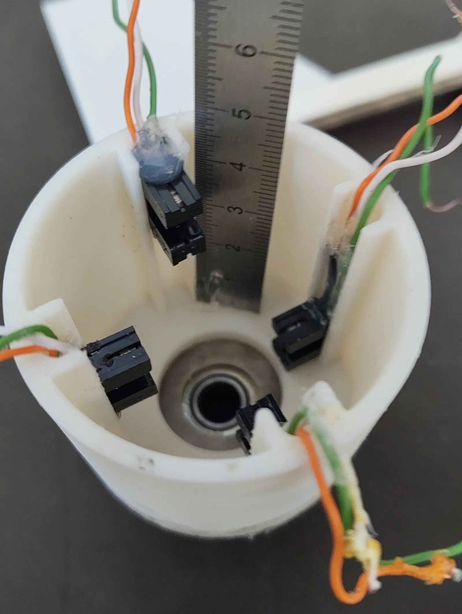 Cố định các optical couplers bên trong sensor housing bằng keo nến (hot glue). Vị trí theo chiều dọc phải chỉnh theo chiều cao của đĩa encoder.