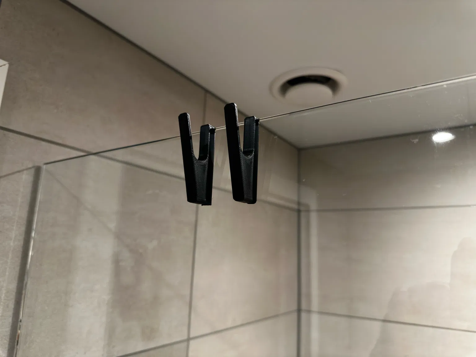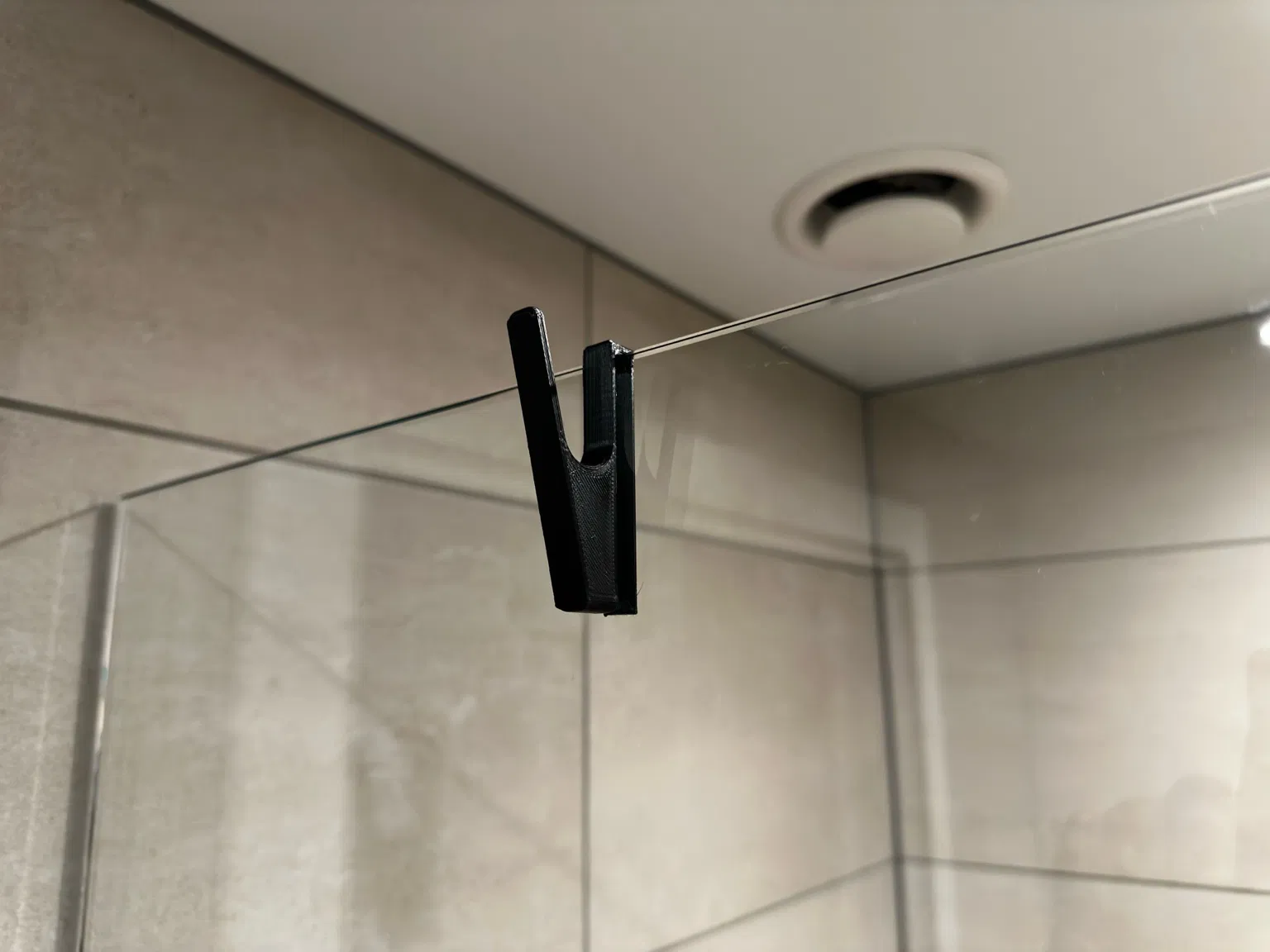 Móc treo tối giản cho cửa kính phòng tắm dày 8mm. Trượt lên mép kính, giữ chắc nhờ trọng lượng, không cần khoan hay dùng keo. Dễ in với PLA/PETG/ASA, không cần support; có kèm file STEP để chỉnh.