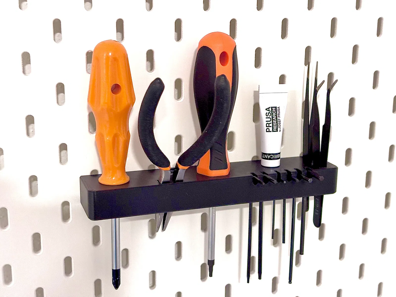 Giá đỡ dụng cụ dành cho bộ kit Prusa Core One, tương thích với bảng treo IKEA SKADIS. Thiết kế giúp sắp xếp gọn tua vít, kìm mũi nhọn, nhíp, dầu bôi trơn Prusa và các bộ key Torx/Allen.
