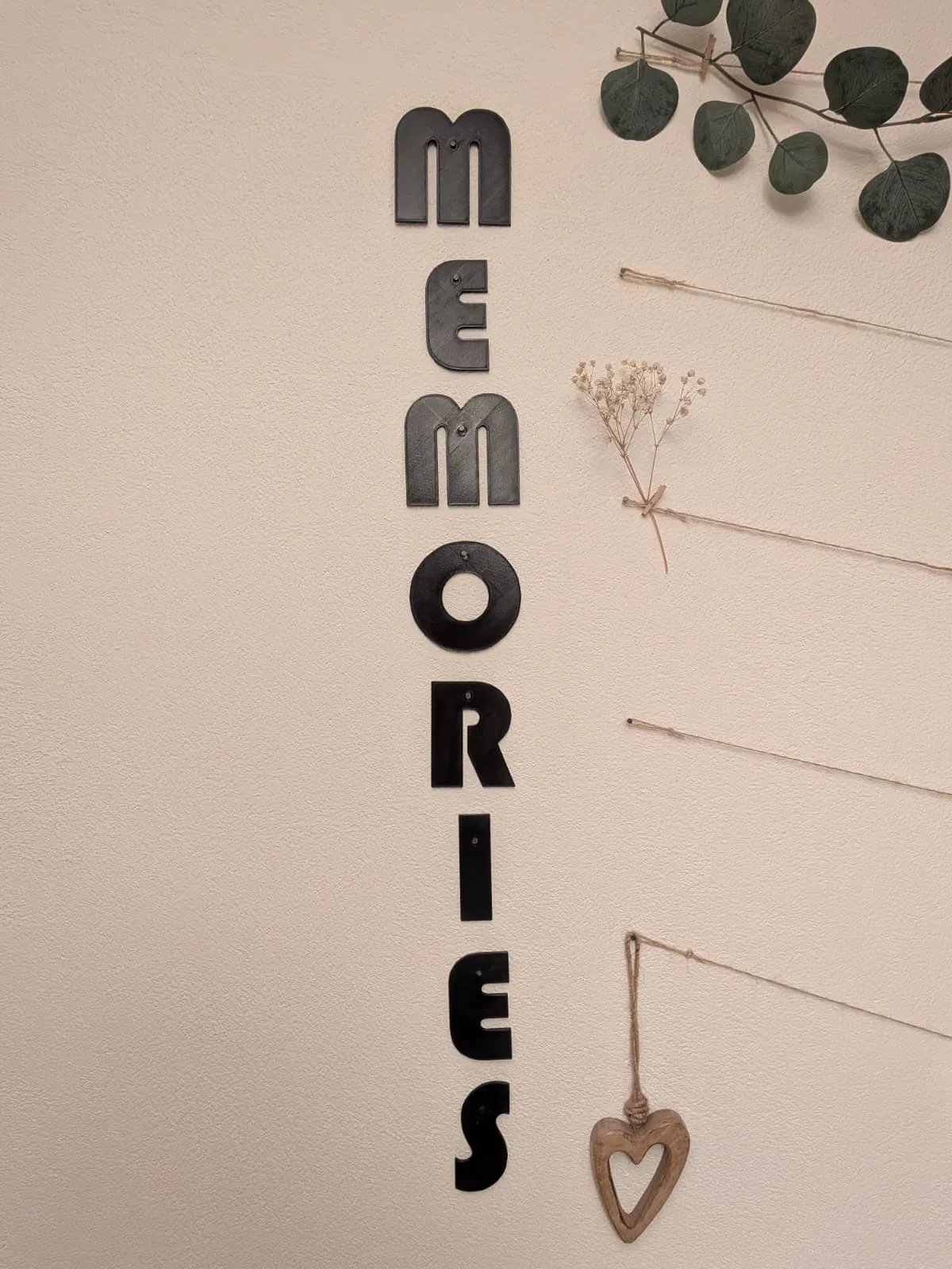 Bộ chữ “Memories” dùng làm trang trí tường cho ảnh kỷ niệm. Mỗi chữ có lỗ nhỏ để đóng đinh lên tường, rất phù hợp làm photo collage/khung ảnh treo tường. Gợi ý: Infill 15%, Material: Any.
