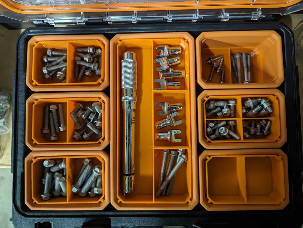 Bộ cup lồng cho RIDGID 2.0 Pro Gear System 22" organizer, kèm khay chia ngăn 2/4/6+ phần để sắp xếp đồ nhỏ mà vẫn còn không gian bên dưới. Thiết kế “tai” hạn chế cần support, dễ tùy biến bằng Tinkercad.