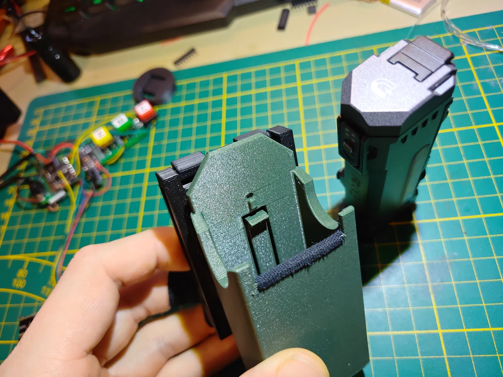 Dán một miếng mút cao su hình vuông nhỏ lên cơ chế kẹp, ở giữa phần holder chính và belt mount (xem hình). Dán thêm một dải băng keo vải ở mặt trong phía trước của vỏ để fit chặt hơn.